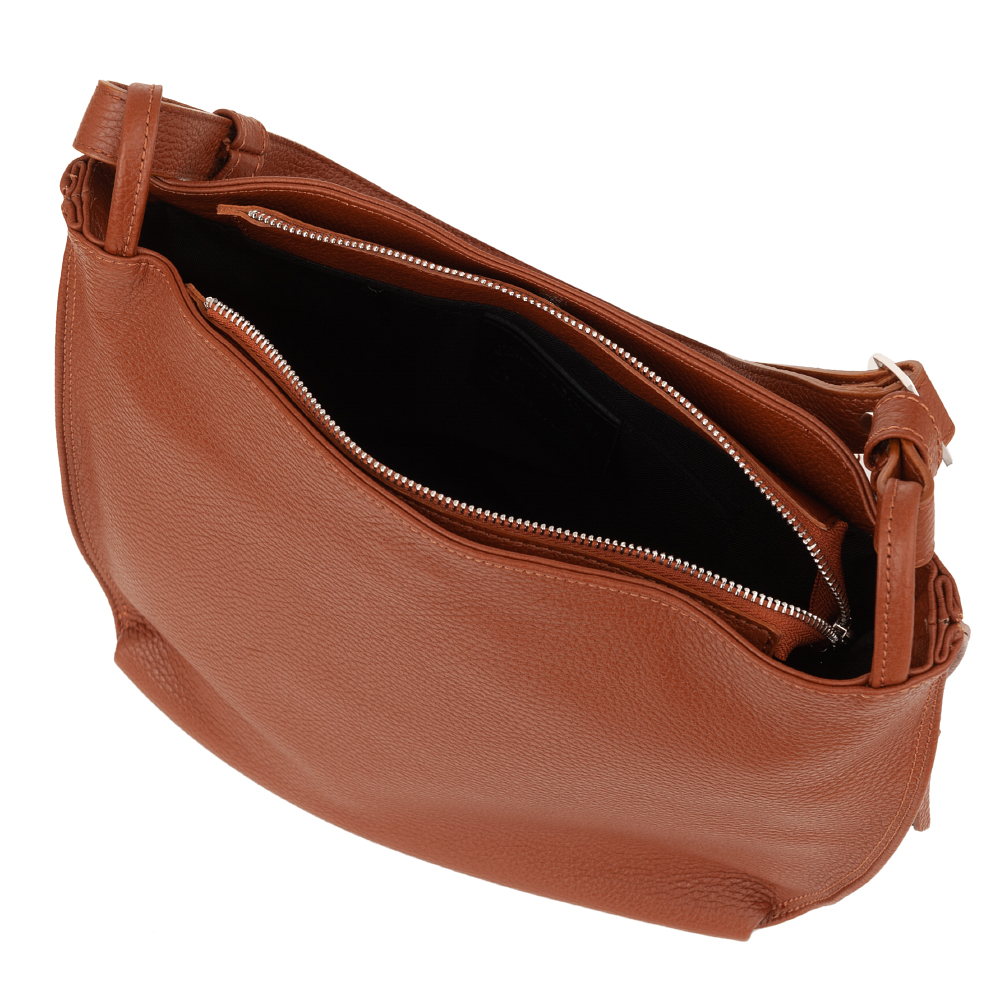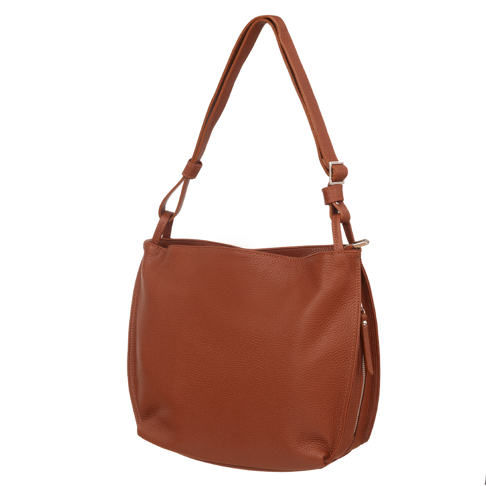 Vera Pelle - Włoska pojemna miękka skórzana torebka worek wykonana z wysokogatunkowej naturalnej skóry dolaro. Zamykana od góry na zamek na całej szerokości. Torebka trzykomorowa, na środku duża komora z kieszonką na zamek + kieszonka na telefon + kieszeń na klucze, drobiazgi. Wnętrze wykończone trwałą, materiałową podszewką. Boczne komory zamykane na magnes. Kieszonki po obu bokach torebki. Miękkie ucho umożliwia wygodne noszenie na ramieniu lub przez ramię jako listonoszka. Metalowe elementy wykończenia w kolorze srebrnym.