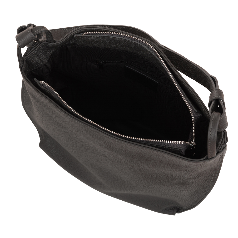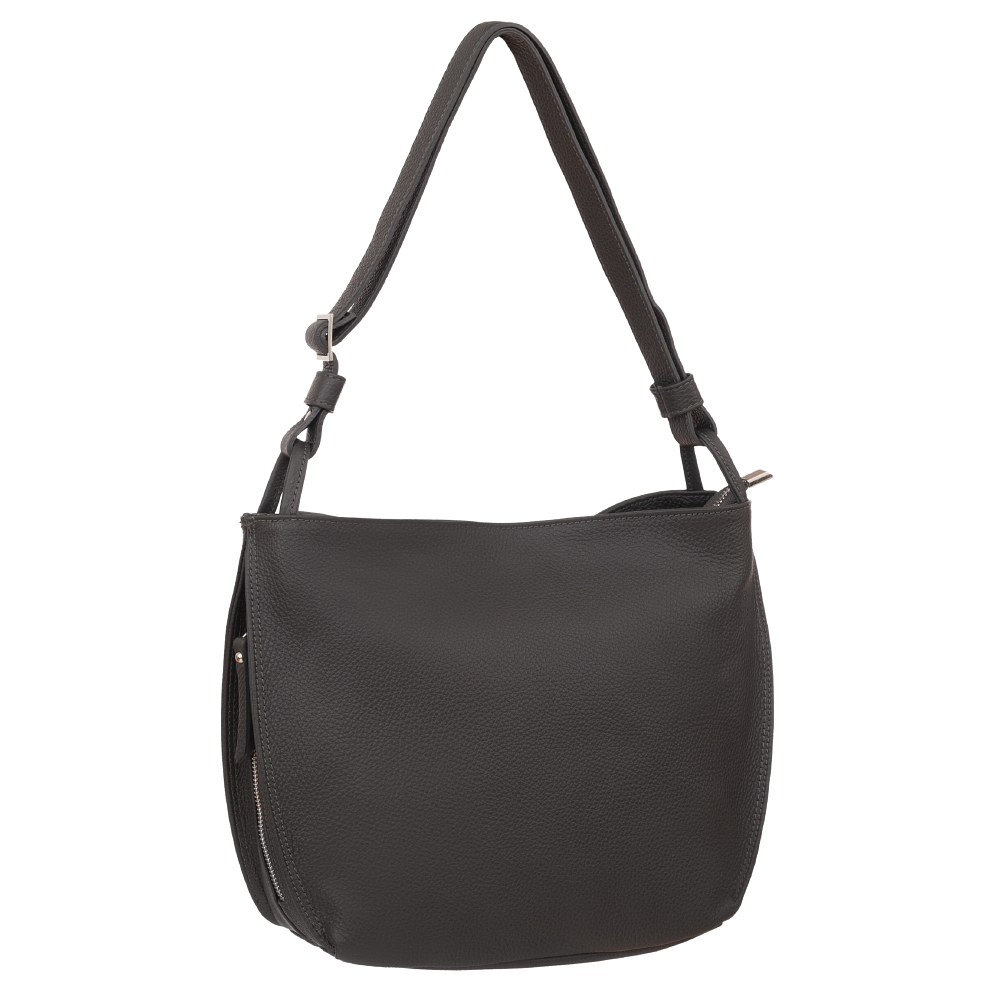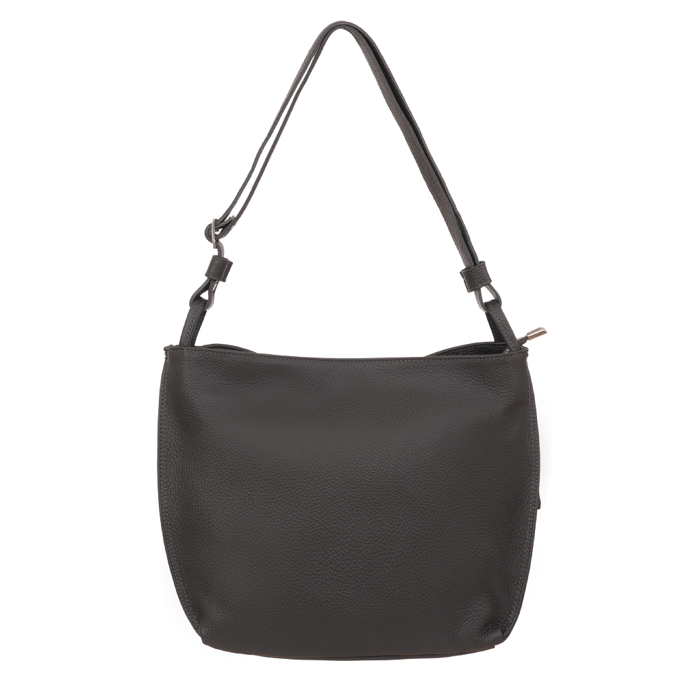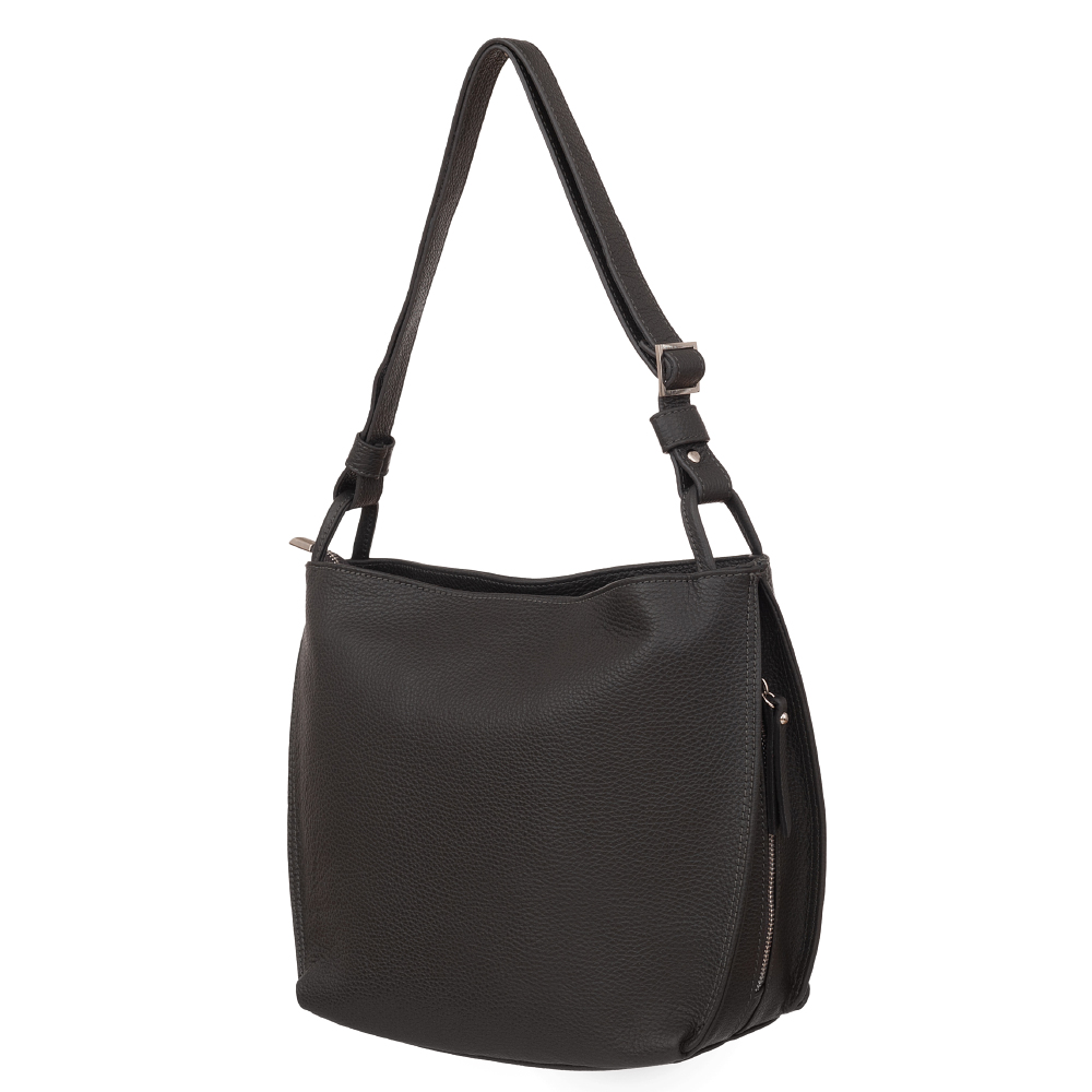 Vera Pelle - Włoska pojemna miękka skórzana torebka worek wykonana z wysokogatunkowej naturalnej skóry dolaro. Zamykana od góry na zamek na całej szerokości. Torebka trzykomorowa, na środku duża komora z kieszonką na zamek + kieszonka na telefon + kieszeń na klucze, drobiazgi. Wnętrze wykończone trwałą, materiałową podszewką. Boczne komory zamykane na magnes. Kieszonki po obu bokach torebki. Miękkie ucho umożliwia wygodne noszenie na ramieniu lub przez ramię jako listonoszka. Metalowe elementy wykończenia w kolorze srebrnym.