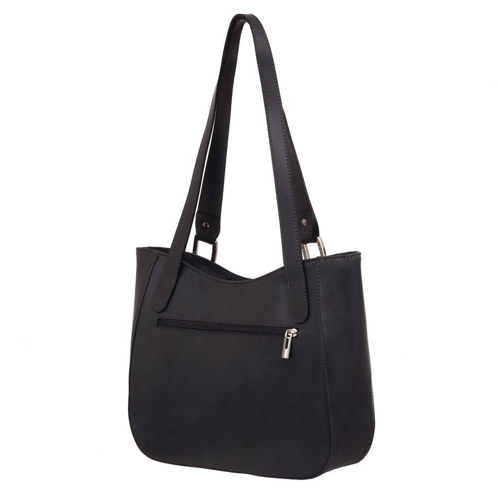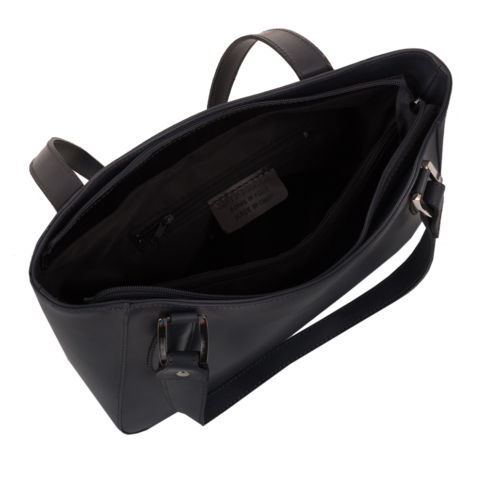 Włoska klasyczna skórzana torebka wykonana z wysokogatunkowej naturalnej gładkiej skóry licowej. Zamykana z góry na suwak. Torebka jednokomorowa przedzieloną dużą kieszenią na suwak. Wewnątrz jedna kieszonka na zamek oraz jedna na telefon. Wnętrze wykończone trwałą podszewką. Dodatkowo z tyłu torebki kieszonka na suwak. Torebka od spodu usztywniona. Mieści format A4 bez zasuwania zamka. Elementy wykończenia w kolorze srebrnym.