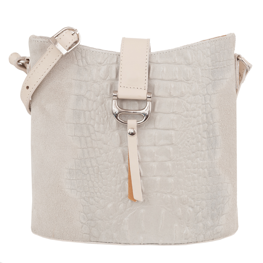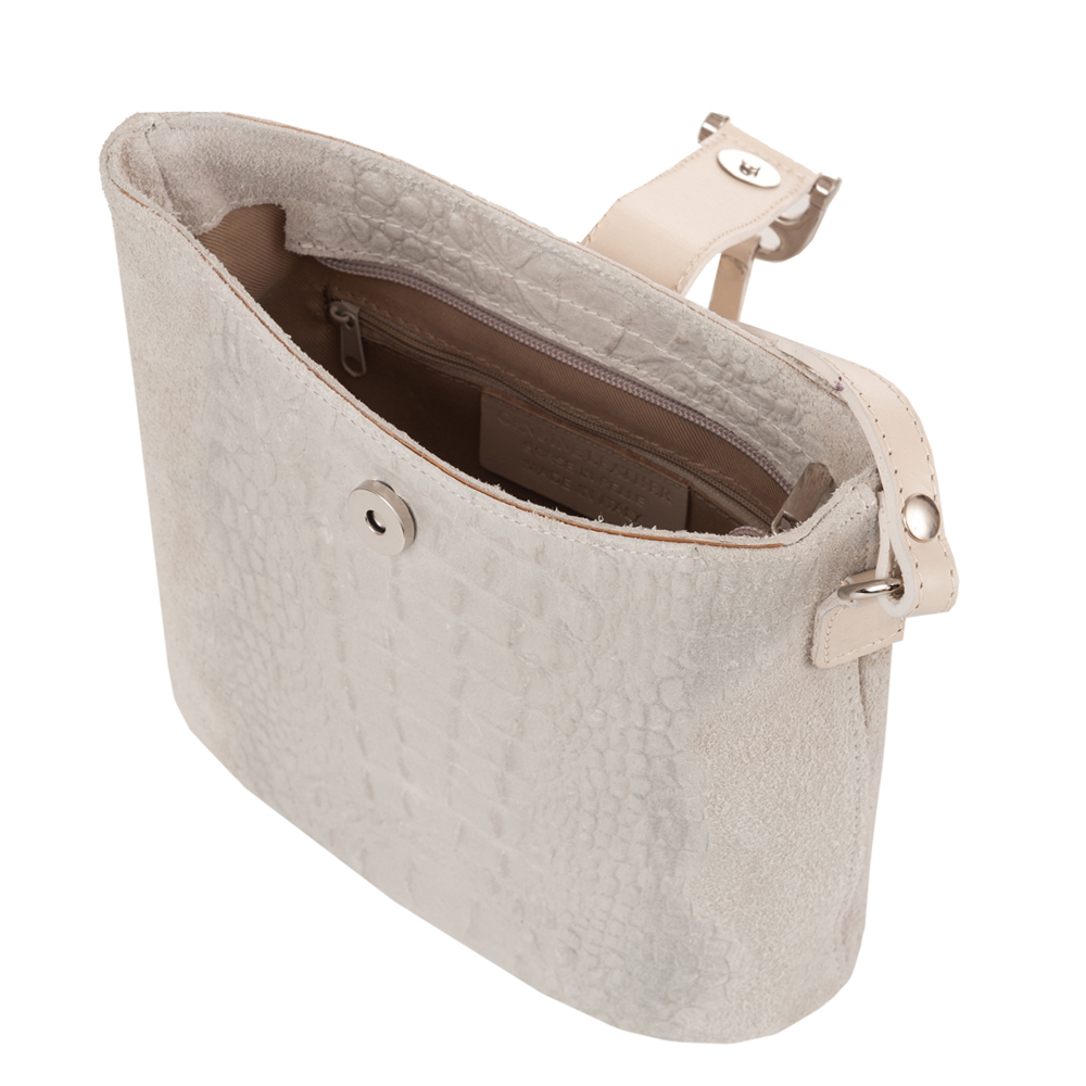 Włoska skórzana listonoszka wykonana z wysokogatunkowej naturalnej skóry licowej z motywem krokodyla łączonej z zamszem naturalnym. Zamykana z góry na suwak + klapka na magnes. Spód torebki usztywniony. Torebka jednokomorowa, wewnątrz jedna kieszonka na zamek oraz jedna na telefon. Wnętrze wykończone trwałą podszewką. Z tyłu kieszonka na suwak. Długi, regulowany pasek umożliwia wygodne noszenie na ramieniu.