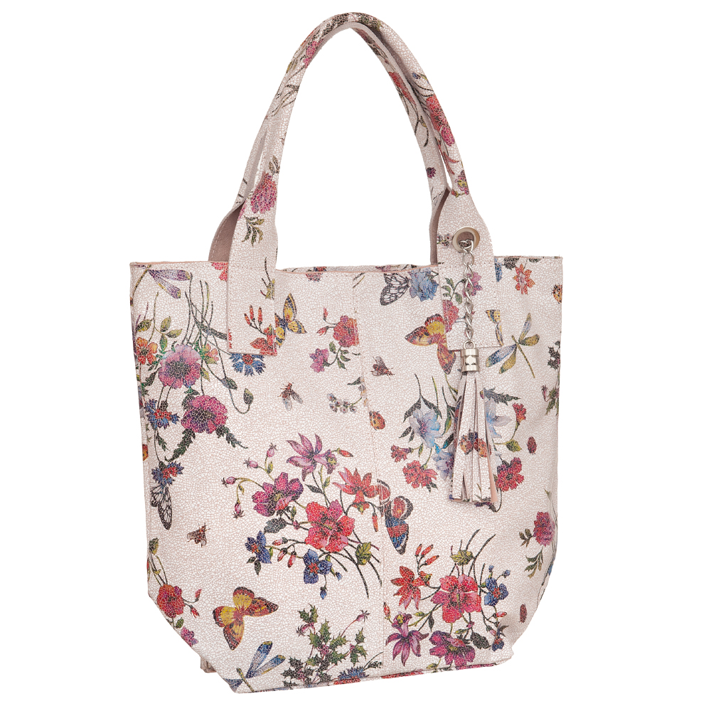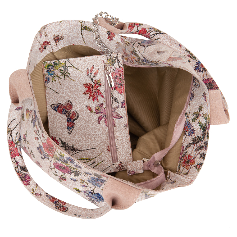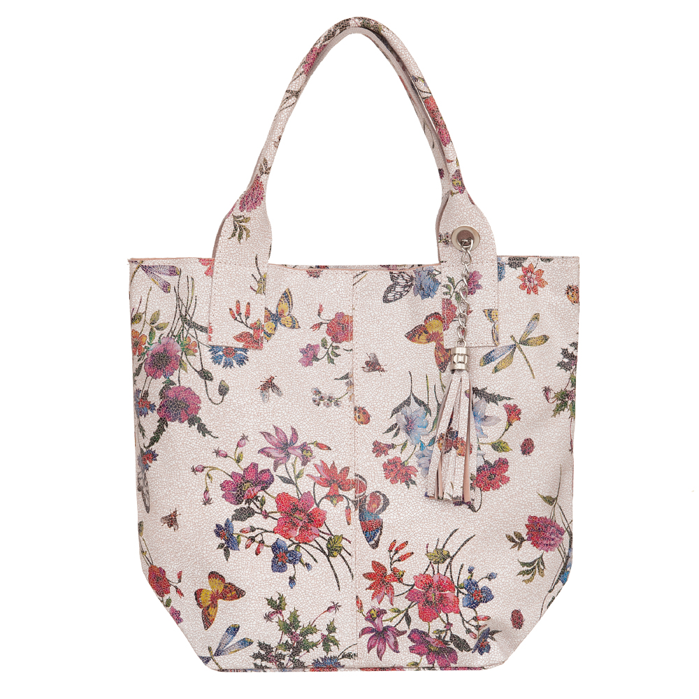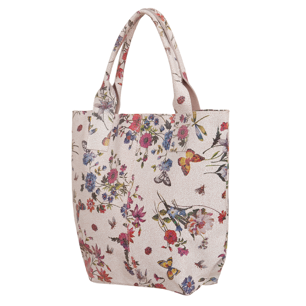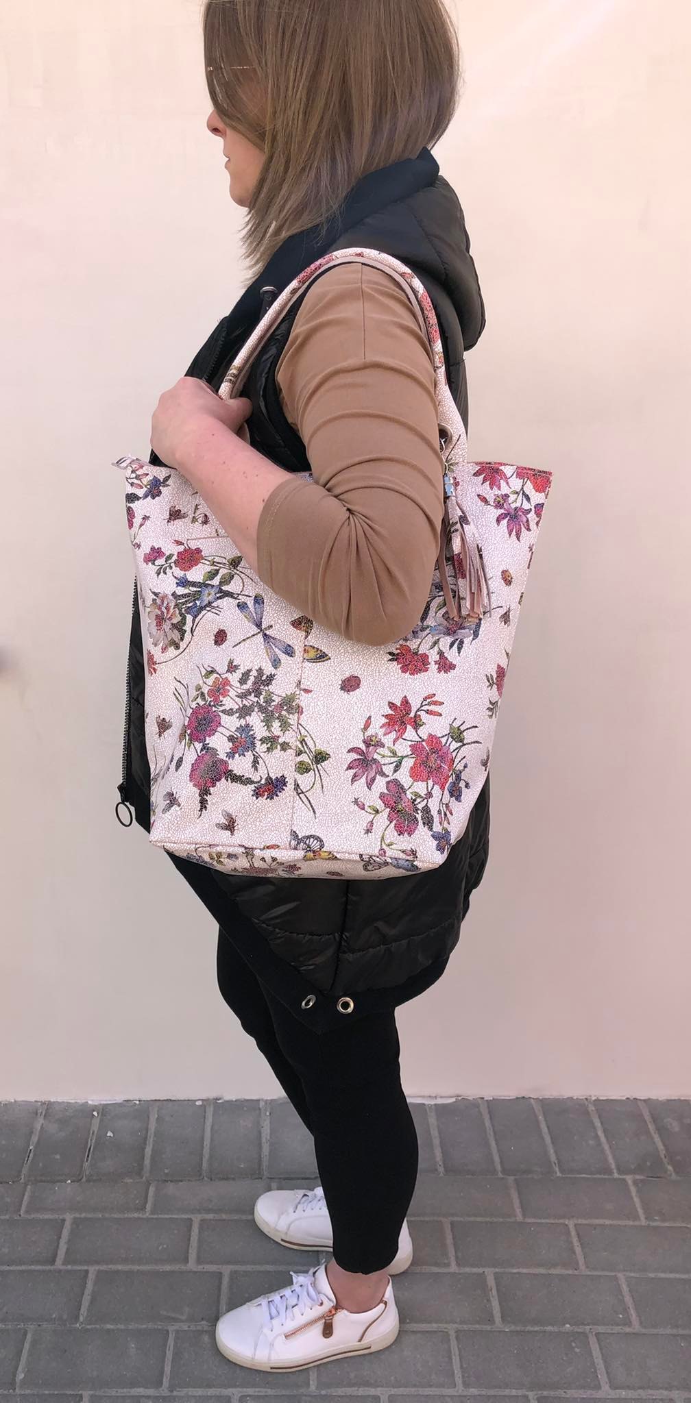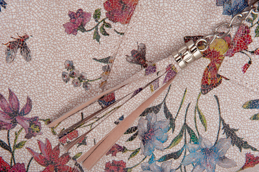 VERA PELLE Włoska skórzana torebka worek wykonana z wysokogatunkowej naturalnej skóry z motywem kwiatów / motyli. Tło - pudrowy róż. Bardzo oryginalny i praktyczny model. Zamykana z góry na zamek na całej szerokości. W środku mocna, materiałowa podszewka. Kieszonka na suwak + saszetka na suwak w środku + miejsce na telefon. Elementy wykończenia w kolorze srebrnym. Modny pęk frędzli z przodu torebki. Swobodnie można nosić ją w dłoni, przedramieniu jak i na ramieniu.