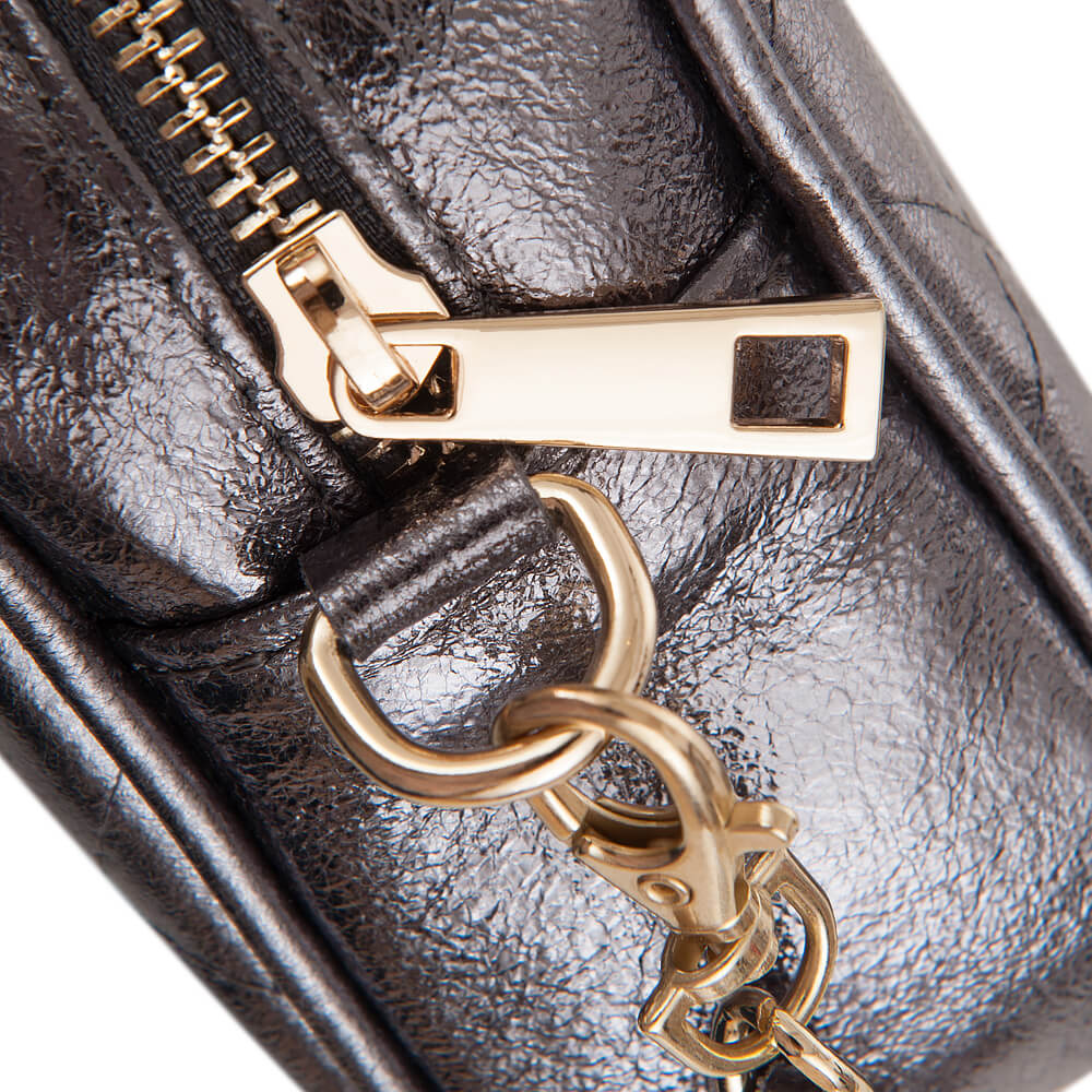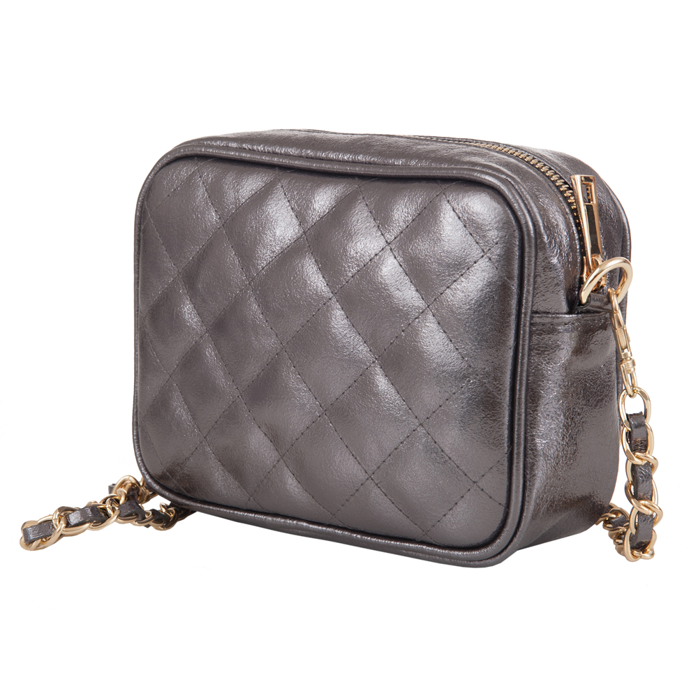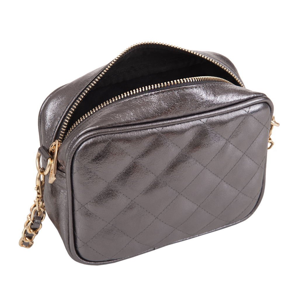 Włoska skórzana pikowana listonoszka wykonana z wysokogatunkowej naturalnej gładkiej metalicznej skóry firmy VERA PELLE. Zamykana z góry na suwak. Torebka jednokomorowa, wewnątrz jedna kieszonka. Wnętrze wykończone trwałą, materiałową podszewką. Elementy wykończenia w kolorze złotym. Pasek przepleciony naturalną skórą, z możliwością całkowitego odpięcia, dzięki czemu torebkę można nosić jako elegancką kopertówkę.