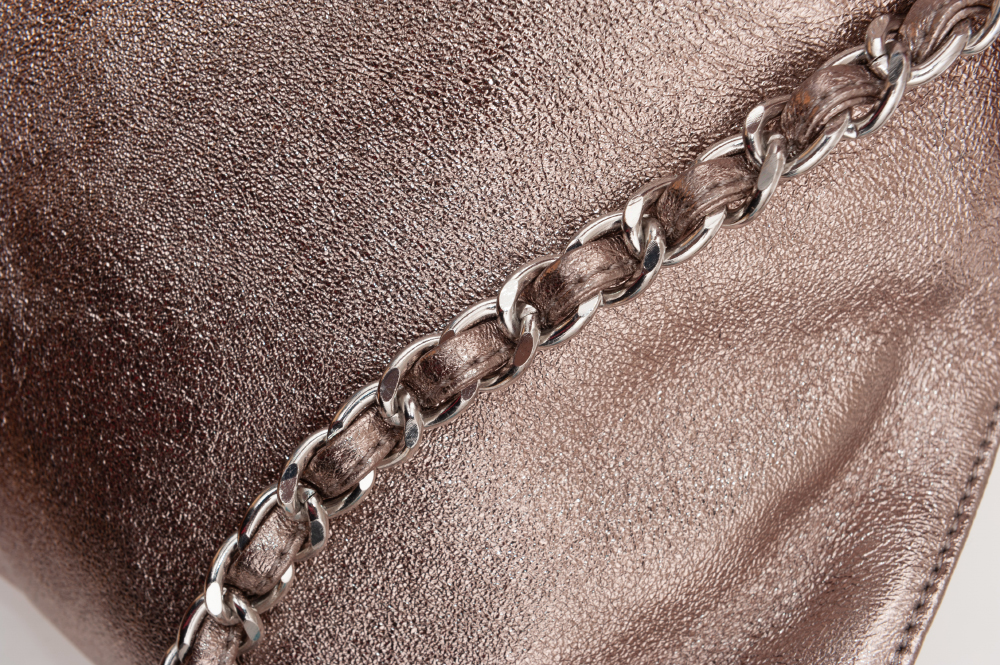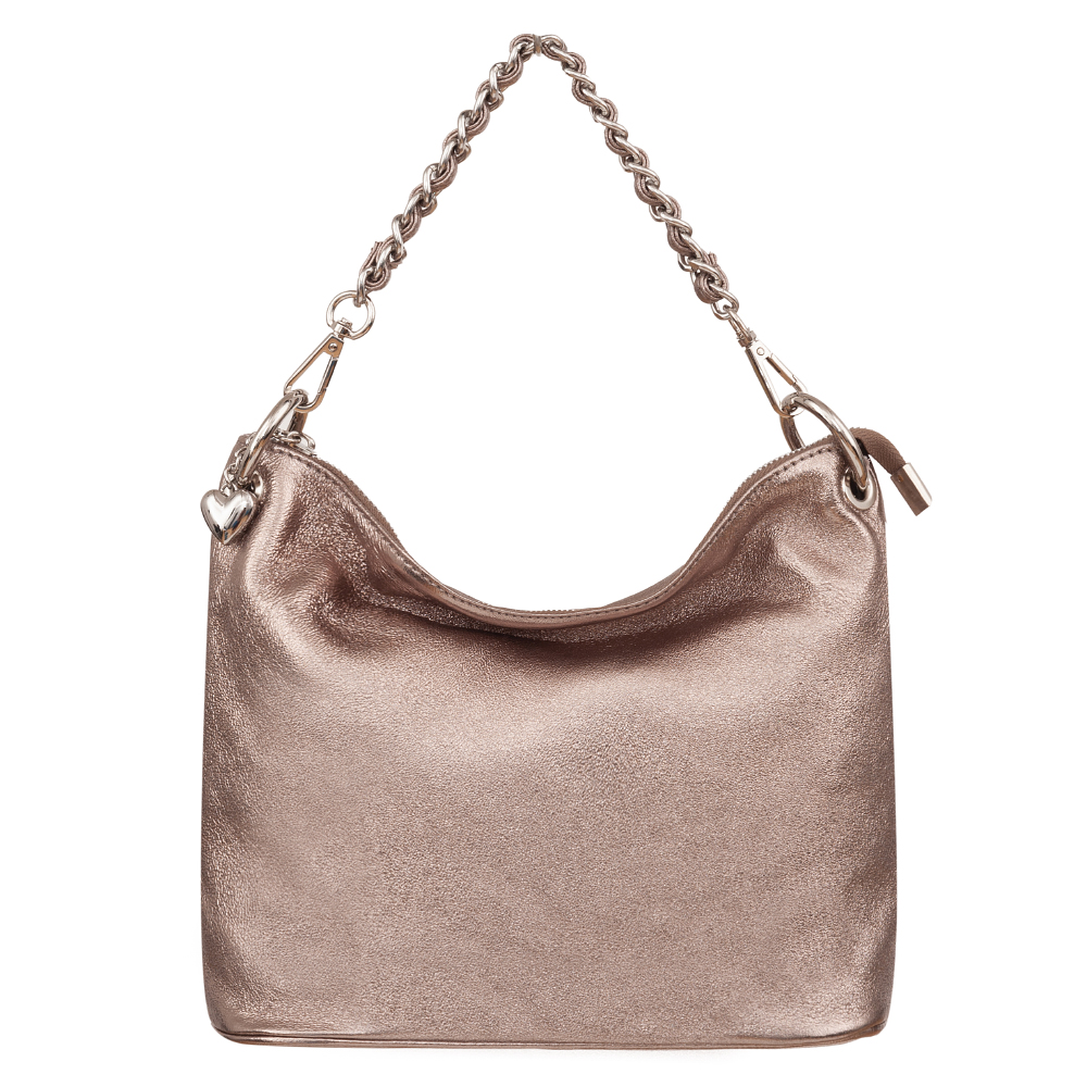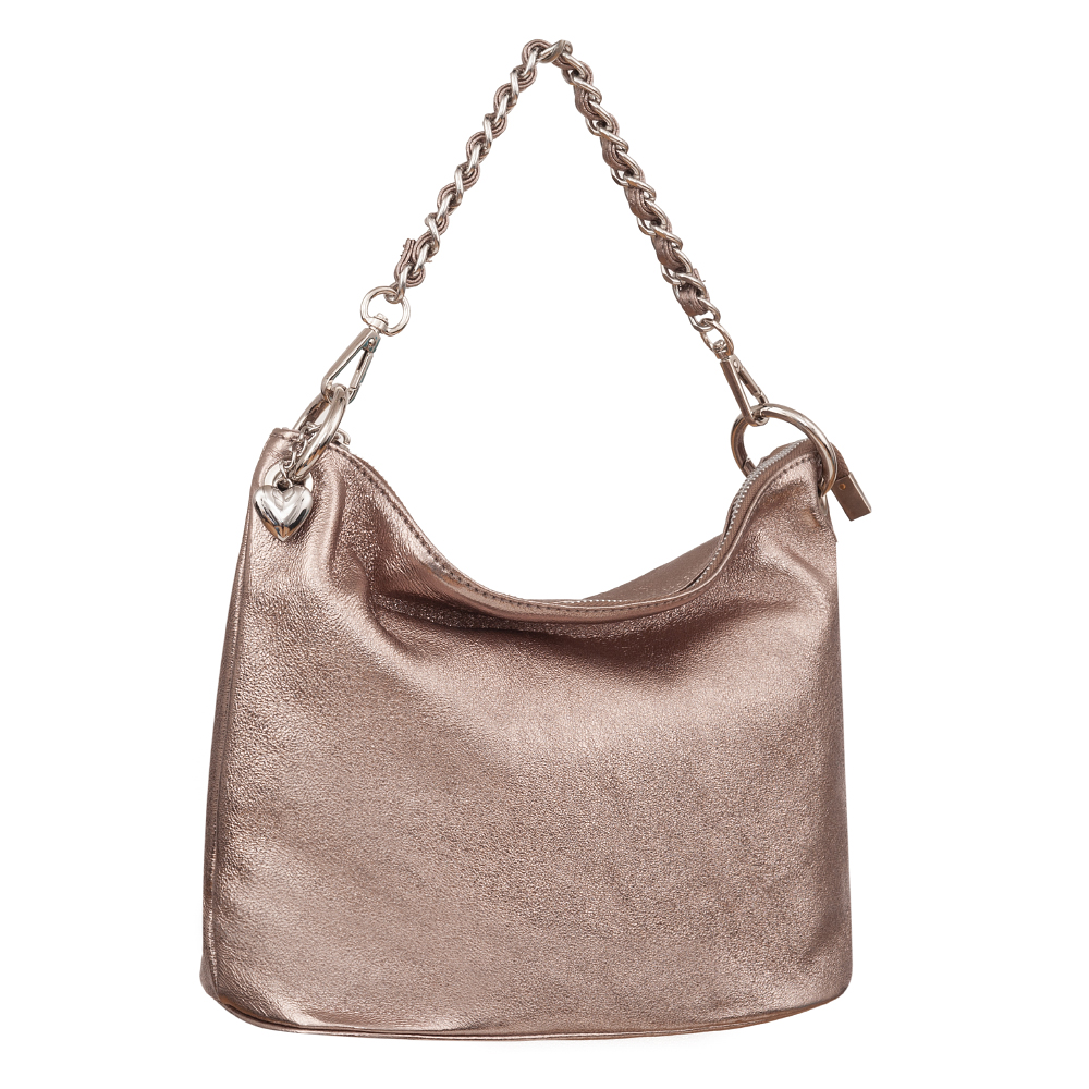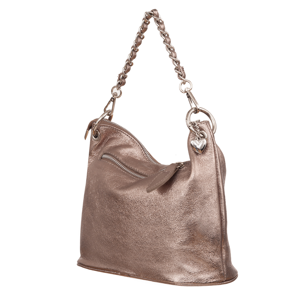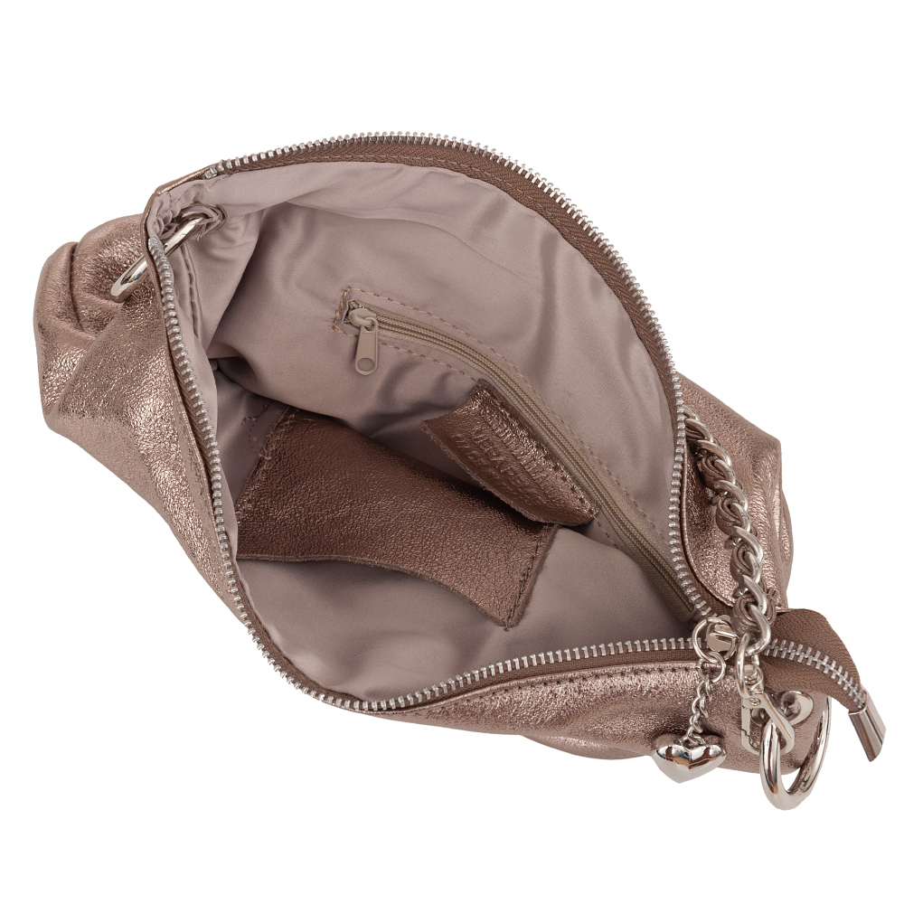 Włoska metaliczna miękka skórzana torebka listonoszka wykonana z naturalnej gładkiej skóry cielęcej. Zamykana od góry na zamek na całej szerokości torebki. Torebka jednokomorowa, wewnątrz jedna kieszonka na zamek + dwie dodatkowe kieszonki. Wnętrze wykończone trwałą, ciemną podszewką. Długi, regulowany pasek umożliwia wygodne noszenie na ramieniu lub przez ramię. Dodatkowa pojemna kieszeń z tyłu na zamek. Elementy wykończenia w kolorze srebrnym. Możliwość noszenia w ręce na łańcuszku ( łańcuszek jest również całkowicie wypinany ). Długi skórzany pasek w komplecie.