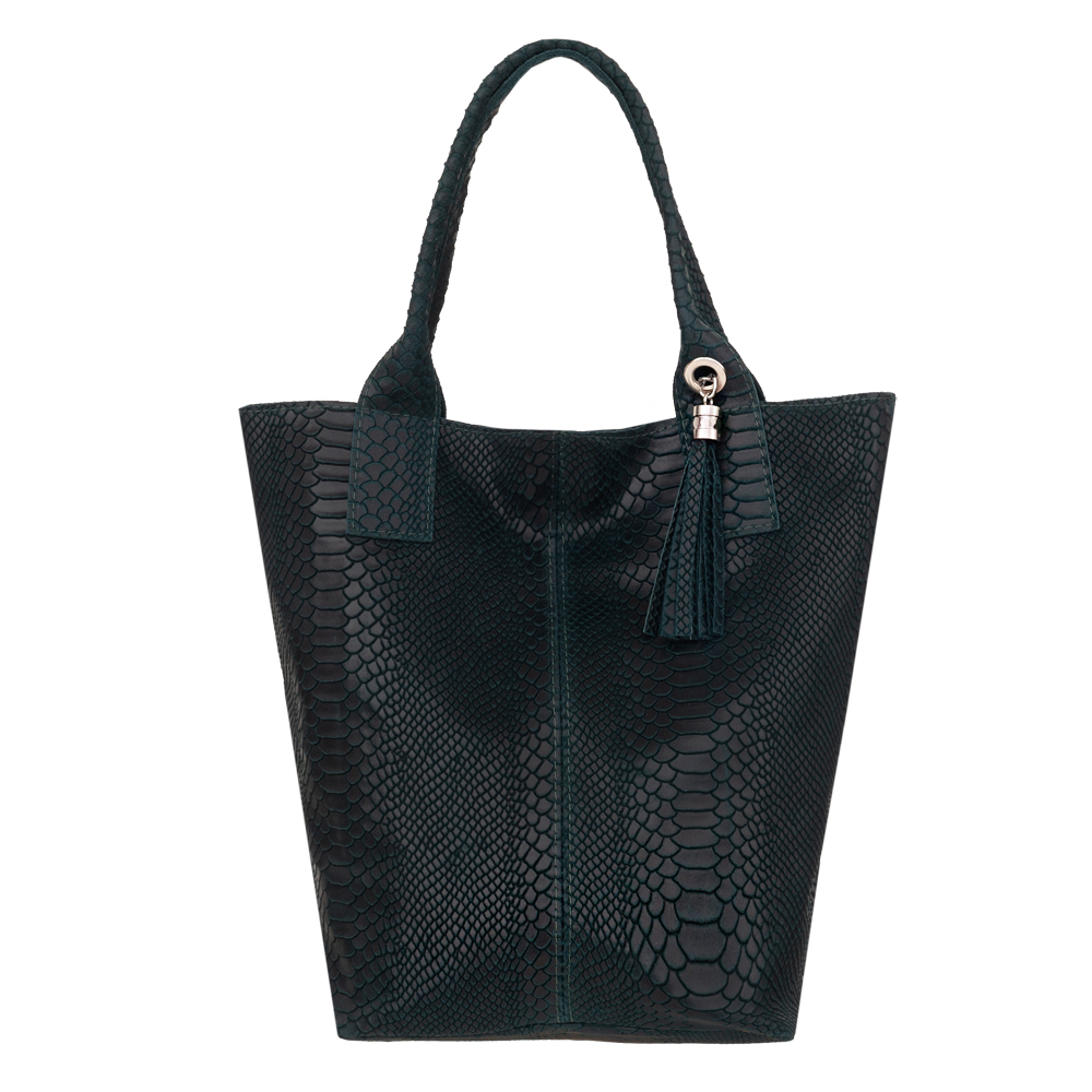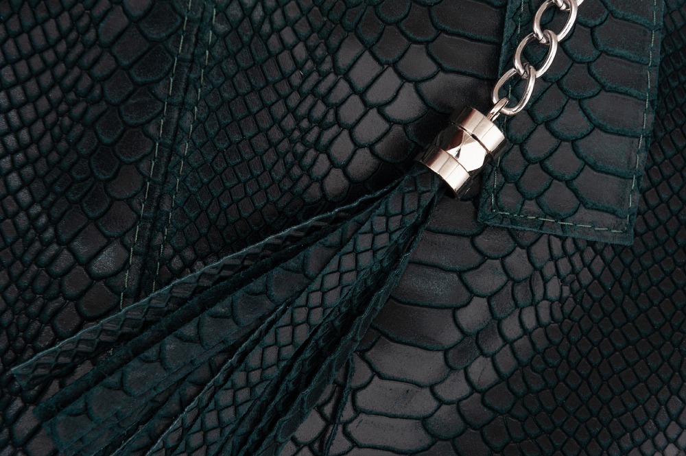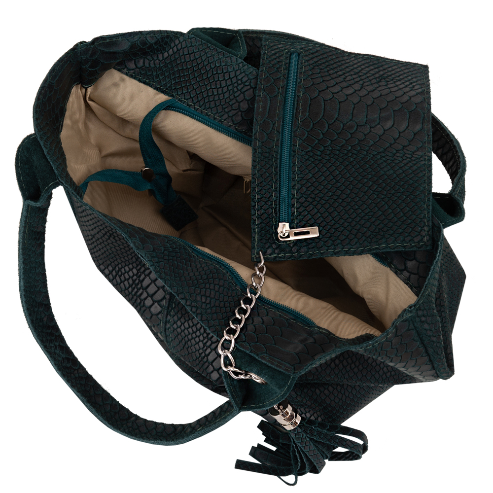 VERA PELLE Włoska skórzana torebka worek wykonana z naturalnej skóry z motywem łuski krokodyla. Bardzo oryginalny i praktyczny model. Zamykana z góry na zamek. W środku mocna, materiałowa podszewka. Kieszonka na suwak + saszetka na suwak w środku + miejsce na telefon. Elementy wykończenia w kolorze srebrnym. Modny pęk frędzli z przodu torebki. Swobodnie można nosić ją w dłoni, przedramieniu jak i na ramieniu.