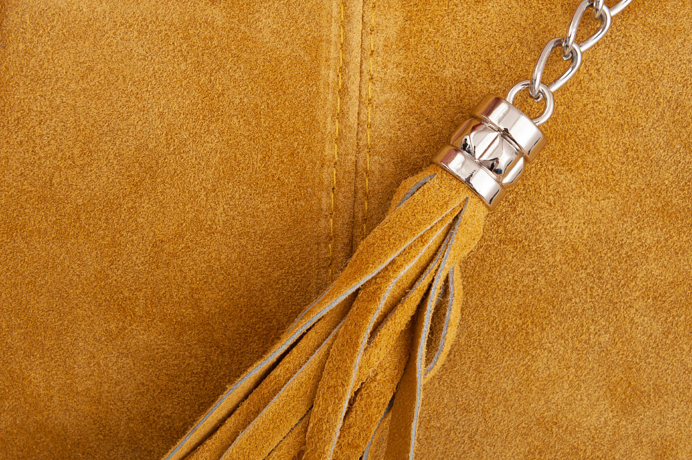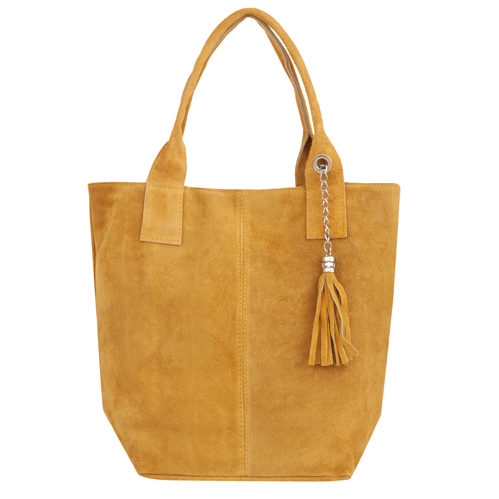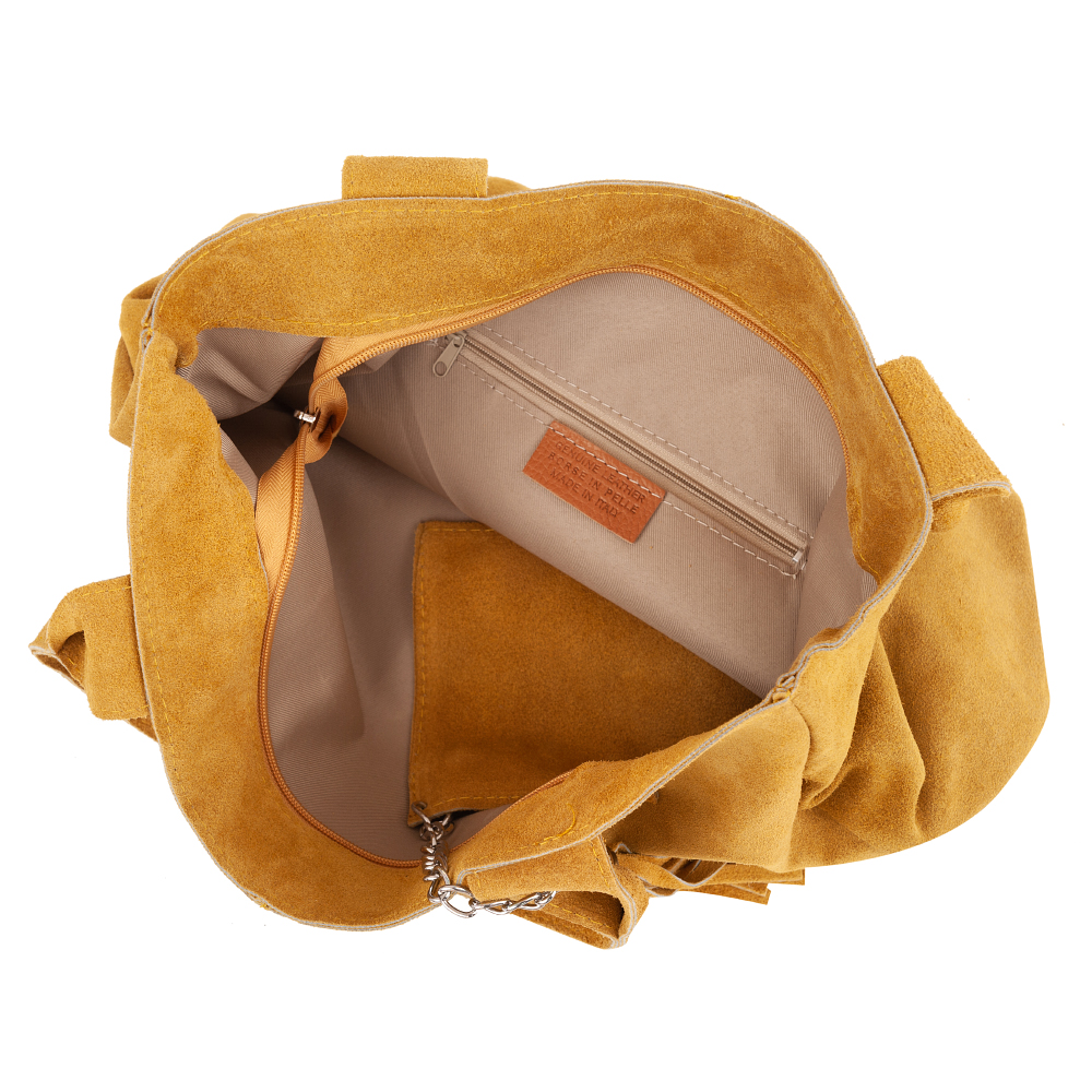 VERA PELLE - Włoska skórzana torebka worek wykonana z wysokogatunkowej naturalnej skóry zamszowej. Bardzo oryginalny i praktyczny model. Zamykana z góry na zamek. W środku mocna, materiałowa podszewka. Kieszonka na suwak + saszetka na suwak w środku + miejsce na telefon. Elementy wykończenia w kolorze srebrnym. Modny pęk frędzli z przodu torebki. Swobodnie można nosić ją w dłoni, przedramieniu jak i na ramieniu. Zamsz miękki, przyjemny w dotyku.