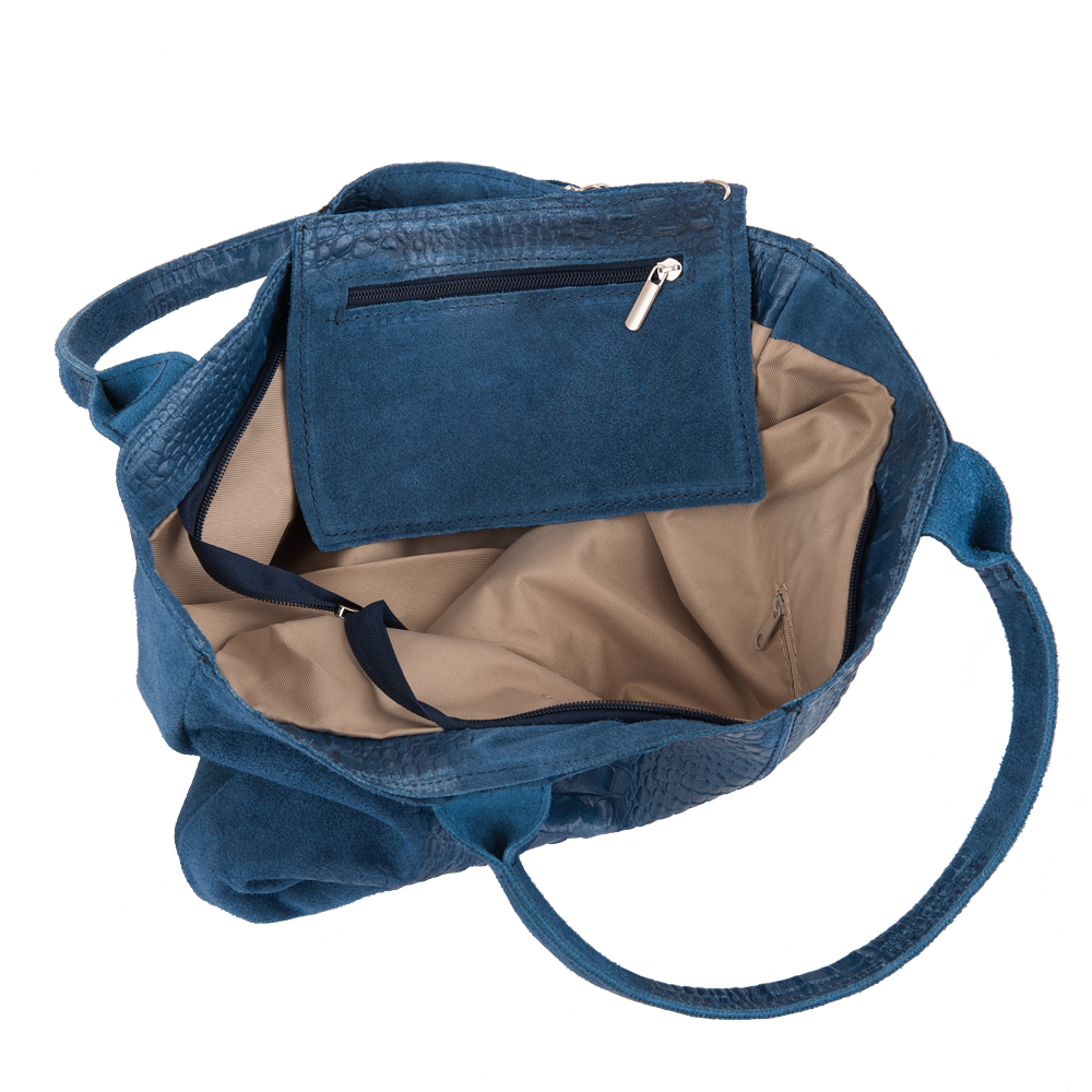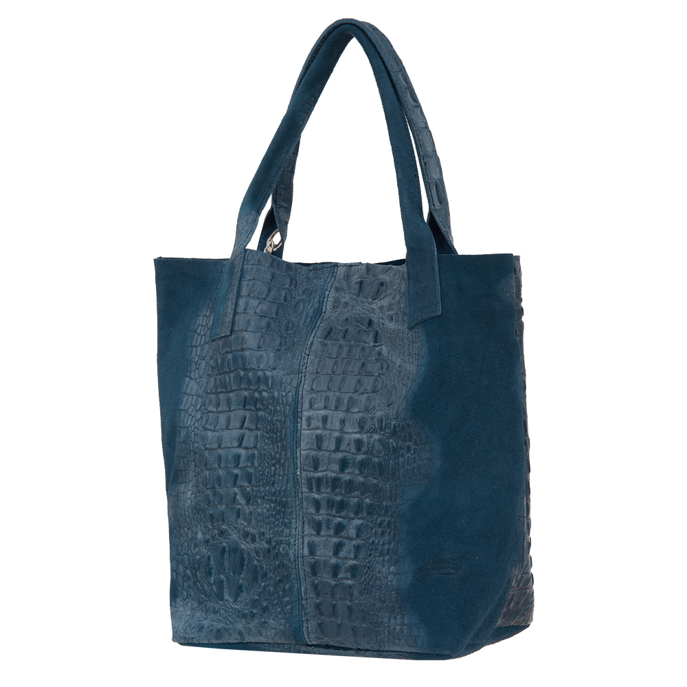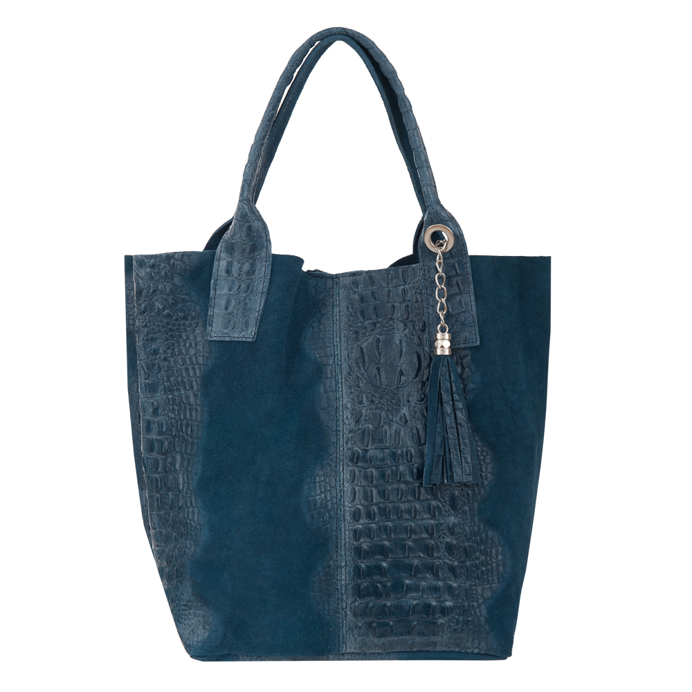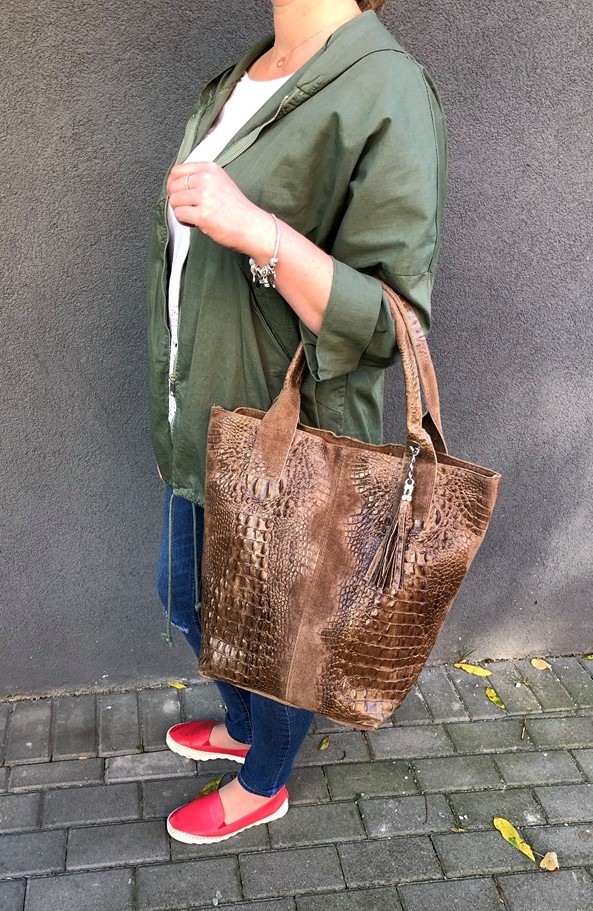 VERA PELLE Włoska skórzana torebka worek wykonana z wysokogatunkowej naturalnej skóry zamszowej łączonej ze skórą naturalną licową z motywem krokodyla. Bardzo oryginalny i praktyczny model. Zamykana z góry na zamek. W środku mocna, materiałowa podszewka. Kieszonka na suwak + saszetka na suwak w środku + miejsce na telefon. Elementy wykończenia w kolorze srebrnym. Modny pęk frędzli z przodu torebki. Swobodnie można nosić ją w dłoni, przedramieniu jak i na ramieniu.