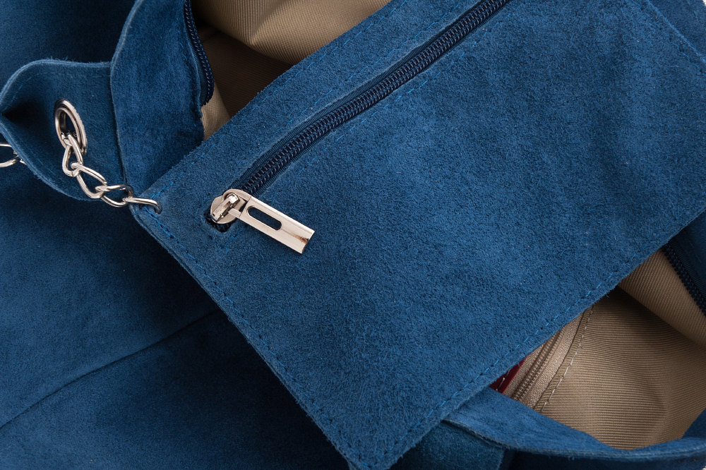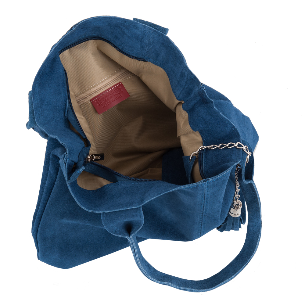 VERA PELLE - Włoska skórzana torebka worek wykonana z wysokogatunkowej naturalnej skóry zamszowej. Bardzo oryginalny i praktyczny model. Zamykana z góry na zamek. W środku mocna, materiałowa podszewka. Kieszonka na suwak + saszetka na suwak w środku + miejsce na telefon. Elementy wykończenia w kolorze srebrnym. Modny pęk frędzli z przodu torebki. Swobodnie można nosić ją w dłoni, przedramieniu jak i na ramieniu. Zamsz miękki, przyjemny w dotyku.