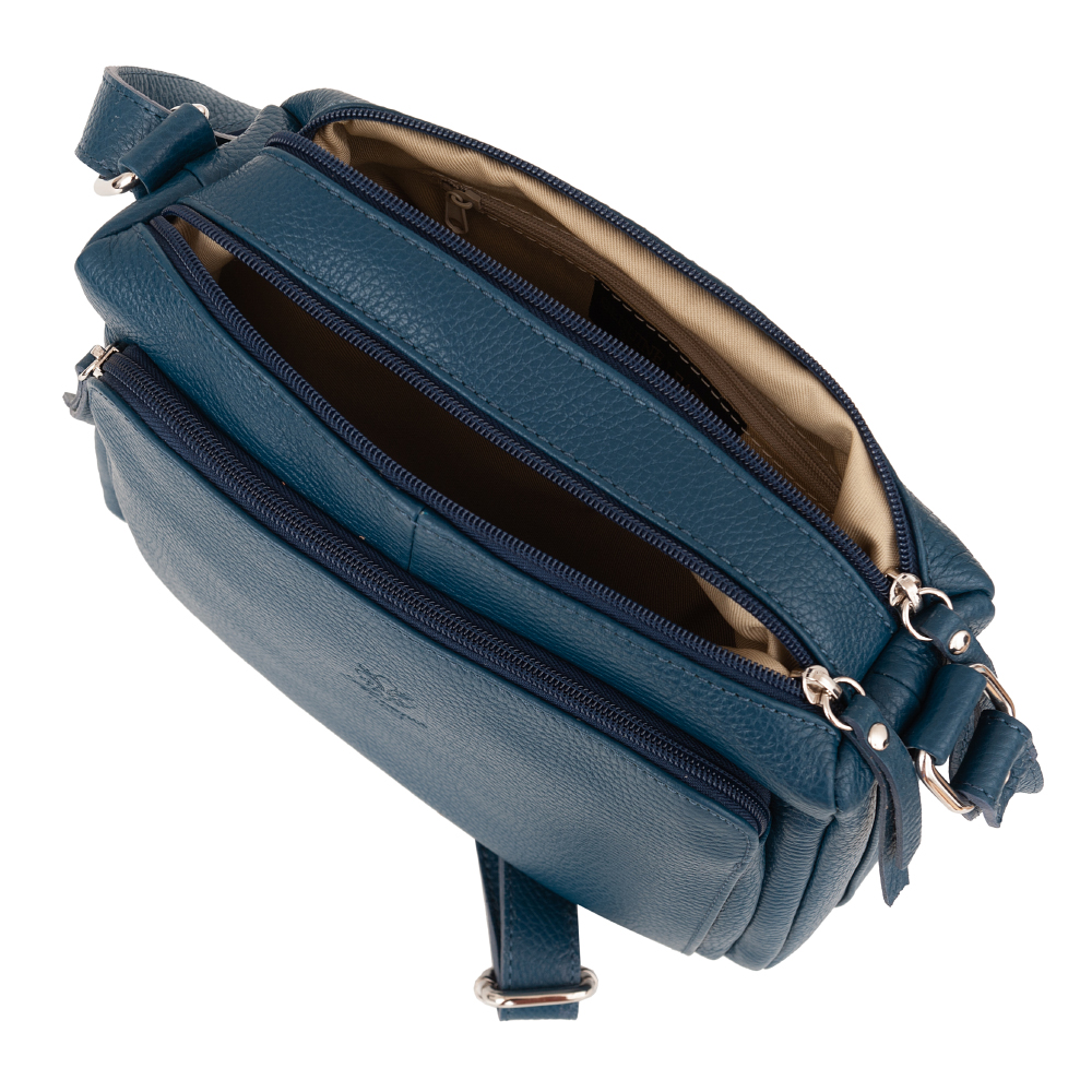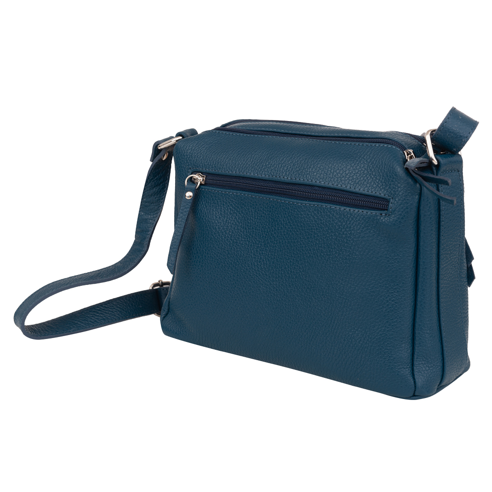 Torebka trzykomorowa, trzy komory na zamek. Wewnątrz dodatkowo w jednej komorze miejsce na telefon + kieszonka na zamek w drugiej komorze. Miękkie i szerokie ucho umożliwia wygodne noszenie na ramieniu lub przez ramię.