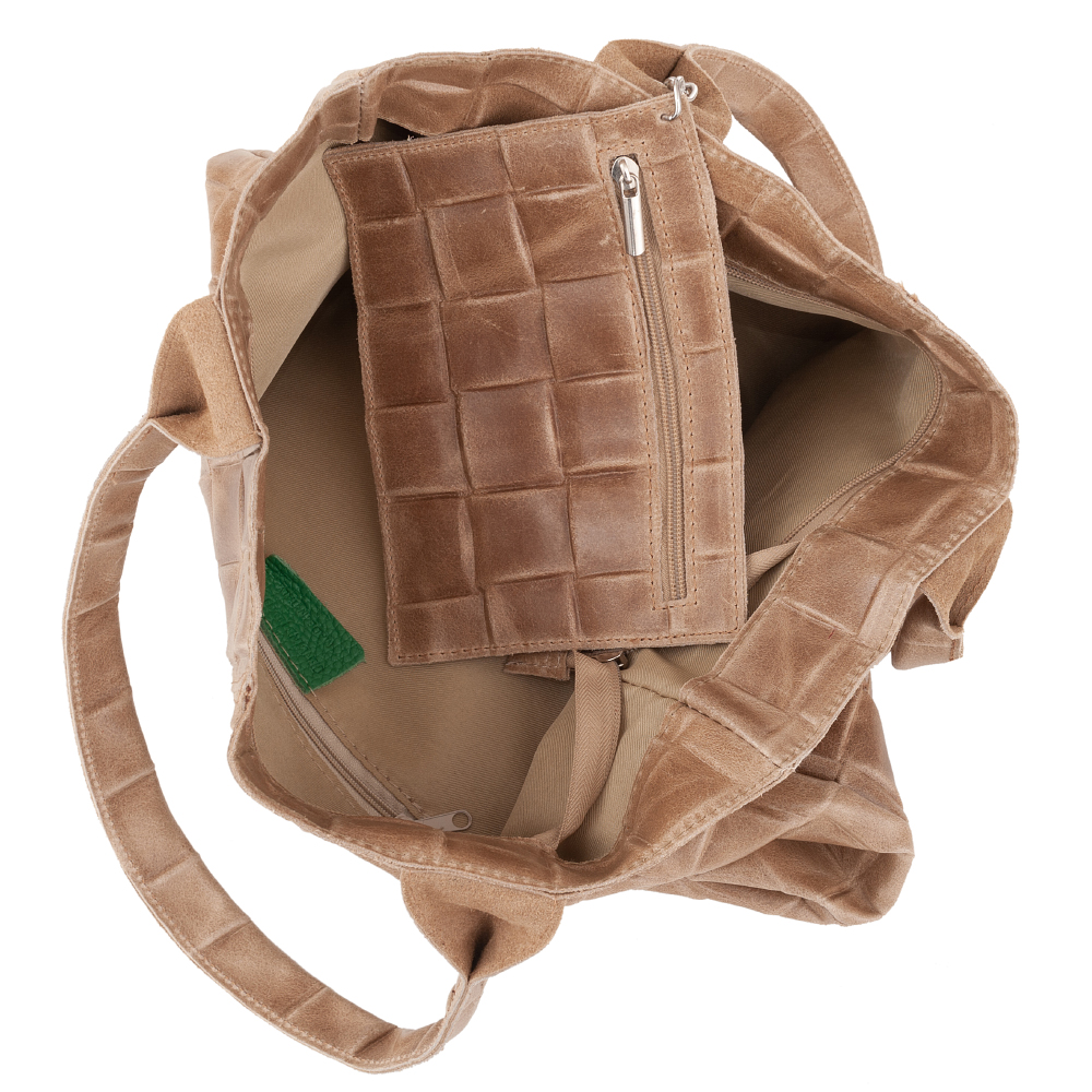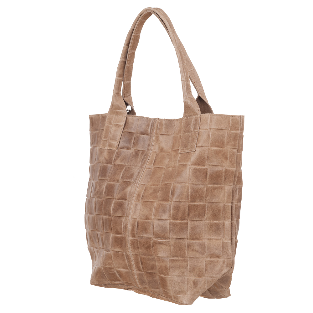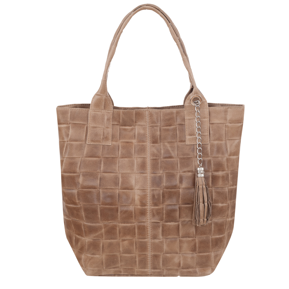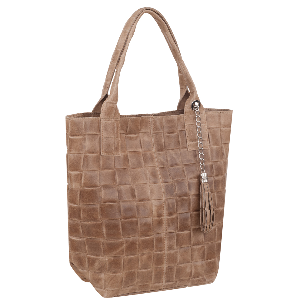 VERA PELLE Włoska skórzana torebka worek wykonana z naturalnej skóry z motywem plecionki. Bardzo oryginalny i praktyczny model. Zamykana z góry na zamek. W środku mocna, materiałowa podszewka. Kieszonka na suwak + saszetka na suwak w środku + miejsce na telefon. Elementy wykończenia w kolorze srebrnym. Modny pęk frędzli z przodu torebki. Swobodnie można nosić ją w dłoni, przedramieniu jak i na ramieniu.