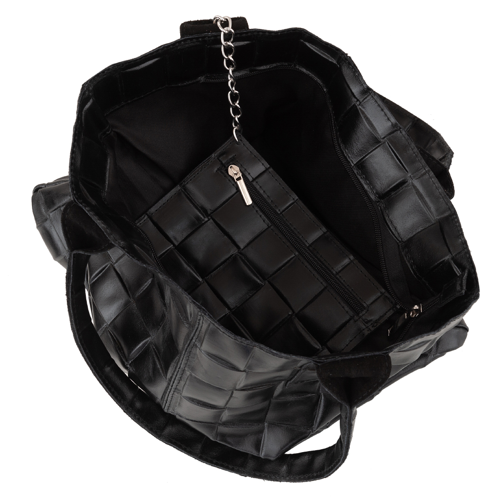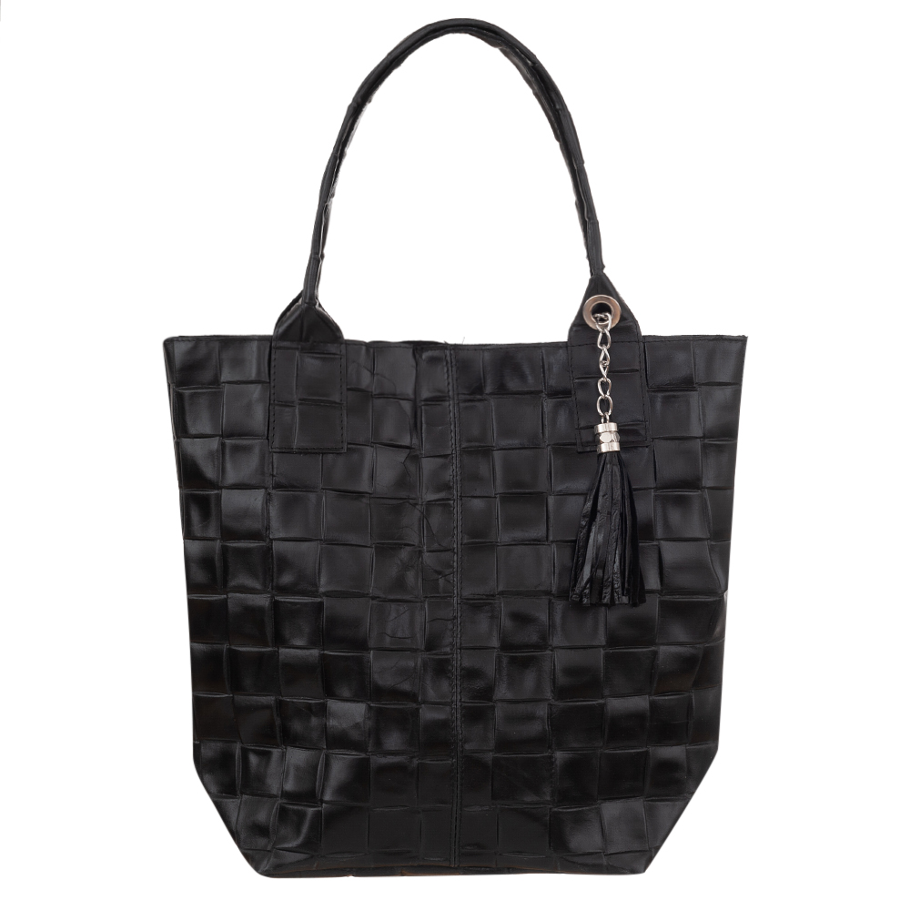 VERA PELLE Włoska skórzana torebka worek wykonana z naturalnej skóry z motywem plecionki. Bardzo oryginalny i praktyczny model. Zamykana z góry na zamek. W środku mocna, materiałowa podszewka. Kieszonka na suwak + saszetka na suwak w środku + miejsce na telefon. Elementy wykończenia w kolorze srebrnym. Modny pęk frędzli z przodu torebki. Swobodnie można nosić ją w dłoni, przedramieniu jak i na ramieniu.