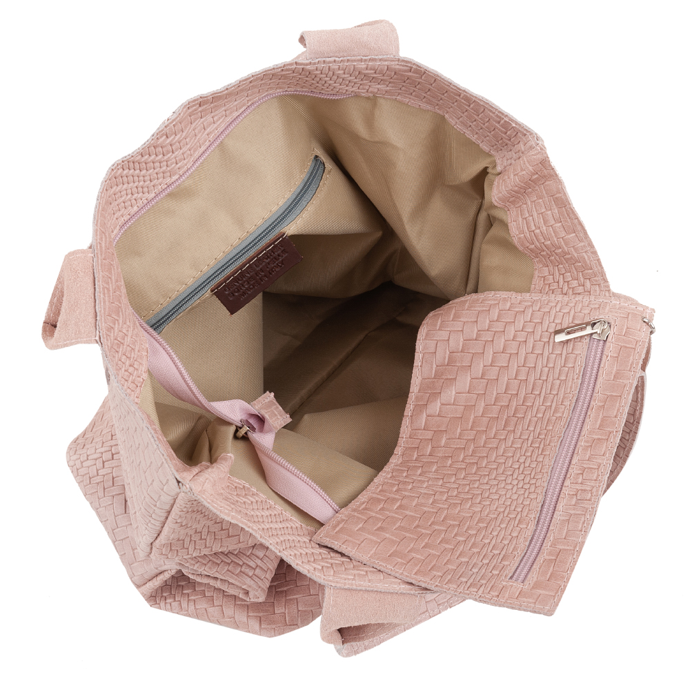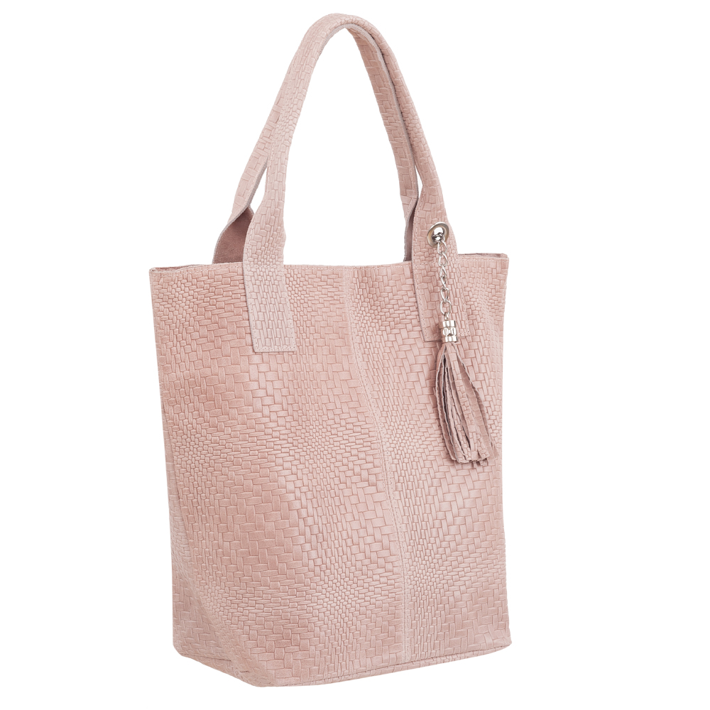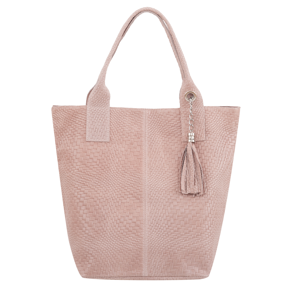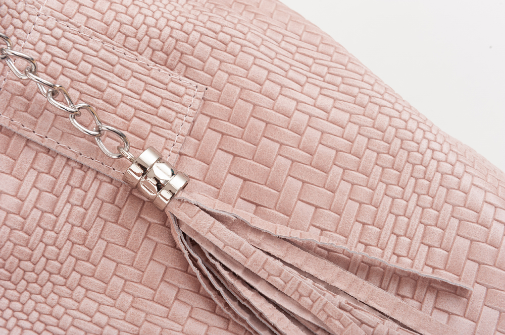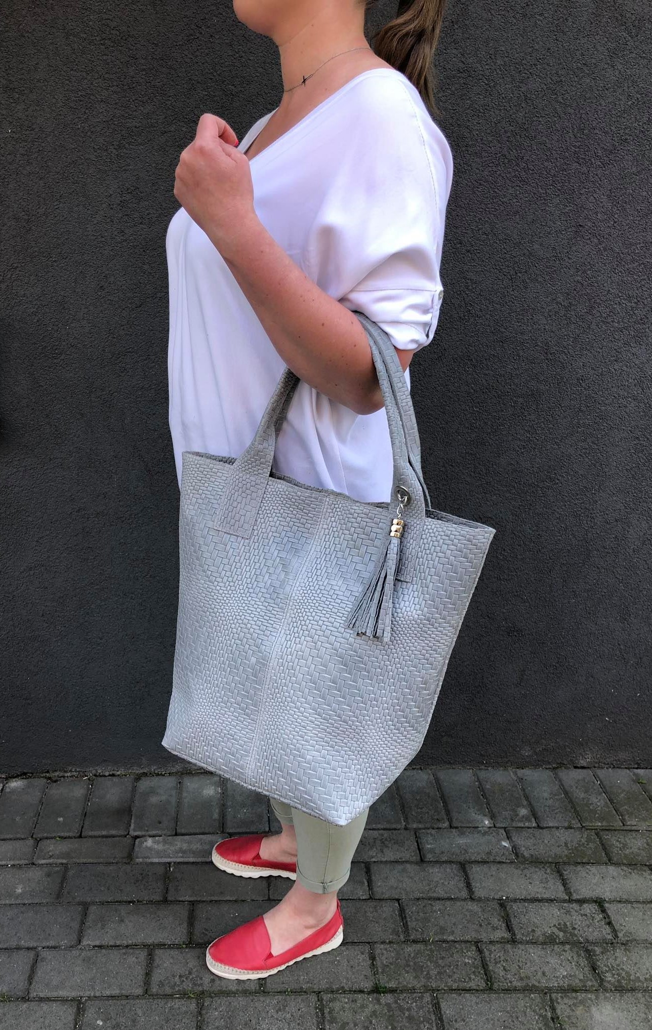 VERA PELLE Włoska skórzana torebka worek wykonana z naturalnej skóry z motywem plecionki. Bardzo oryginalny i praktyczny model. Zamykana z góry na zamek. W środku mocna, materiałowa podszewka. Kieszonka na suwak + saszetka na suwak w środku + miejsce na telefon. Elementy wykończenia w kolorze srebrnym. Modny pęk frędzli z przodu torebki. Swobodnie można nosić ją w dłoni, przedramieniu jak i na ramieniu.