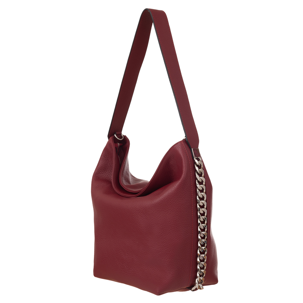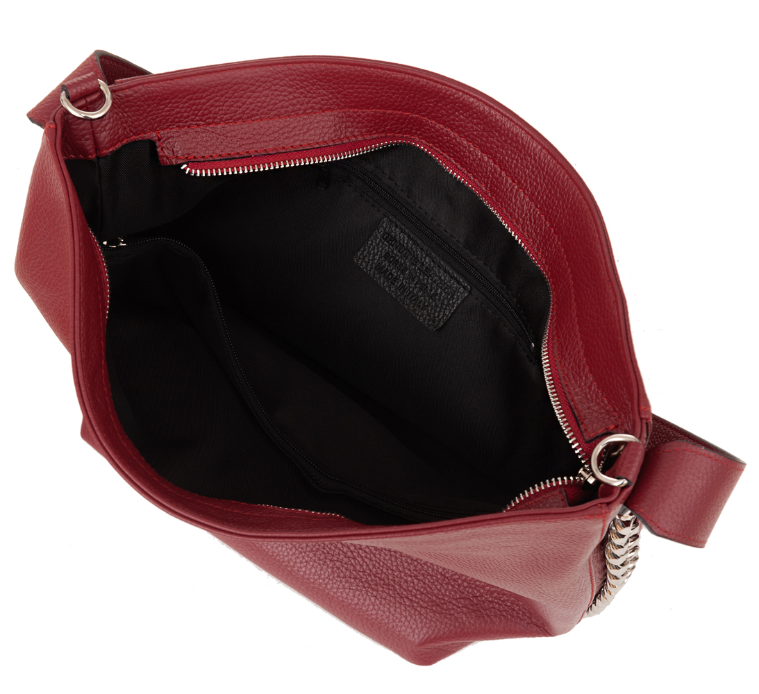 Vera Pelle - Włoska A4 pojemna miękka skórzana torebka worek wykonana z wysokogatunkowej naturalnej skóry licowej dolaro. Zamykana od góry na zamek na całej szerokości. Torebka dwukomorowa przedzielona na środku dużą kieszenią na zamek + wewnątrz dodatkowo jedna kieszonka na zamek + kieszonka na telefon. Wnętrze wykończone trwałą, czarną materiałową podszewką. Miękkie ucho umożliwia wygodne noszenie na ramieniu. W komplecie długi, regulowany pasek . Elementy wykończenia w kolorze srebrnym. Dno usztywnione. Modnym elementem są srebrne metalowe łańcuchy po bokach torebki.