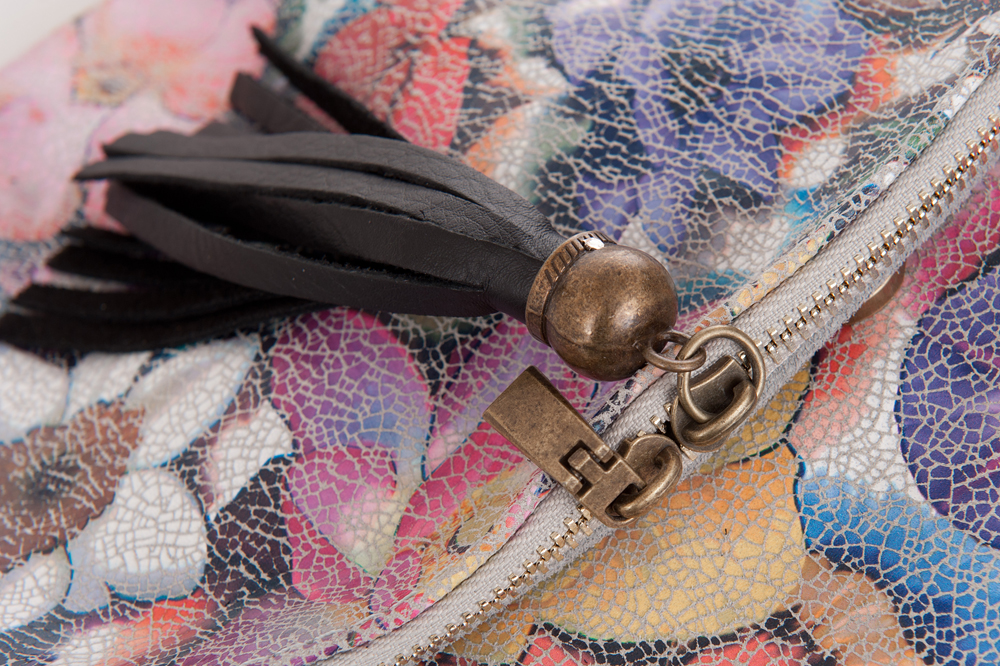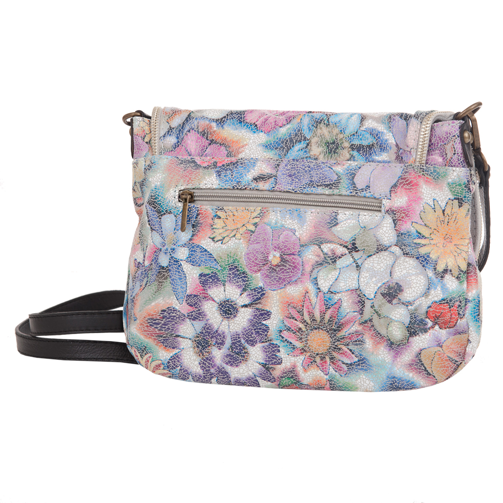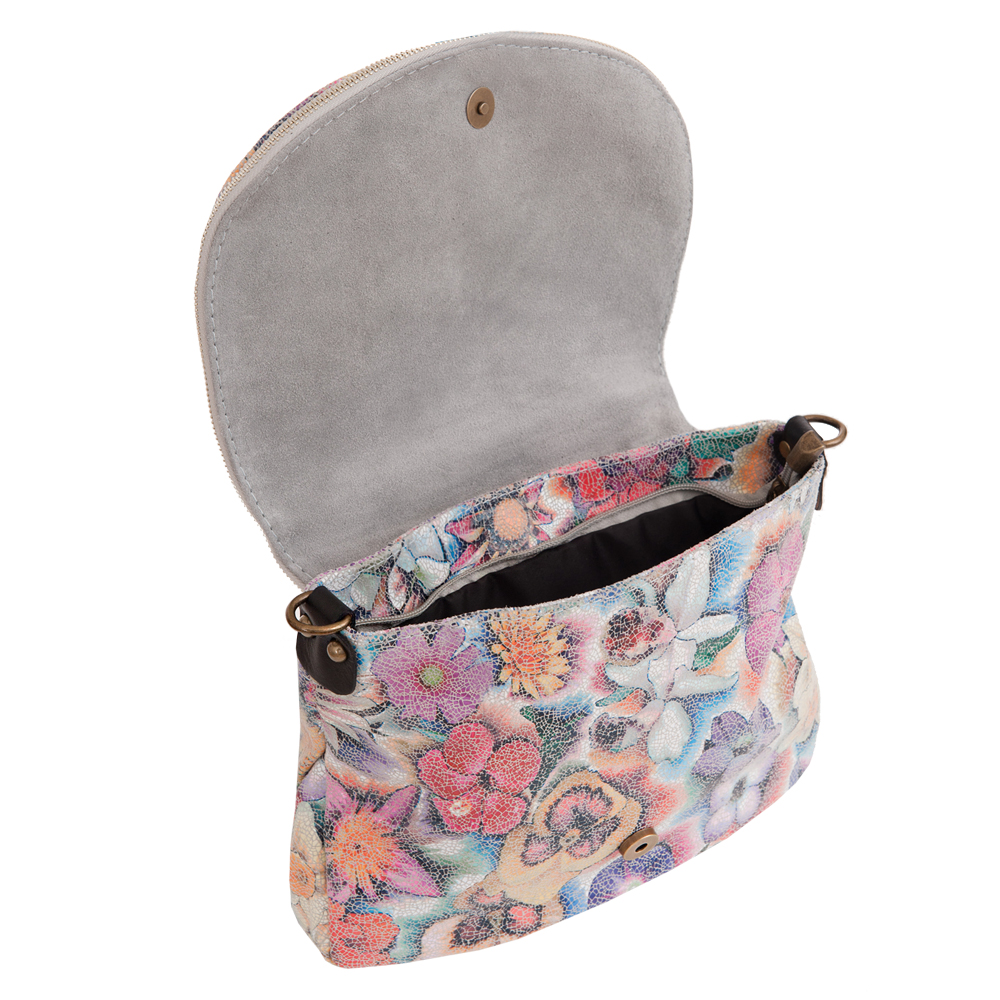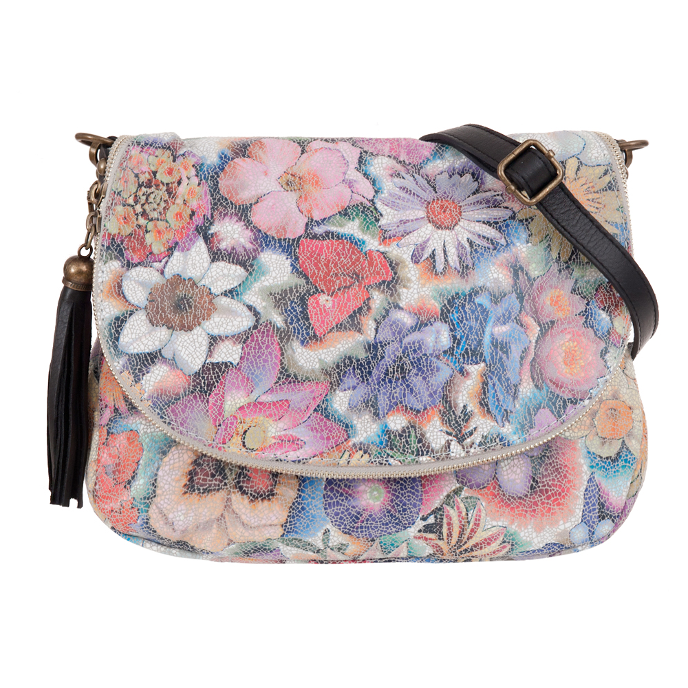 Włoska pojemna skórzana kolorowa torebka / listonoszka wykonana z wysokogatunkowej naturalnej gładkiej skóry z motywem kwiatów. Zamykana na dużą klapę na magnes (w klapie duża kieszonka) + zamek na całej szerokości torebki. Torebka jednokomorowa, wewnątrz jedna kieszonka na zamek + miejsce na telefon. Wnętrze wykończone trwałą, materiałową podszewką. Długi, regulowany pasek umożliwia wygodne noszenie na ramieniu lub przez ramię. Dodatkowa kieszeń w klapie torebki na suwak.