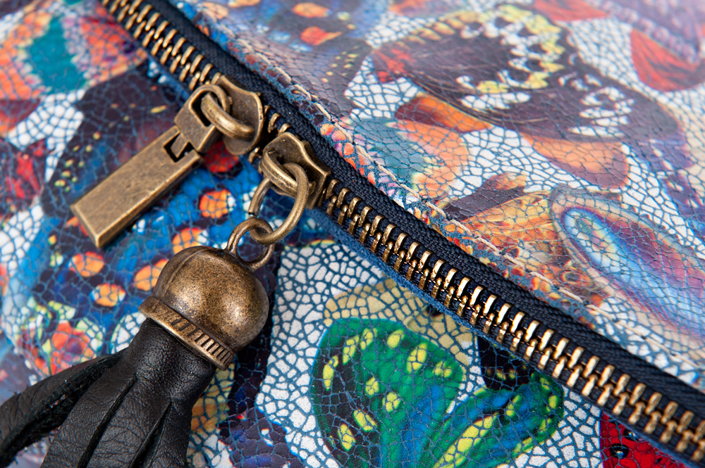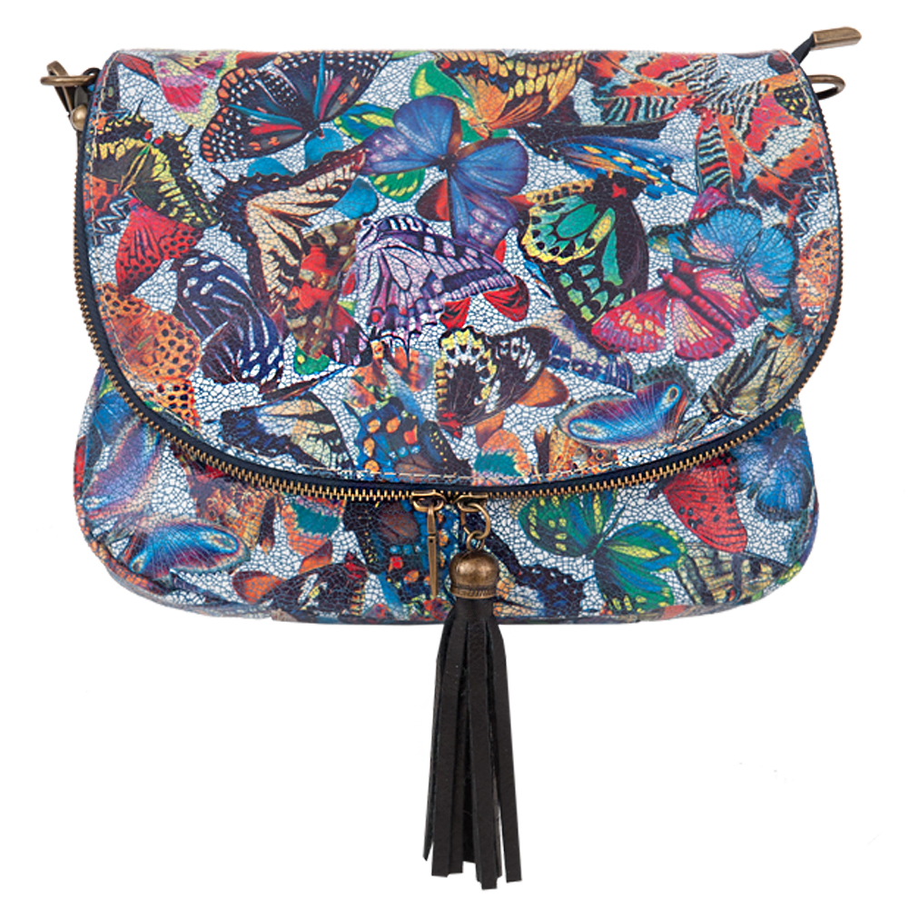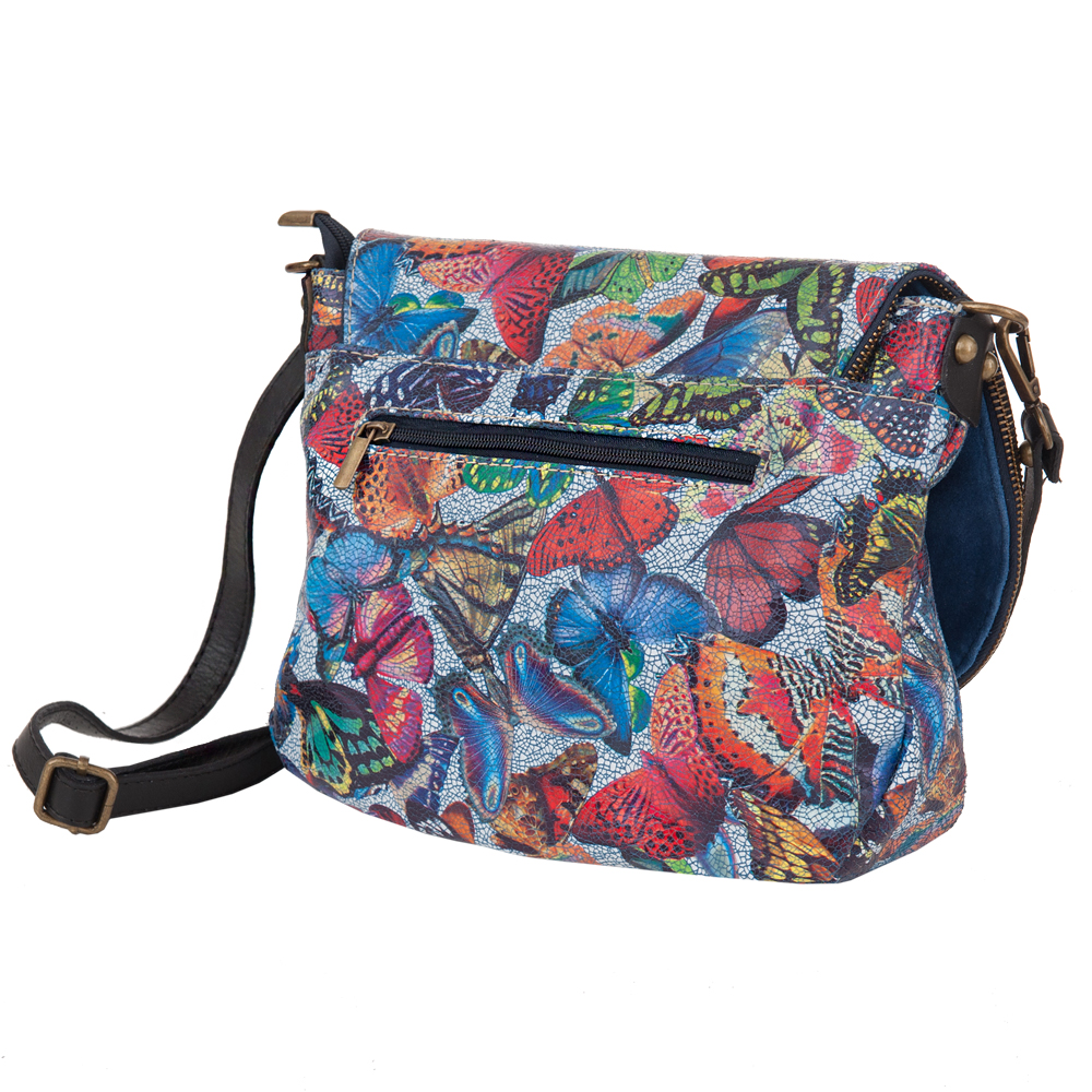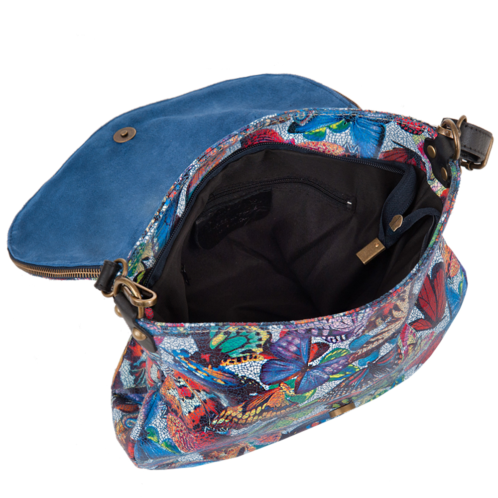 Włoska pojemna skórzana torebka / listonoszka wykonana z wysokogatunkowej naturalnej gładkiej skóry z motywem motyli. Zamykana na dużą klapę na magnes (w klapie duża kieszonka) + suwak na całej szerokości torebki. Torebka jednokomorowa, wewnątrz jedna kieszonka na zamek + miejsce na telefon. Wnętrze wykończone trwałą, ciemną podszewką. Długi, regulowany pasek umożliwia wygodne noszenie na ramieniu lub przez ramię. Dodatkowa kieszeń w klapie torebki na suwak.