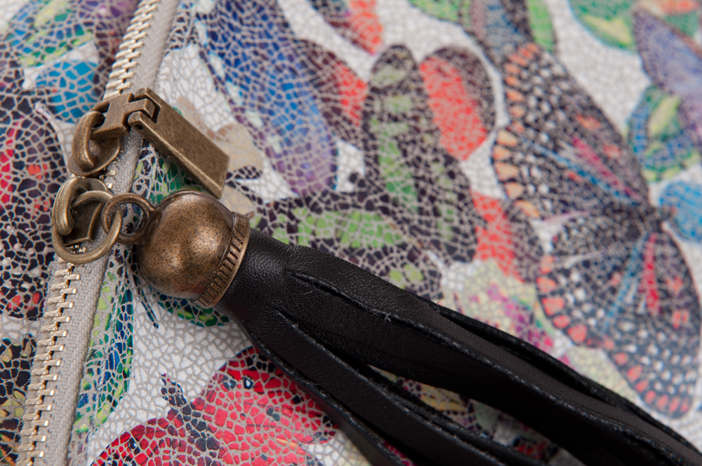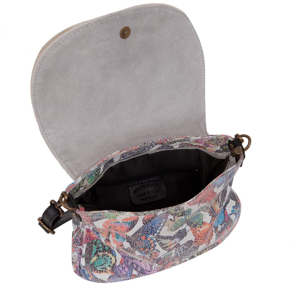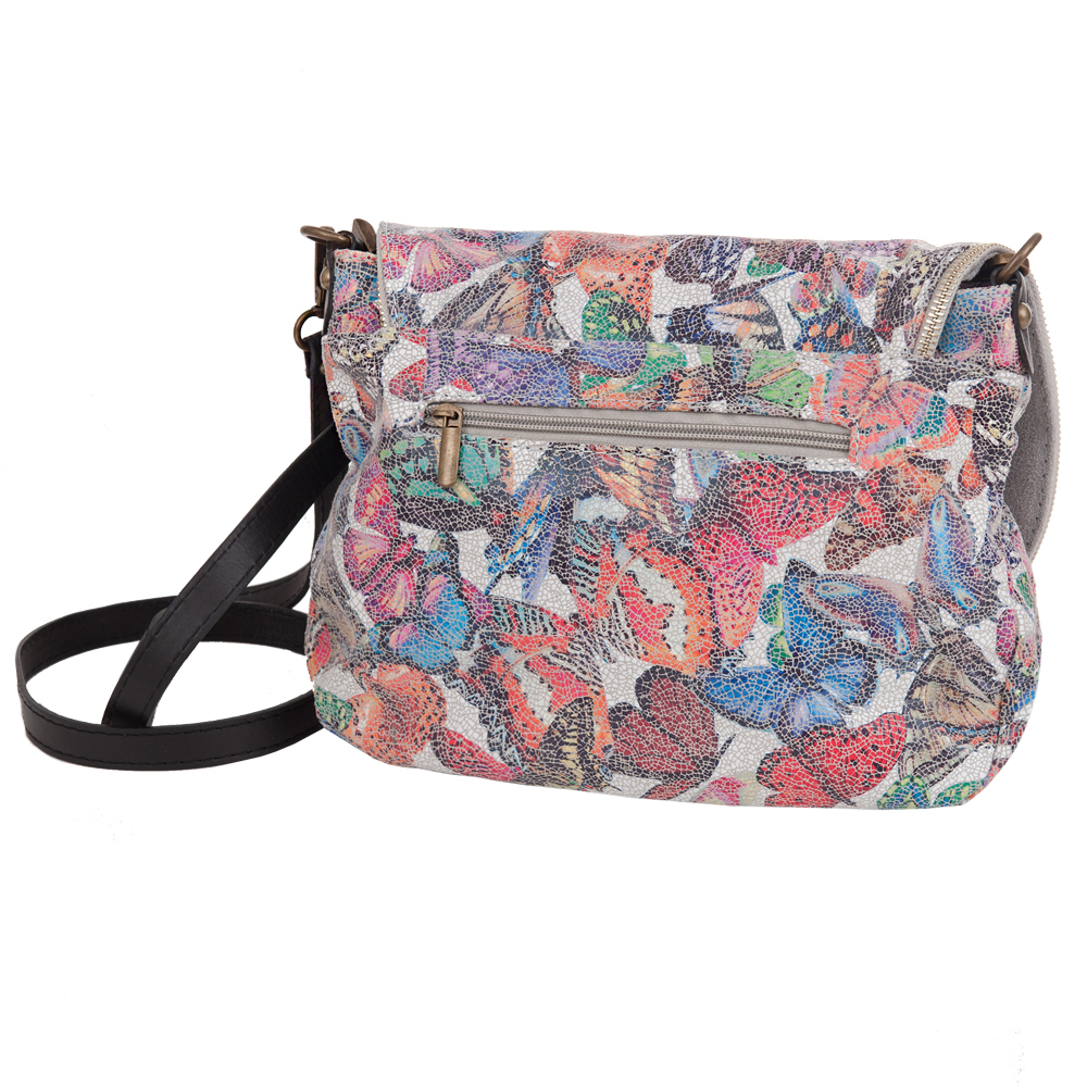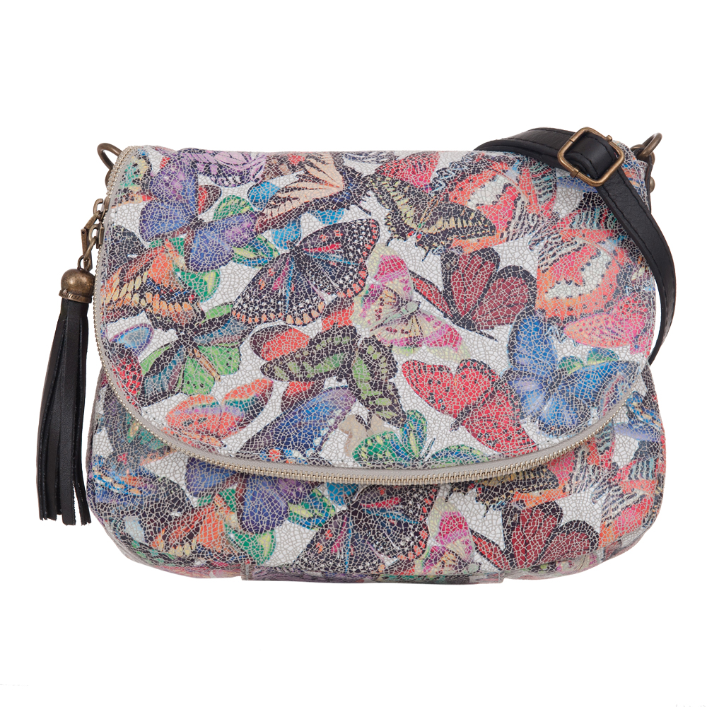 Włoska pojemna skórzana kolorowa torebka / listonoszka wykonana z wysokogatunkowej naturalnej gładkiej skóry z motywem kolorowych motyli. Zamykana na dużą klapę na magnes (w klapie duża kieszonka) + zamek na całej szerokości torebki. Torebka jednokomorowa, wewnątrz jedna kieszonka na zamek + miejsce na telefon. Wnętrze wykończone trwałą, materiałową podszewką. Długi, regulowany pasek umożliwia wygodne noszenie na ramieniu lub przez ramię. Dodatkowa kieszeń w klapie torebki na suwak.
