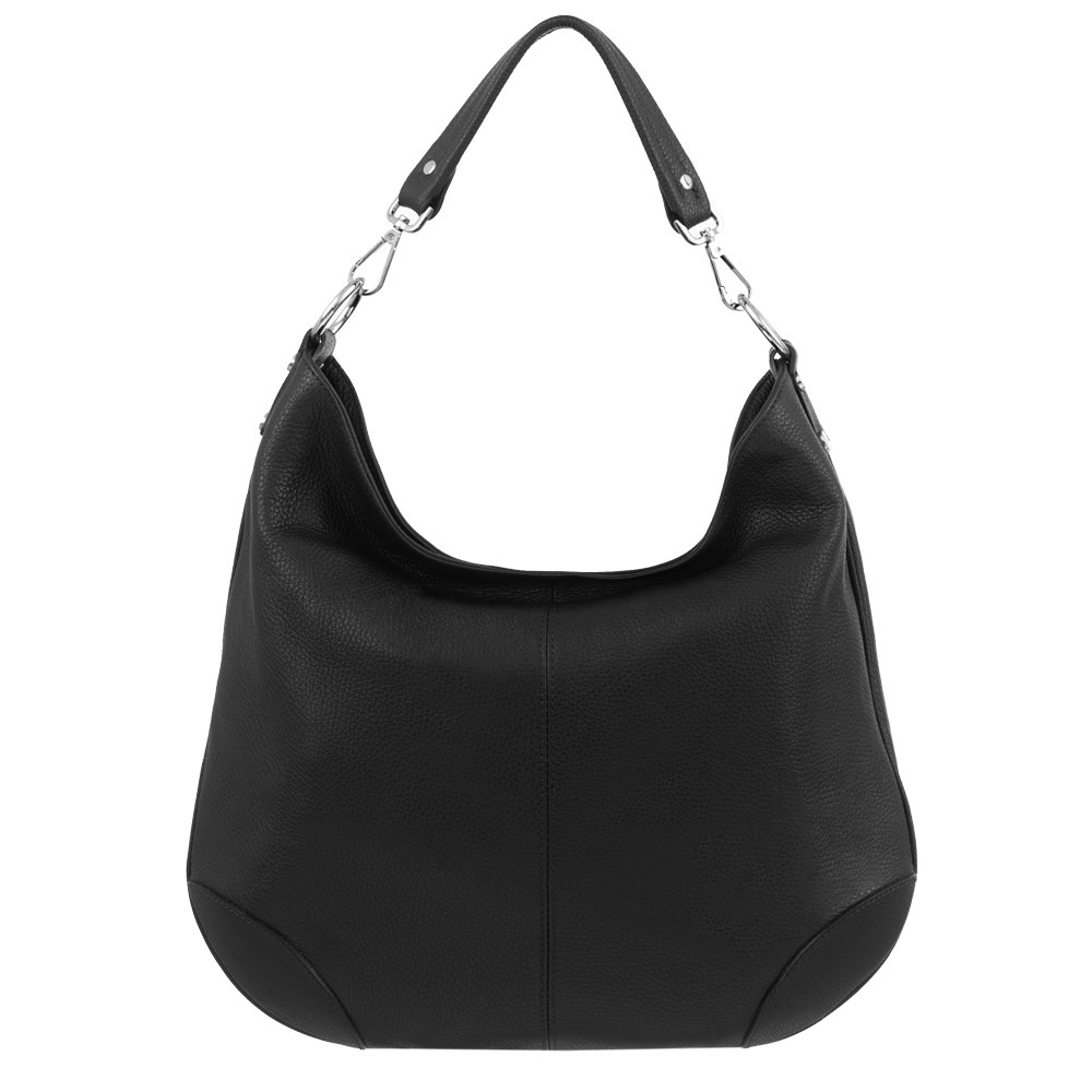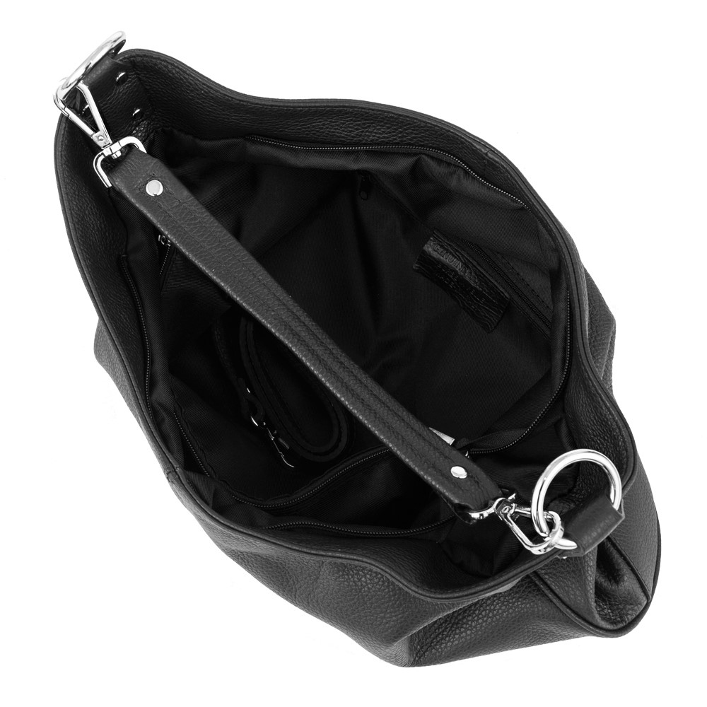 Vera Pelle - Włoska pojemna A4 miękka skórzana torebka worek wykonana z wysokogatunkowej miękkiej naturalnej skóry dolaro. Zamykana od góry na zamek na całej szerokości. Torebka dwukomorowa przedzielona dużą kieszenią na zamek + wewnątrz dodatkowo jedna kieszonka na zamek, kieszonka na telefon + kieszonka na klucze, drobiazgi. Wnętrze wykończone trwałą, materiałową podszewką. Z tyłu torebki kieszonka na zamek. Możliwość całkowitego wypięcia ucha. dzięki karabińczykom. Miękkie ucho umożliwia wygodne noszenie na ramieniu lub w dłoni. Elementy wykończenia w kolorze srebrnym. W komplecie dodatkowy długi pasek o długości max. 118 cm