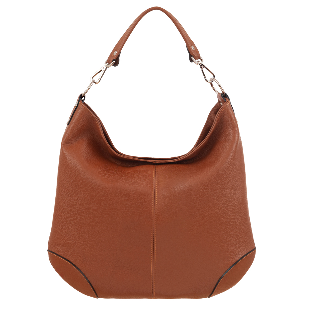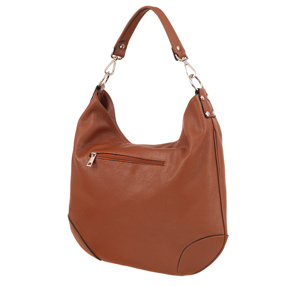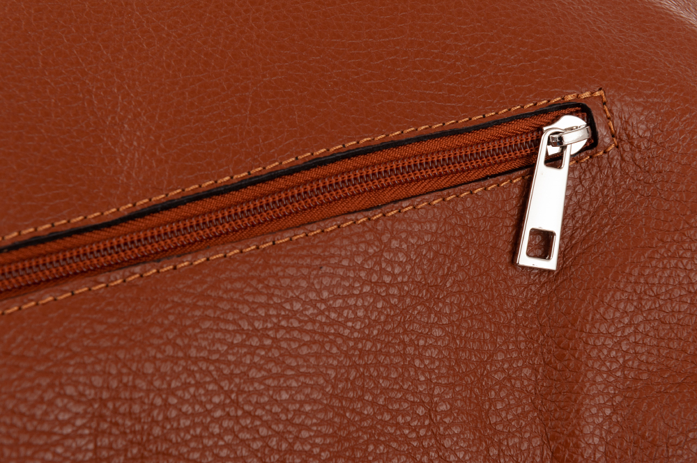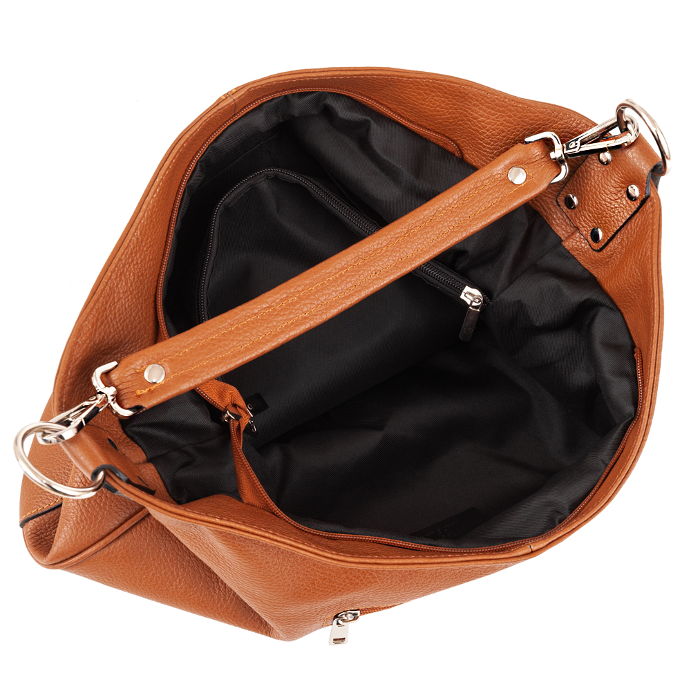 Vera Pelle - Włoska pojemna A4 miękka skórzana torebka worek wykonana z wysokogatunkowej miękkiej naturalnej skóry dolaro. Zamykana od góry na zamek na całej szerokości. Torebka dwukomorowa przedzielona dużą kieszenią na zamek + wewnątrz dodatkowo jedna kieszonka na zamek, kieszonka na telefon + kieszonka na klucze, drobiazgi. Wnętrze wykończone trwałą, materiałową podszewką. Z tyłu torebki kieszonka na zamek. Możliwość całkowitego wypięcia ucha. dzięki karabińczykom. Miękkie ucho umożliwia wygodne noszenie na ramieniu lub w dłoni. Elementy wykończenia w kolorze srebrnym. W komplecie dodatkowy długi pasek o długości max. 118 cm