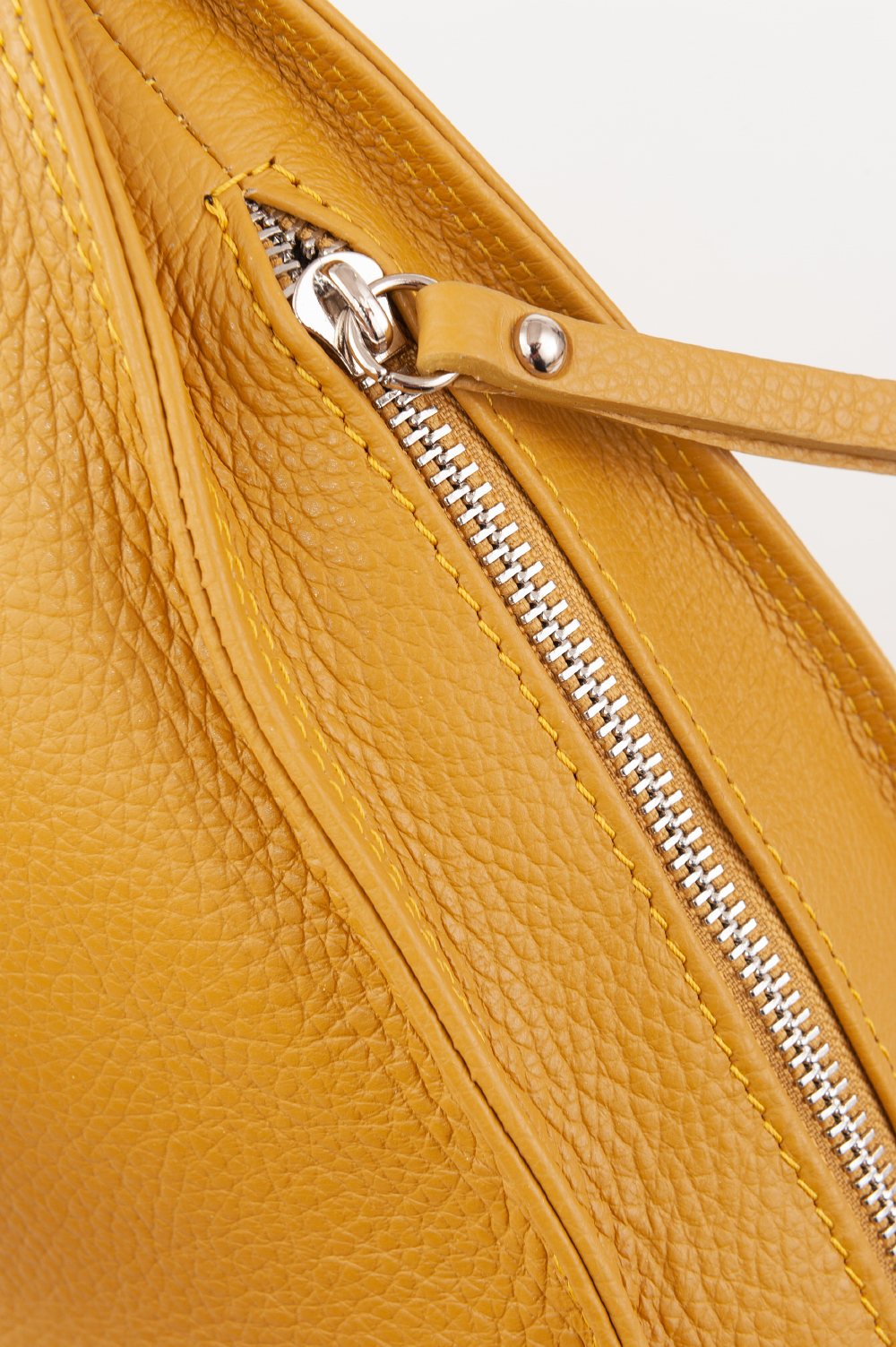 Vera Pelle - Włoska pojemna miękka skórzana torebka worek wykonana z wysokogatunkowej naturalnej skóry dolaro. Zamykana od góry na zamek na całej szerokości. Torebka trzykomorowa, na środku duża komora z kieszonką na zamek + kieszonka na telefon + kieszeń na klucze, drobiazgi. Wnętrze wykończone trwałą, materiałową podszewką. Boczne komory zamykane na magnes. Kieszonki po obu bokach torebki. Miękkie ucho umożliwia wygodne noszenie na ramieniu lub przez ramię jako listonoszka. Metalowe elementy wykończenia w kolorze srebrnym.