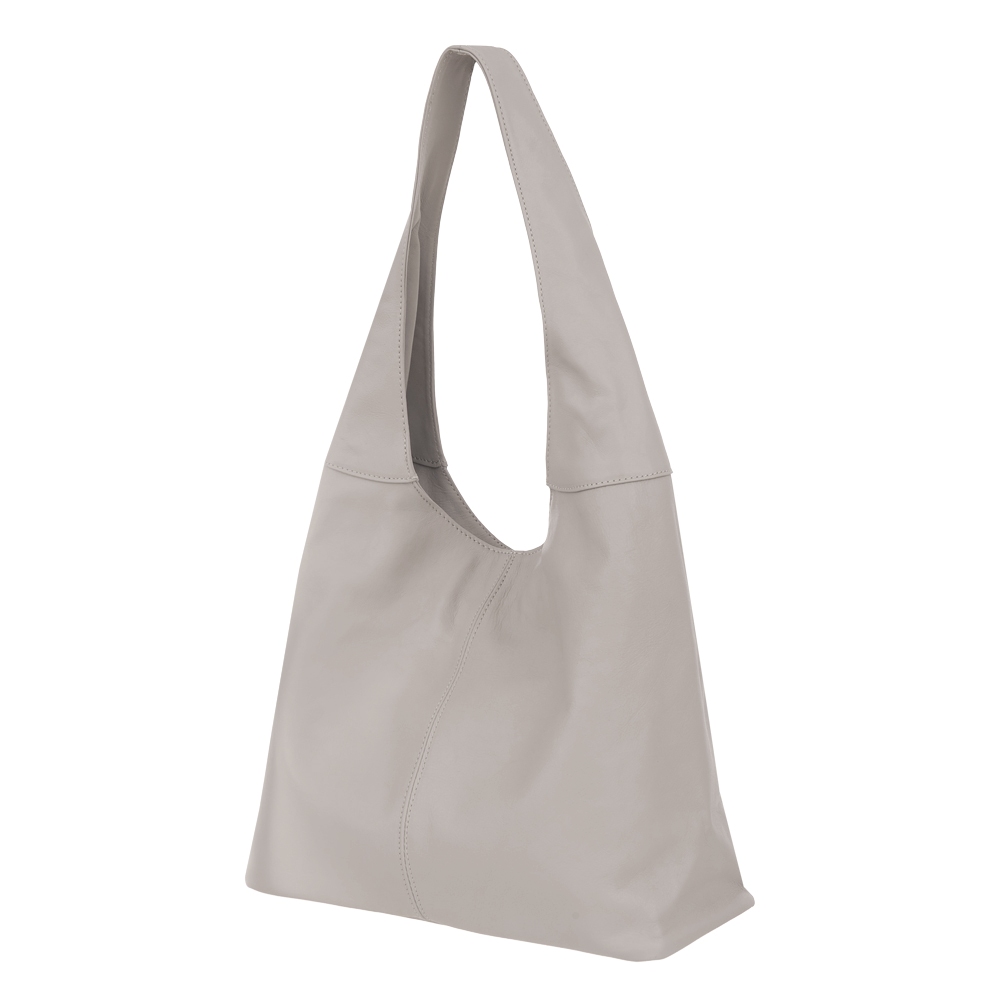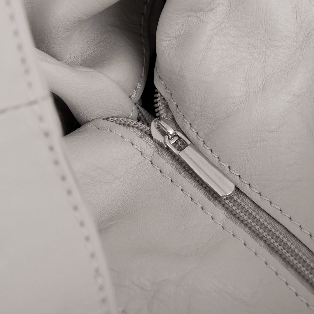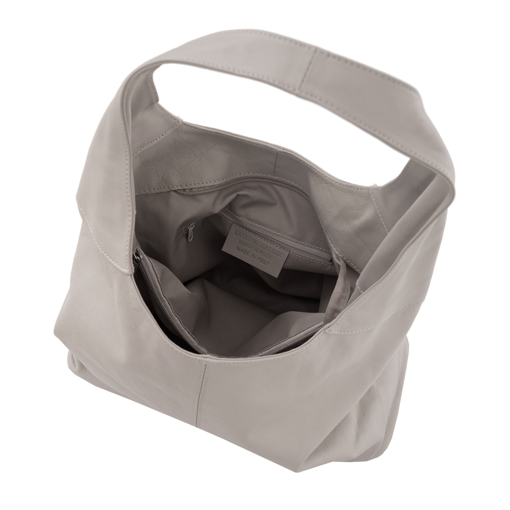 Włoska skórzana torebka / worek wykonana z wysokogatunkowej naturalnej miękkiej skóry cielęcej. Zamykana z góry na suwak. Torebka dwukomorowa przedzielona na środku dużą kieszenią na suwak + wewnątrz jedna kieszonka na zamek oraz jedna na telefon. Wnętrze wykończone trwałą, czarną podszewką. Szerokie ucho umożliwia wygodne noszenie torebki na ramieniu.