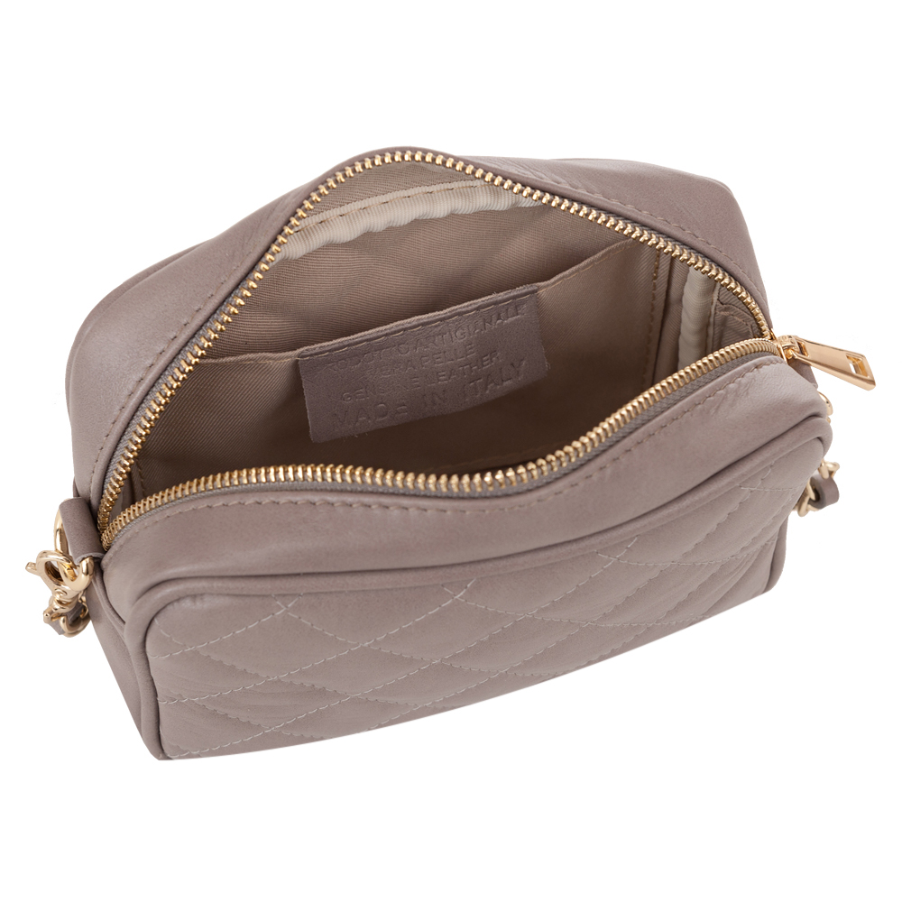 Włoska skórzana pikowana listonoszka wykonana z wysokogatunkowej naturalnej gładkiej skóry cielęcej VERA PELLE. Zamykana z góry na suwak. Torebka jednokomorowa, wewnątrz jedna kieszonka. Wnętrze wykończone trwałą podszewką. Elementy wykończenia w kolorze złotym. Pasek przepleciony naturalną skórą, z możliwością całkowitego odpięcia, dzięki czemu torebkę można nosić jako elegancką kopertówkę.
