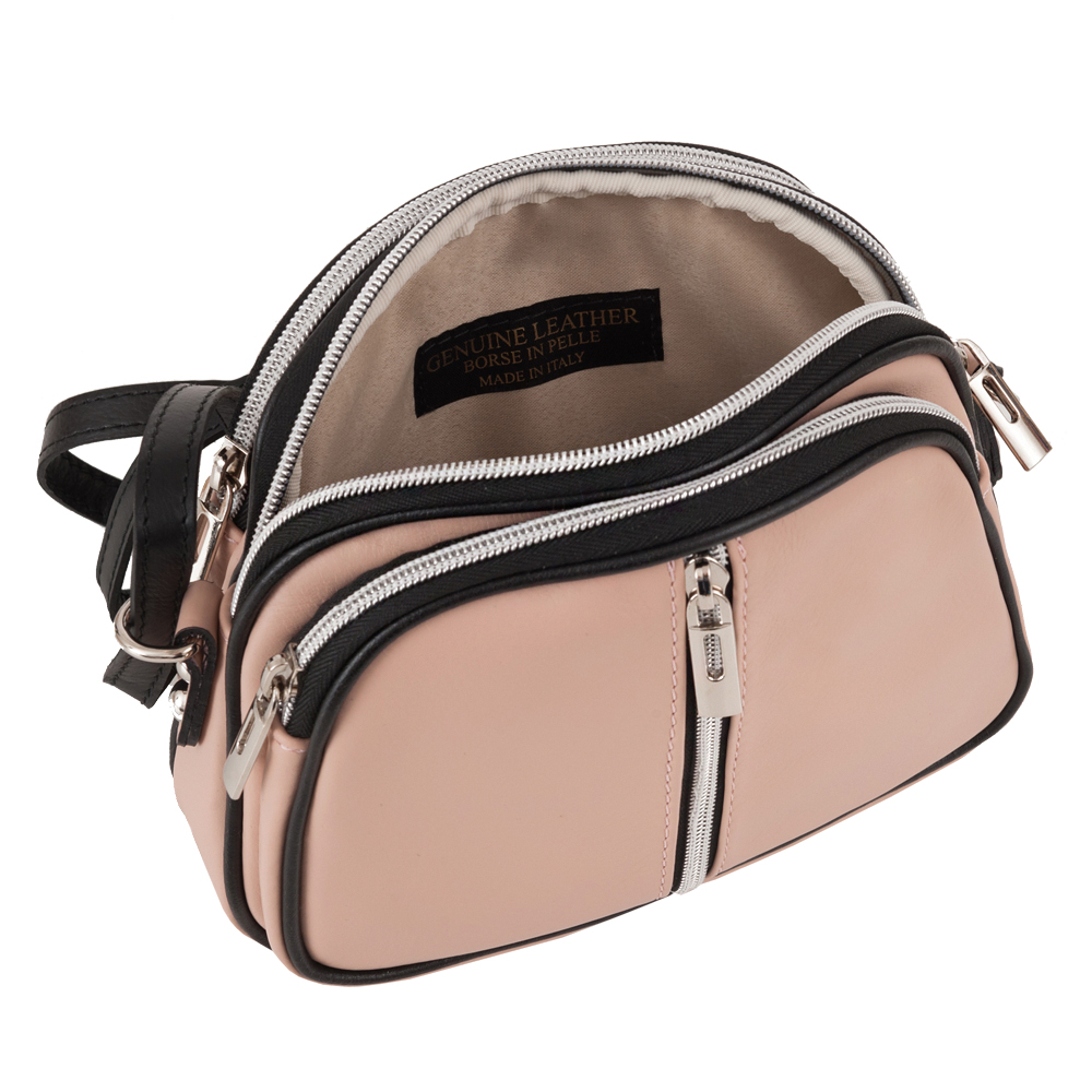 Włoska skórzana listonoszka wykonana z wysokogatunkowej naturalnej gładkiej skóry cielęcej. Zamykana z góry na suwaki. Trzy osobne przegródki zamykane na suwak + pionowa kieszonka na suwak z przodu. Wnętrze wykończone trwałą podszewką. Długi, regulowany pasek umożliwia wygodne noszenie na ramieniu.