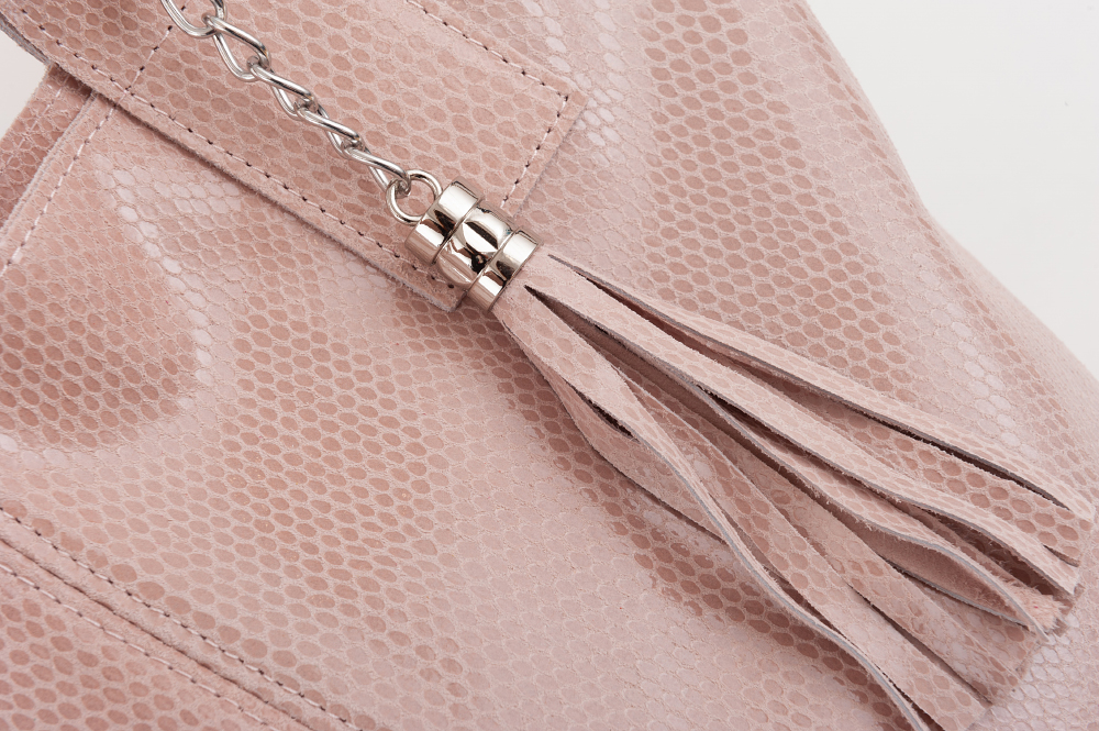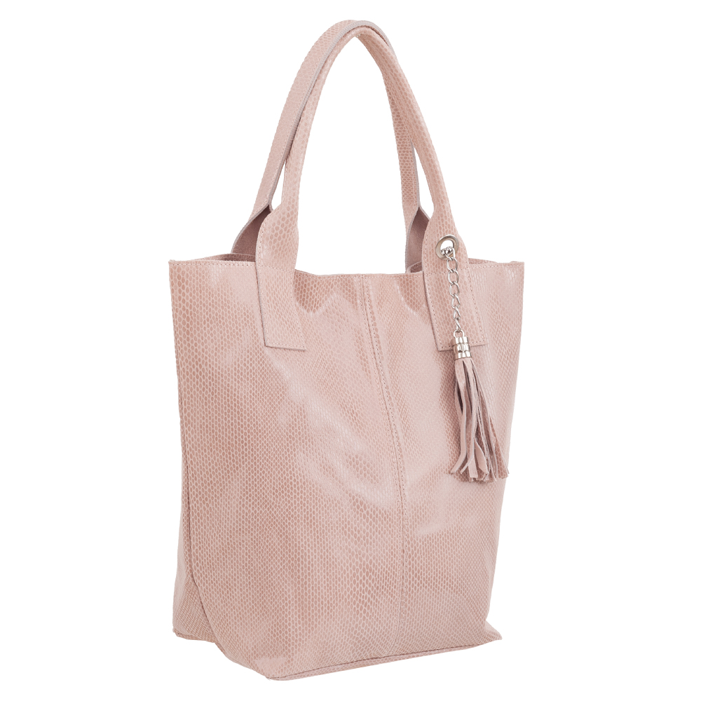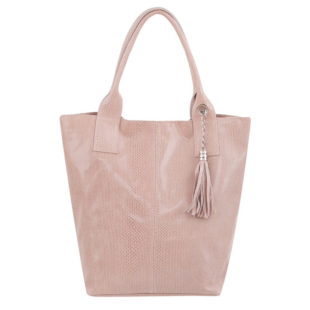 VERA PELLE Włoska skórzana torebka / worek wykonana z miękkiej, lejącej, wysokogatunkowej naturalnej lakierowanej skóry o fakturze ŁUSKI. Bardzo oryginalny i praktyczny model. Zamykana z góry na magnes. W środku duża komora wykończona surową skóra naturalną. W środku saszetka zamykana na suwak. Elementy wykończenia w kolorze srebrnym. Modny pęk frędzli z przodu torebki.