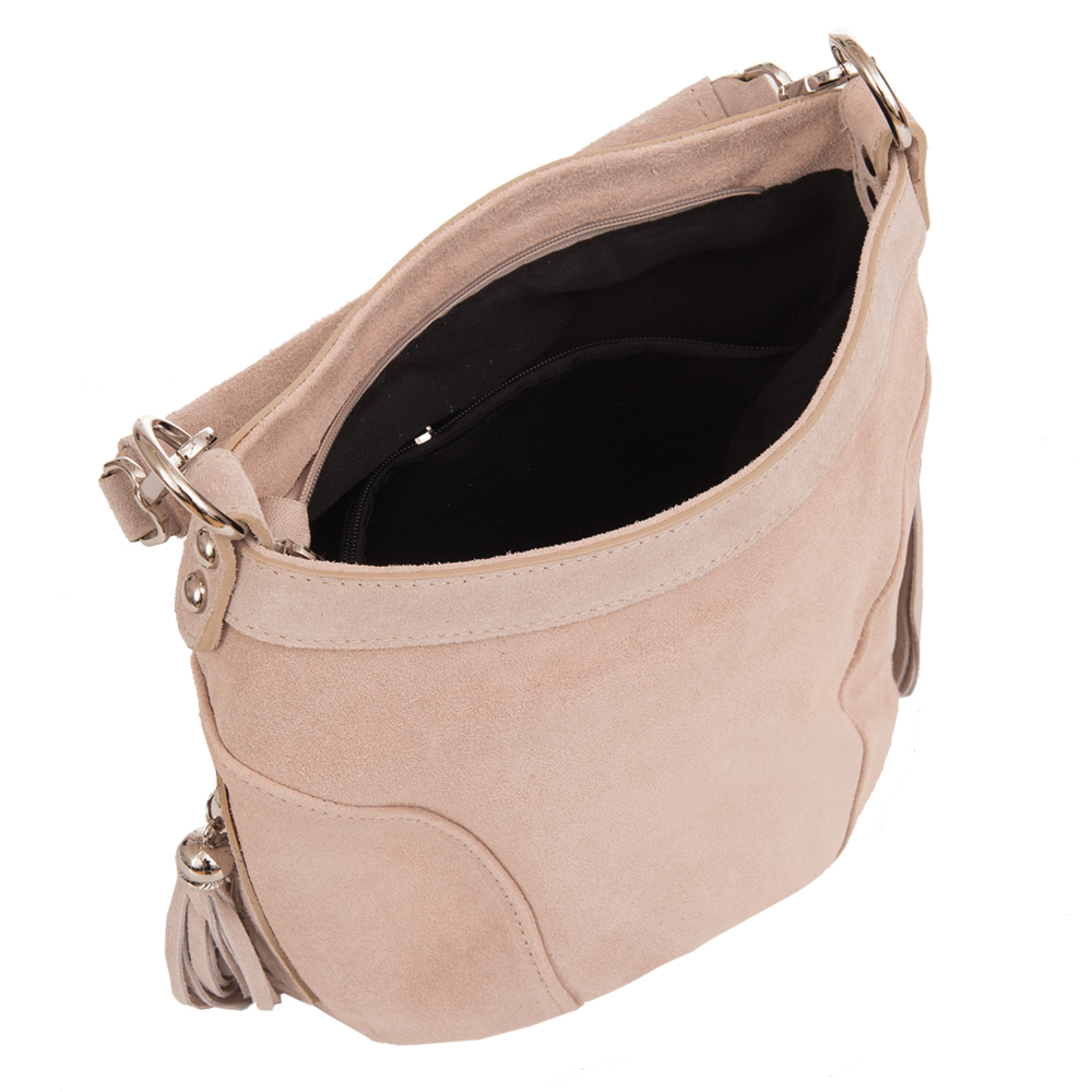 Włoska skórzana torebka worek wykonana w 100% z miękkiej, naturalnej skóry zamszowej. Zamykana z góry na suwak. Torebka dwukomorowa przedzielona dużą kieszenią na suwak. Wewnątrz jedna kieszonka na zamek, jedna na telefon + dodatkowa kieszeń. Dodatkowo z tyłu i po bokach kieszonki na suwak. Wnętrze wykończone trwałą, materiałową podszewką. Dodatkowy pasek o długości do 109 cm. Możliwość całkowitego wypięcia krótszego ucha.