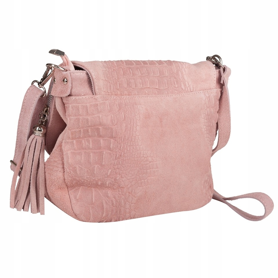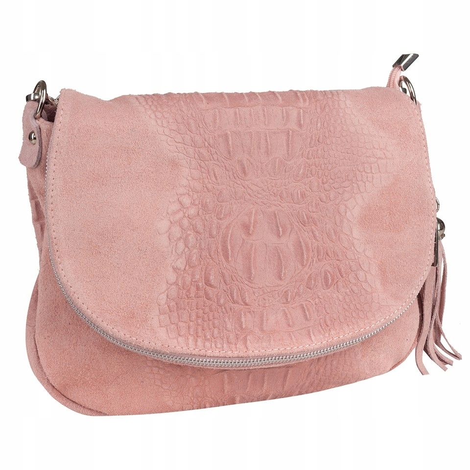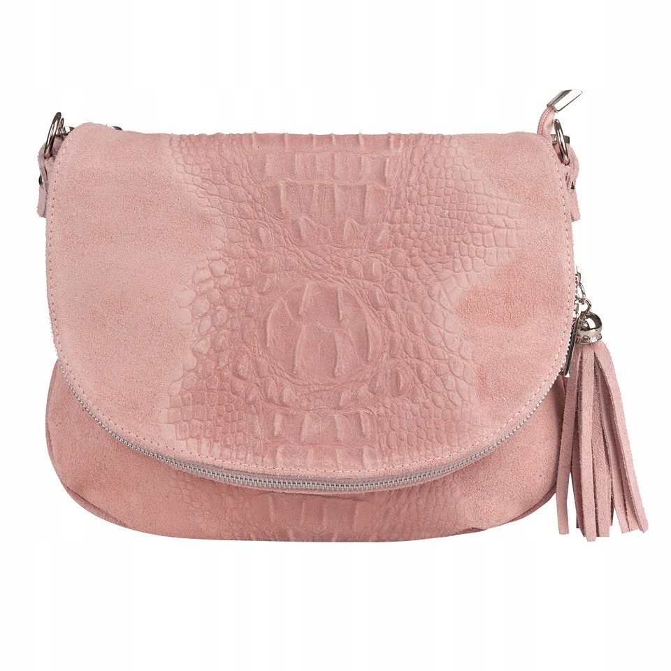 Vera Pelle - Włoska pojemna, modna skórzana listonoszka wykonana z wysokogatunkowej naturalnej skóry z motywem łuski krokodyla łączonej z gładkim zamszem naturalnym. Zamykana na dużą klapę na magnes + suwak. Torebka jednokomorowa, wewnątrz jedna kieszonka na zamek. Wnętrze wykończone trwałą, materiałową podszewką w kolorze czarnym. Długi, regulowany pasek umożliwia wygodne noszenie na ramieniu. Dodatkowa kieszeń w klapie torebki na suwak. Elementy wykończenia w kolorze srebrnym.