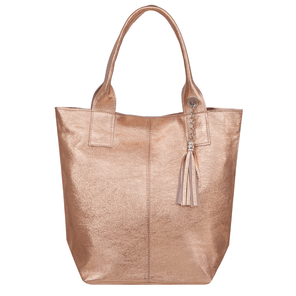 VERA PELLE Włoska skórzana torebka / worek wykonana z miękkiej, wysokogatunkowej naturalnej lakierowanej skóry. Bardzo oryginalny i praktyczny model. Zamykana z góry na zamek. W środku duża komora wykończona podszewką + kieszonka na zamek + saszetka zamykana na suwak. Metalowe elementy wykończenia w kolorze srebrnym. Modny pęk frędzli z przodu torebki.