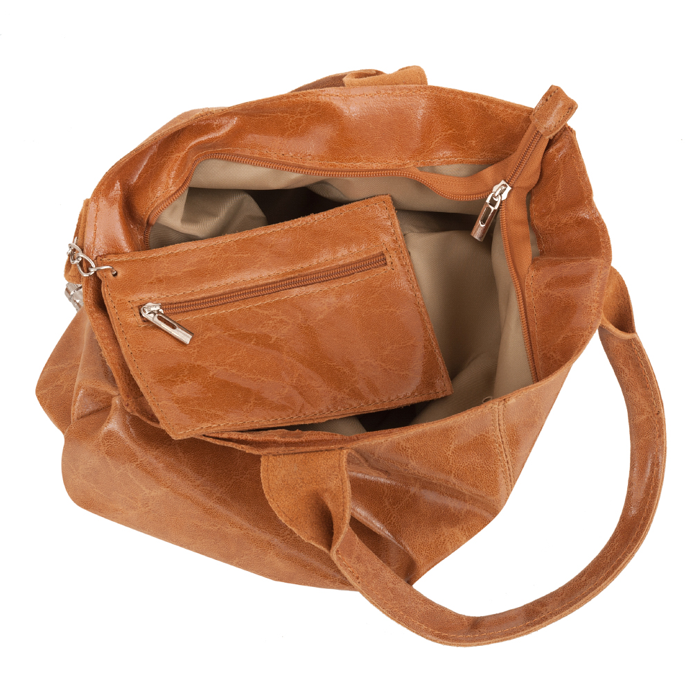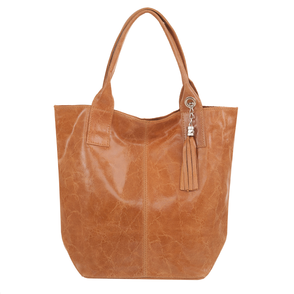 VERA PELLE Włoska skórzana torebka / worek wykonana z miękkiej, lejącej, wysokogatunkowej naturalnej lakierowanej skóry. Bardzo oryginalny i praktyczny model. Zamykana z góry na zamek. W środku duża komora wykończona mocną materiałową podszewką. W środku saszetka zamykana na suwak + kieszonka na zamek. Elementy wykończenia w kolorze srebrnym. Modny pęk frędzli z przodu torebki. Swobodnie można nosić ją w dłoni, przedramieniu jak i na ramieniu.