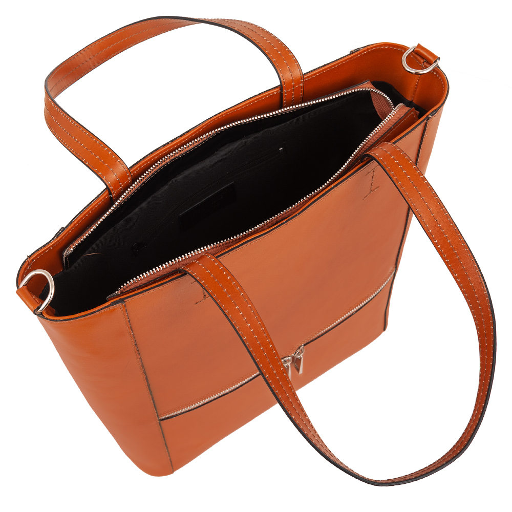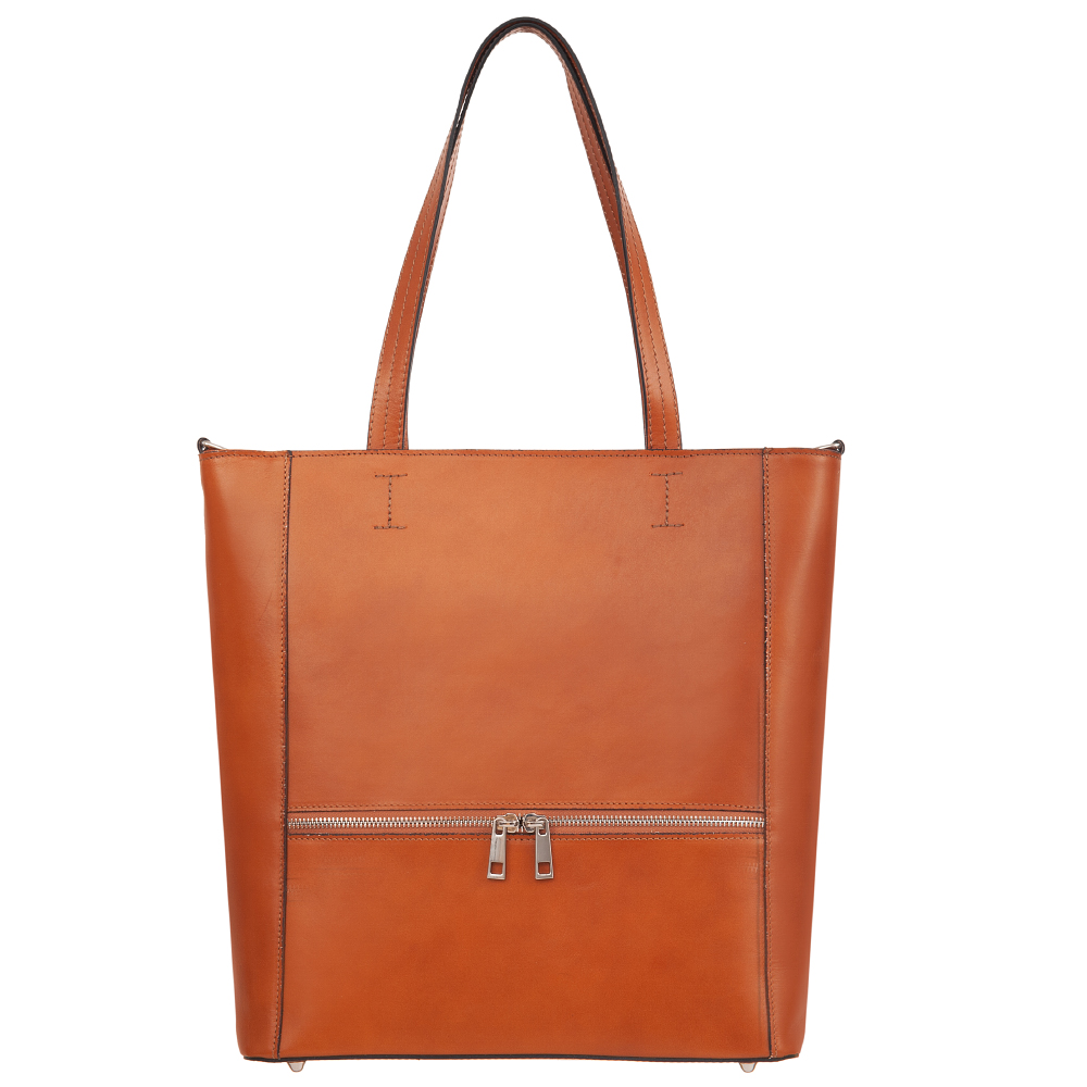 Włoska ekskluzywna A4 pojemna skórzana torebka wykonana z wysokogatunkowej naturalnej skóry licowej najwyższej jakości. Wygodny dostęp do środka, zamykana na zamek na całej szerokości. Torebka jednokomorowa, wewnątrz kieszonka na telefon + kieszonka na zamek. Torebka od środka wykończona porządną, czarną materiałowa podszewką. Od spodu torebka podbita metalowymi nóżkami. W komplecie dodatkowy długi, regulowany pasek o długości max. 125 cm. Metalowe elementy w kolorze srebrnym.