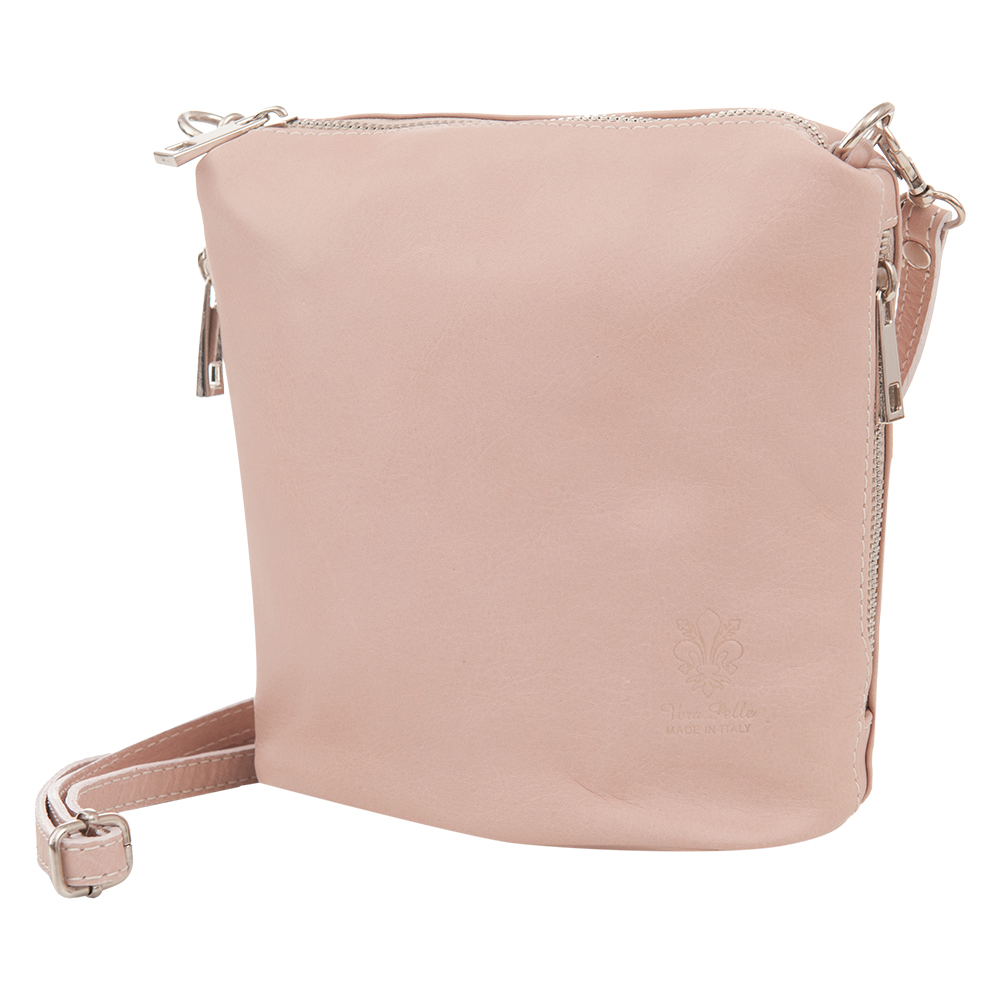 Vera Pelle - włoska modna, skórzana torebka wykonana z wysokogatunkowej mięciutkiej naturalnej skóry cielęcej. Zamykana z góry na suwak. Spód torebki lekko usztywniony. Torebka jednokomorowa, wewnątrz jedna kieszonka na zamek + kieszeń na telefon. Wnętrze wykończone trwałą, ciemną podszewką. Po bokach kieszonki pionowe na suwak. Pasek o długości 100 cm umożliwia wygodne noszenie na ramieniu. W komplecie krótki pasek do noszenia w ręce o długości 37 cm. Oba paski można odpiąć od torebki.