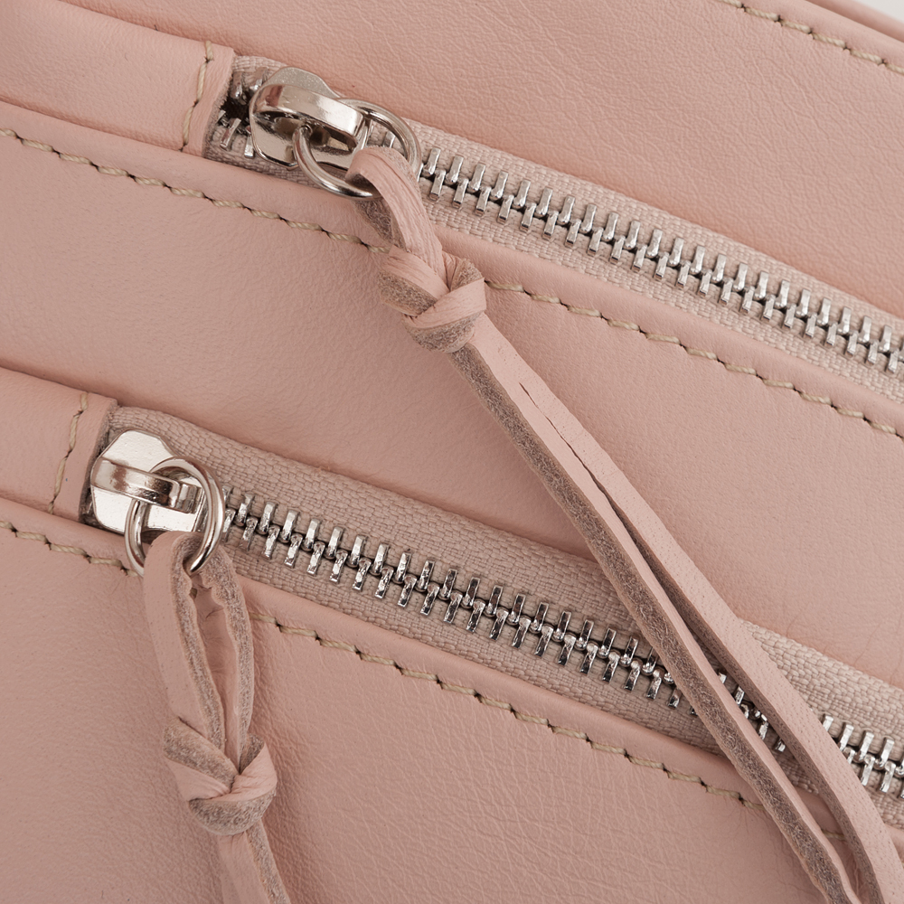 Vera Pelle - włoska modna, skórzana torebka wykonana z wysokogatunkowej mięciutkiej naturalnej skóry cielęcej. Zamykana z góry na suwak. Spód torebki lekko usztywniony. Torebka jednokomorowa, wewnątrz jedna kieszonka na zamek. Wnętrze wykończone trwałą, czarną podszewką. Z przodu dwie kieszonki na suwak + z tyłu dodatkowa kieszeń na zamek. Regulowany pasek o długości do 124 cm umożliwia wygodne noszenie na ramieniu lub przez ramię. Elementy wykończenia w kolorze srebrnym.