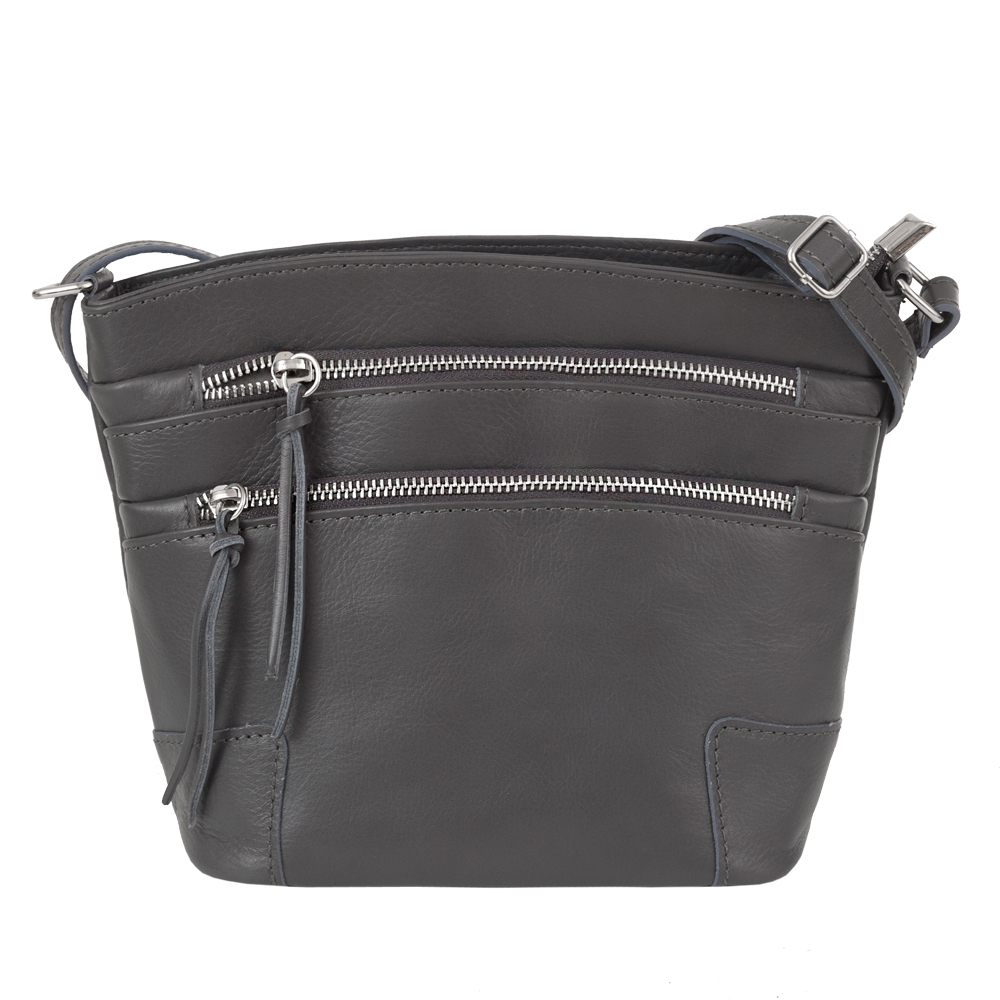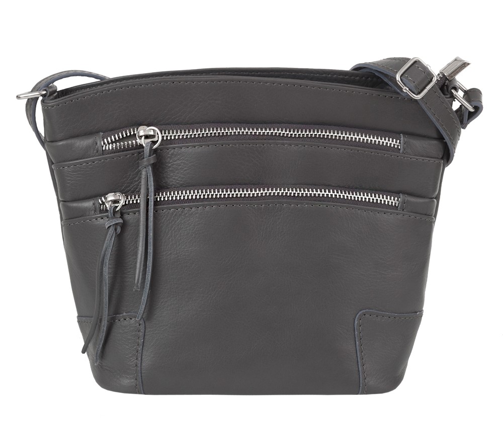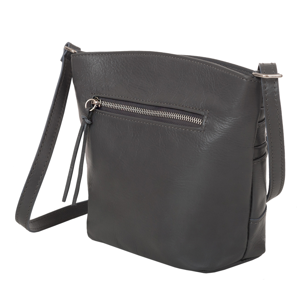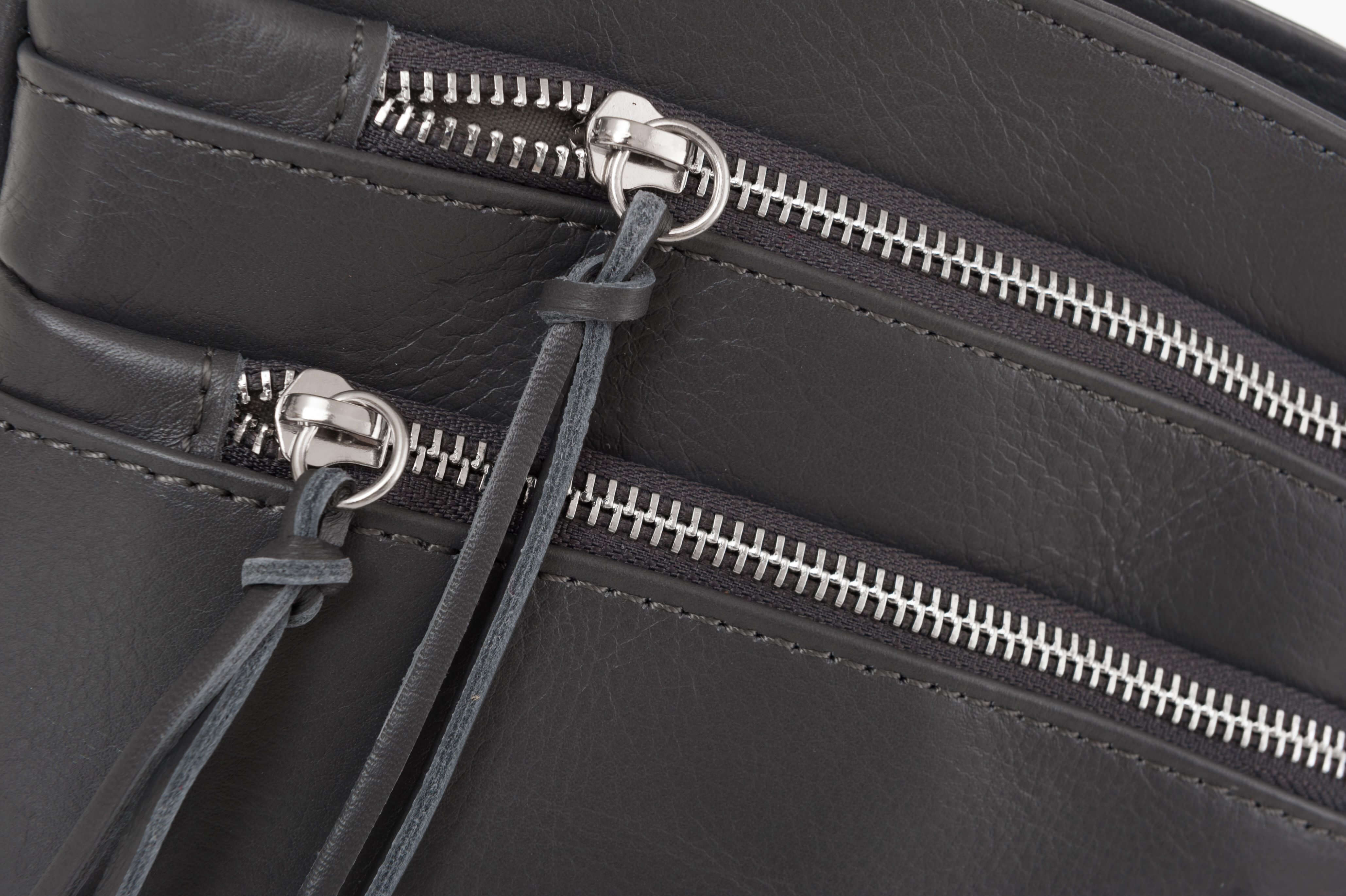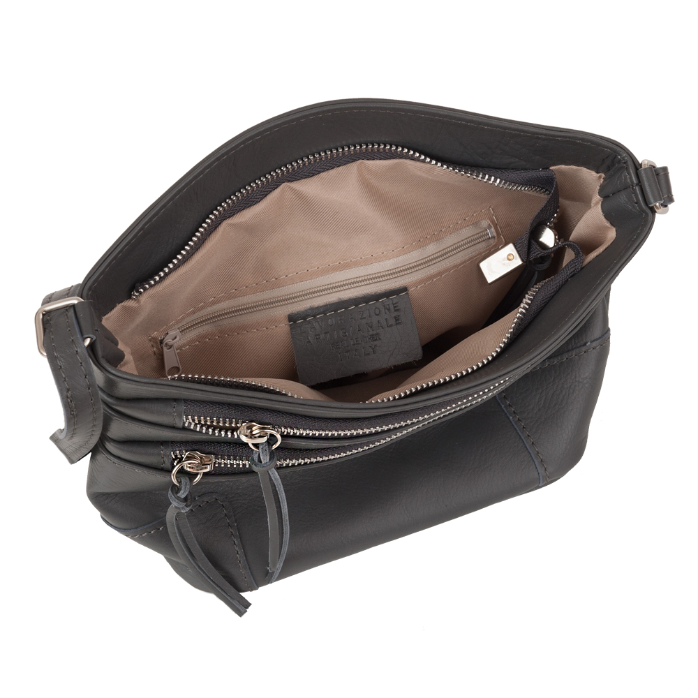 Vera Pelle - włoska modna, skórzana torebka wykonana z wysokogatunkowej mięciutkiej naturalnej skóry cielęcej. Zamykana z góry na suwak. Spód torebki lekko usztywniony. Torebka jednokomorowa, wewnątrz jedna kieszonka na zamek. Wnętrze wykończone trwałą, czarną podszewką. Z przodu dwie kieszonki na suwak + z tyłu dodatkowa kieszeń na zamek. Regulowany pasek o długości do 134 cm umożliwia wygodne noszenie na ramieniu lub przez ramię. Elementy wykończenia w kolorze srebrnym.