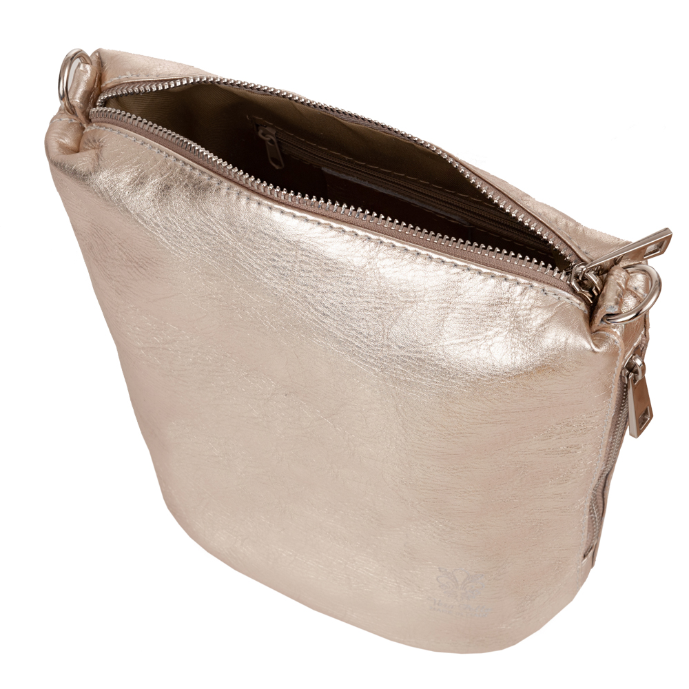 Vera Pelle - włoska modna, skórzana torebka wykonana z wysokogatunkowej mięciutkiej naturalnej skóry cielęcej. Zamykana z góry na suwak. Spód torebki lekko usztywniony. Torebka jednokomorowa, wewnątrz jedna kieszonka na zamek + kieszeń na telefon. Wnętrze wykończone trwałą podszewką. Po bokach kieszonki pionowe na suwak. Pasek o długości 130 cm umożliwia wygodne noszenie na ramieniu lub przez ramię. W komplecie krótki pasek do noszenia w ręce o długości 37 cm. Oba paski można odpiąć od torebki.