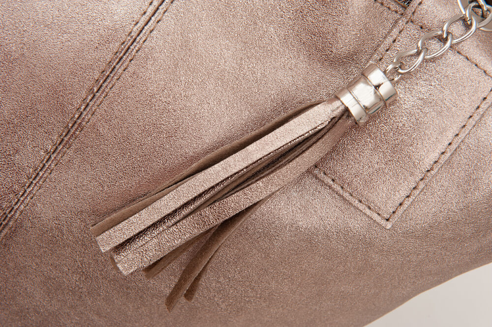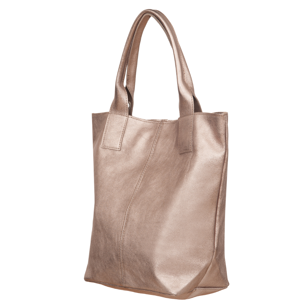 VERA PELLE Włoska skórzana torebka / worek wykonana z miękkiej, wysokogatunkowej naturalnej metalizowanej skóry. Bardzo oryginalny i praktyczny model. Zamykana z góry na zamek. W środku duża komora wykończona podszewką + kieszonka na zamek + saszetka zamykana na suwak. Metalowe elementy wykończenia w kolorze srebrnym. Modny pęk frędzli z przodu torebki.