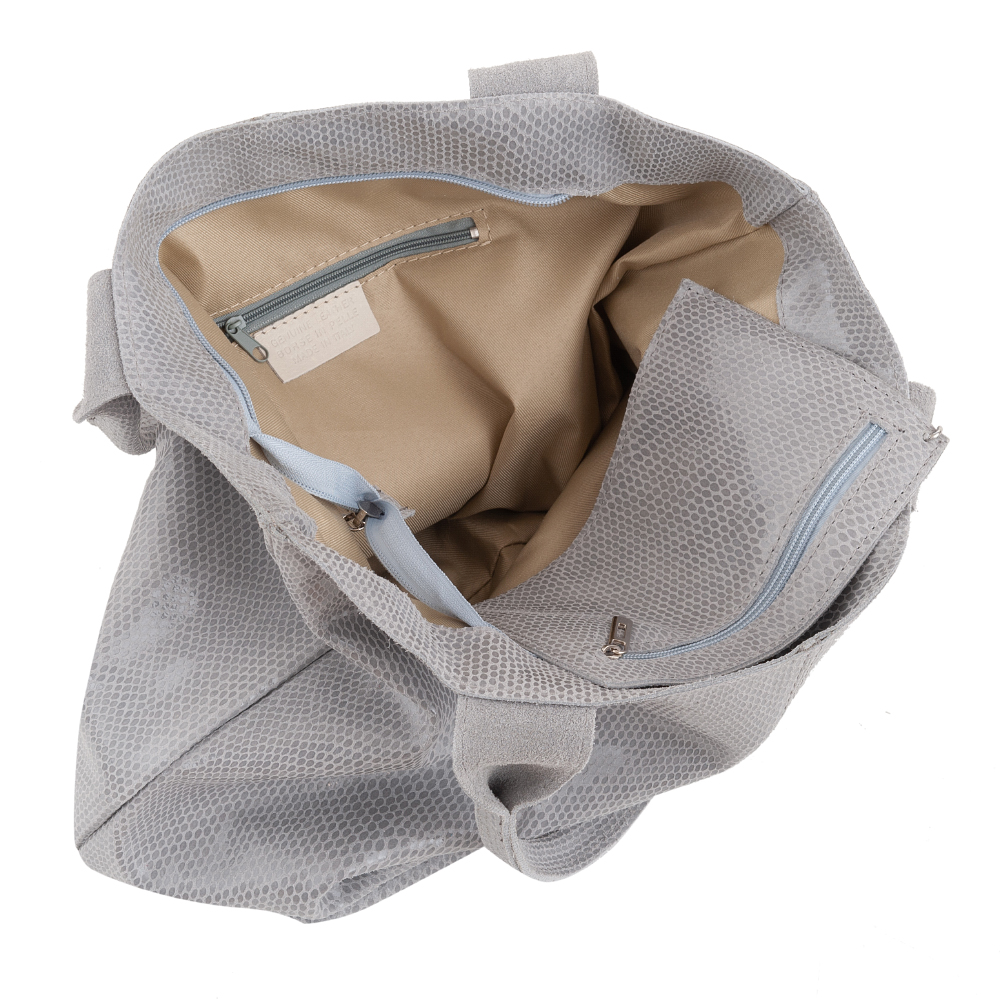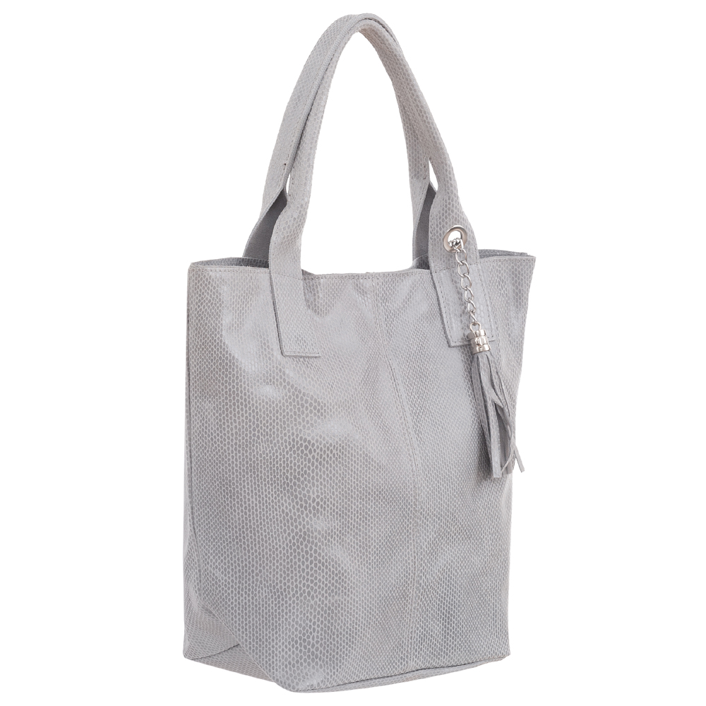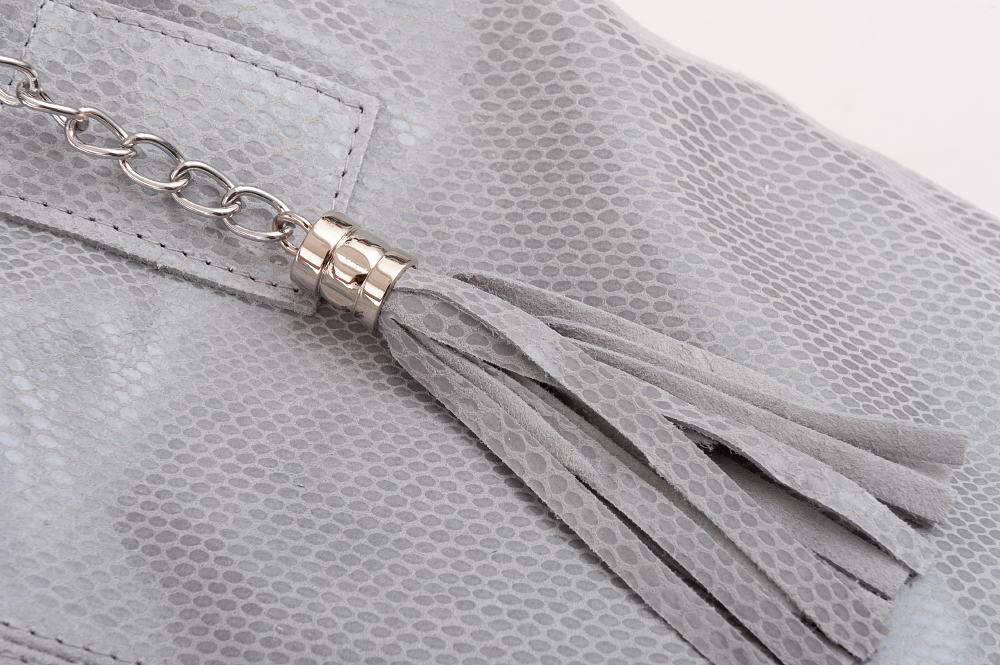 VERA PELLE Włoska skórzana torebka / worek wykonana z miękkiej, lejącej, wysokogatunkowej naturalnej lakierowanej skóry o fakturze ŁUSKI. Bardzo oryginalny i praktyczny model. Zamykana z góry na magnes. W środku duża komora wykończona surową skóra naturalną. W środku saszetka zamykana na suwak. Elementy wykończenia w kolorze srebrnym. Modny pęk frędzli z przodu torebki.