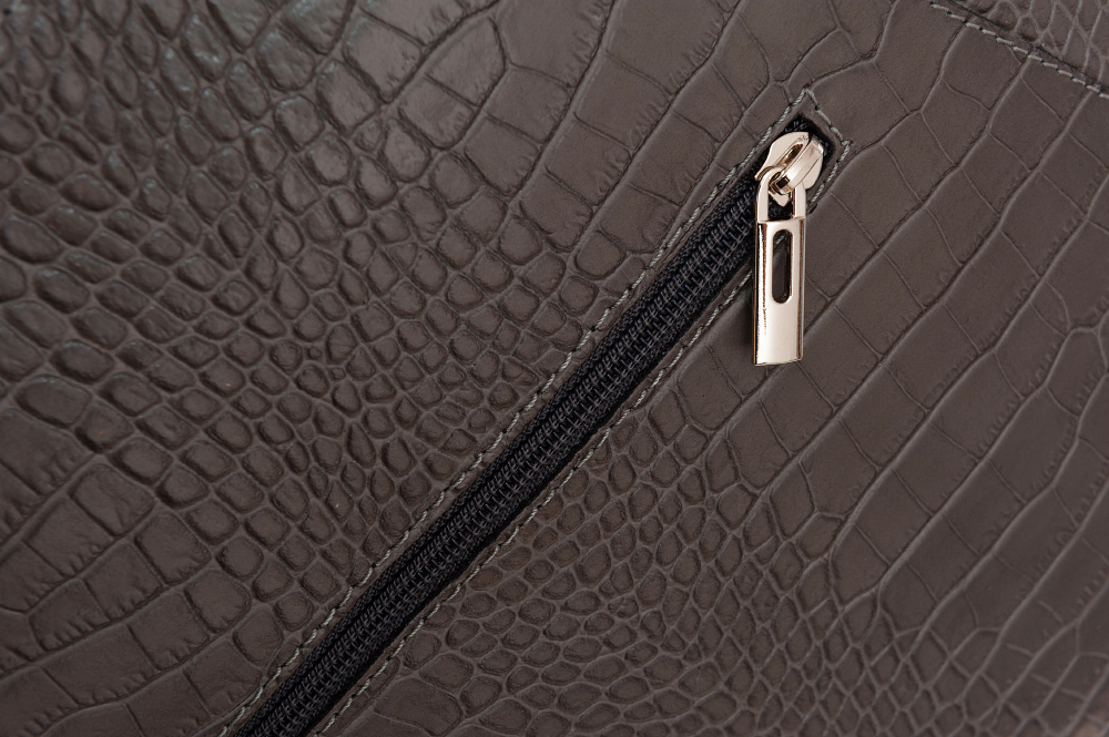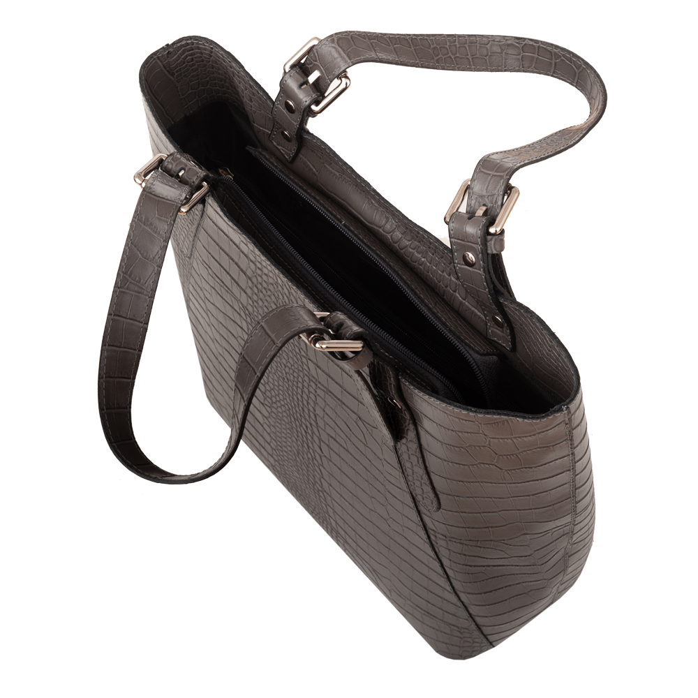VERA PELLE włoska modna skórzana A4 torebka wykonana z wysokogatunkowej naturalnej skóry z motywem wężowym, łuski krokodyla. Wygodny dostęp do środka. Torebka dwukomorowa, od góry zamykana na suwak. Wewnątrz kieszonka na telefon + kieszonka na zamek + duża kieszeń na środku dzieląca torebkę na 2 komory. Torebka od środka wykończona porządną, materiałową podszewką. Elementy wykończenia w kolorze srebrnym. Z tyłu kieszeń na suwak. Uszy z możliwością regulacji długości. Dno usztywnione i podbite nóżkami, aby nie niszczył się spód.