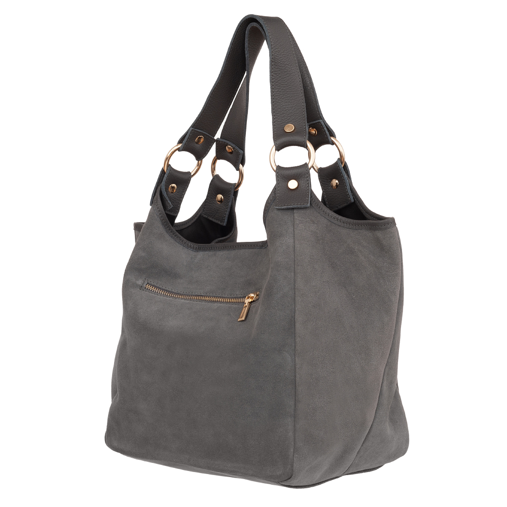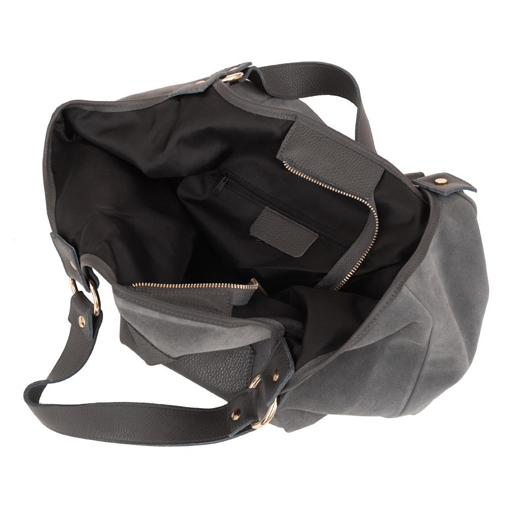 VERA PELLE włoska modna i pojemna skórzana A4 torebka wykonana z wysokogatunkowej naturalnej skóry zamszowej łącznej ze skórą licową. Wygodny dostęp do środka. Torebka jednokomorowa, od góry zamykana na krótki zamek. Wewnątrz kieszonka na zamek + duża kieszeń z przodu na magnes + kieszonka na zamek z tyłu torebki. Torebka od środka wykończona porządną materiałową podszewką w kolorze dopasowanym do skóry. Elementy wykończenia w kolorze złotym. Wygodne szerokie uszy zapewnią wygodę noszenia. W komplecie dodatkowo długi regulowany pasek.