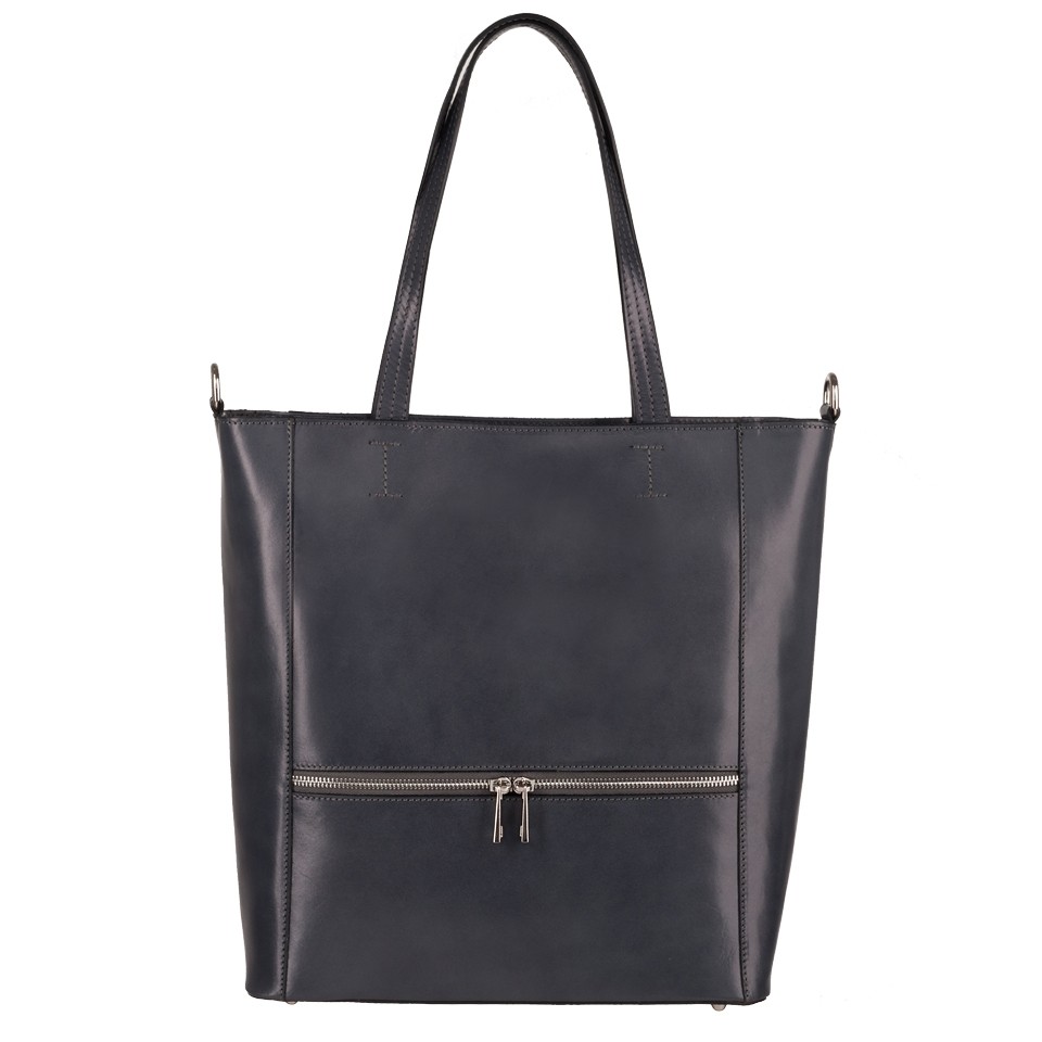 Włoska ekskluzywna A4 pojemna skórzana torebka wykonana z wysokogatunkowej naturalnej skóry licowej najwyższej jakości. Wygodny dostęp do środka, zamykana na zamek na całej szerokości. Torebka jednokomorowa, wewnątrz kieszonka na telefon + kieszonka na zamek. Torebka od środka wykończona porządną, czarną materiałowa podszewką. Od spodu torebka podbita metalowymi nóżkami. W komplecie dodatkowy długi, regulowany pasek o długości max. 125 cm. Metalowe elementy w kolorze srebrnym.