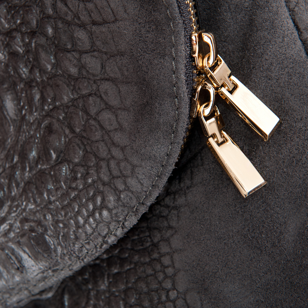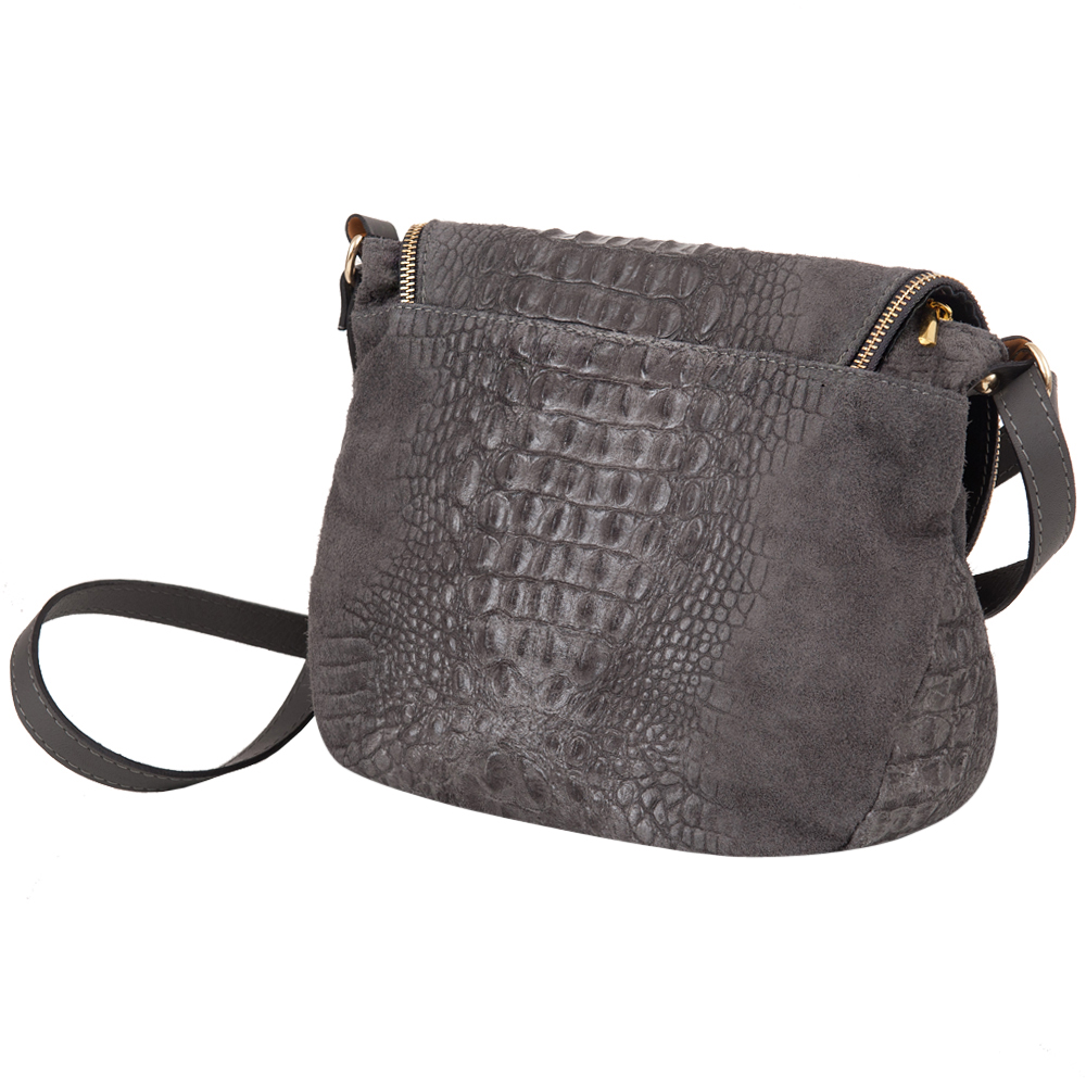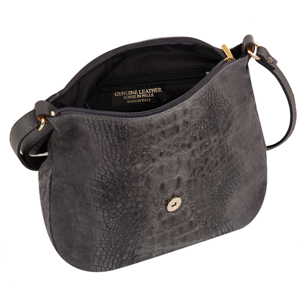 Włoska duża skórzana listonoszka wykonana z wysokogatunkowej naturalnej skóry z motywem krokodyla łączonej z zamszem naturalnym. Zamykana na dużą klapę na magnes + suwak. Torebka jednokomorowa, wewnątrz jedna kieszonka na zamek. Wnętrze wykończone trwałą podszewką. Długi, regulowany pasek umożliwia wygodne noszenie na ramieniu. Dodatkowa kieszeń w klapie torebki na suwak. Elementy wykończenia w kolorze złotym.