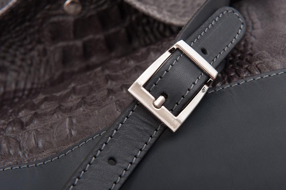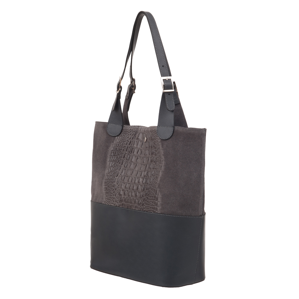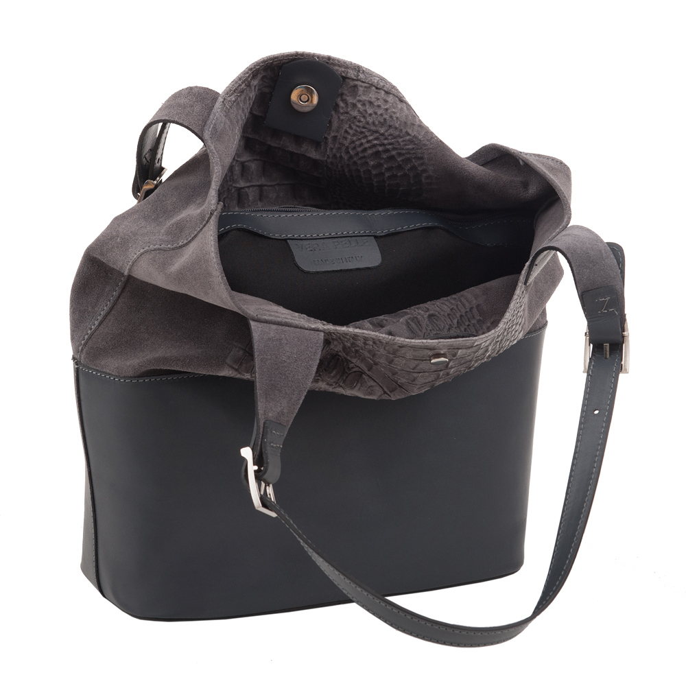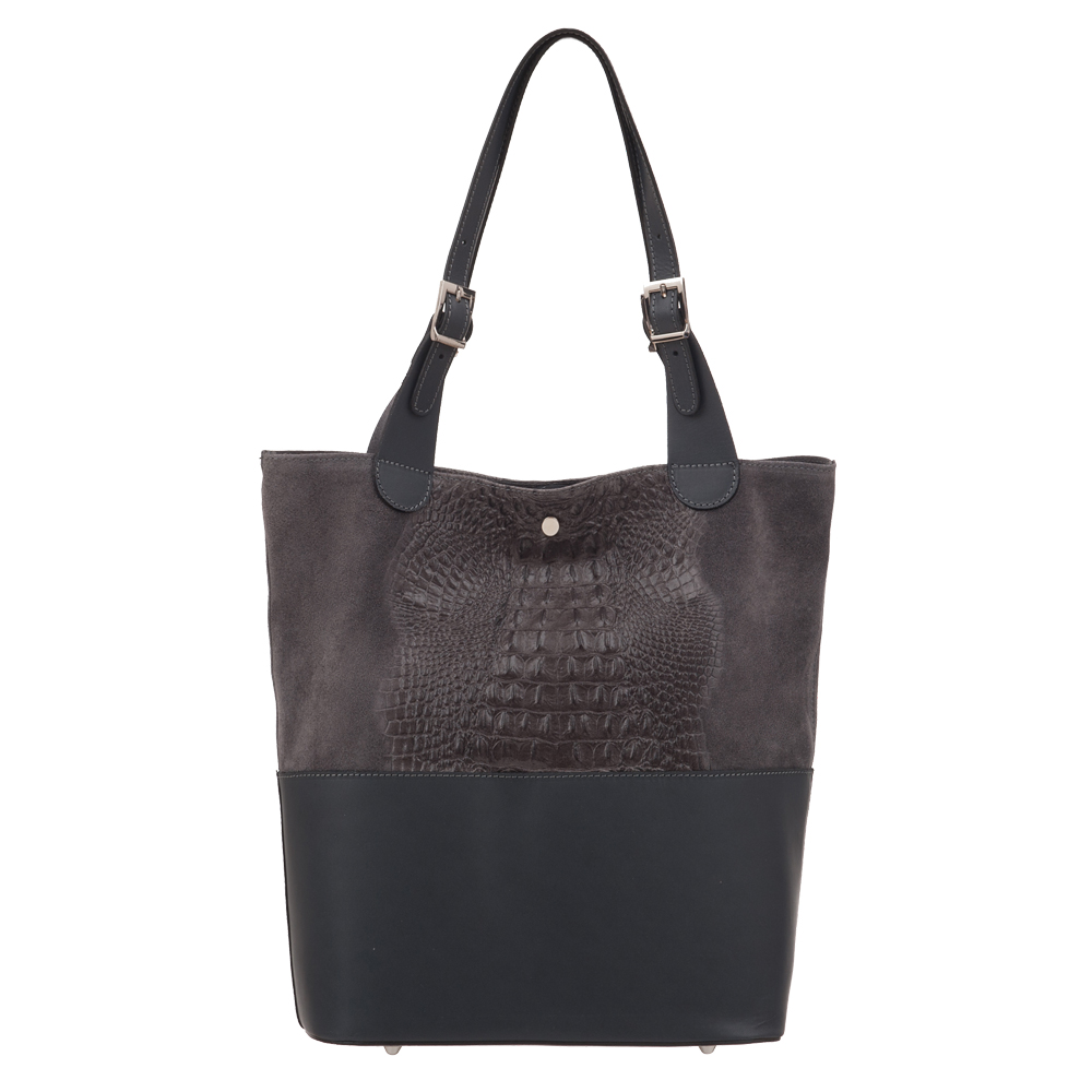 VERA PELLE Włoska skórzana torebka wykonana z wysokogatunkowej naturalnej skóry licowej łączonej z zamszem naturalnym z motywem łuski krokodyla. Zamykana z góry na magnes. W środku duża komora (wkład wyciągany) zamykana na suwak na całej szerokości. Wnętrze torebki wykończone skóra naturalną. Torebka od spodu usztywniona i podbita nóżkami, aby nie niszczyć dna. Uszy regulowane na długość. Elementy wykończenia w kolorze srebrnym. W środku torebki kieszonka na telefon.
