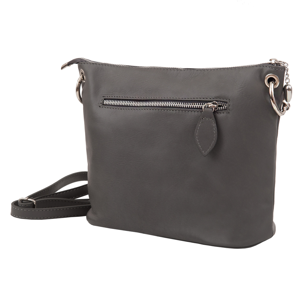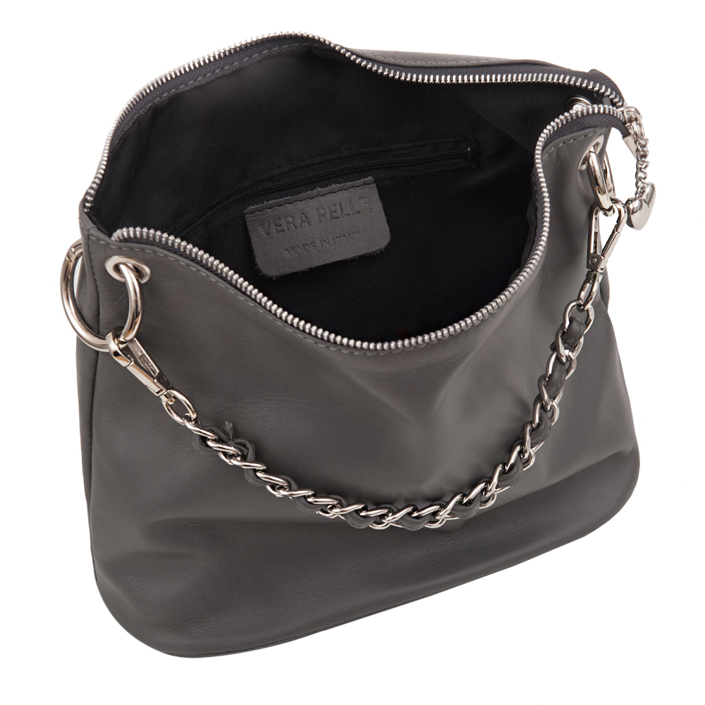 Włoska pojemna miękka skórzana torebka / listonoszka wykonana z naturalnej gładkiej skóry cielęcej. Zamykana od góry na zamek na całej szerokości torebki. Torebka jednokomorowa, wewnątrz jedna kieszonka na zamek + dwie dodatkowe kieszonki. Wnętrze wykończone trwałą, ciemną podszewką. Długi, regulowany pasek umożliwia wygodne noszenie na ramieniu lub przez ramię. Dodatkowa pojemna kieszeń z tyłu na zamek. Elementy wykończenia w kolorze srebrnym. Możliwość noszenia w ręce na łańcuszku ( łańcuszek jest również całkowicie wypinany ). Długi skórzany pasek w komplecie.