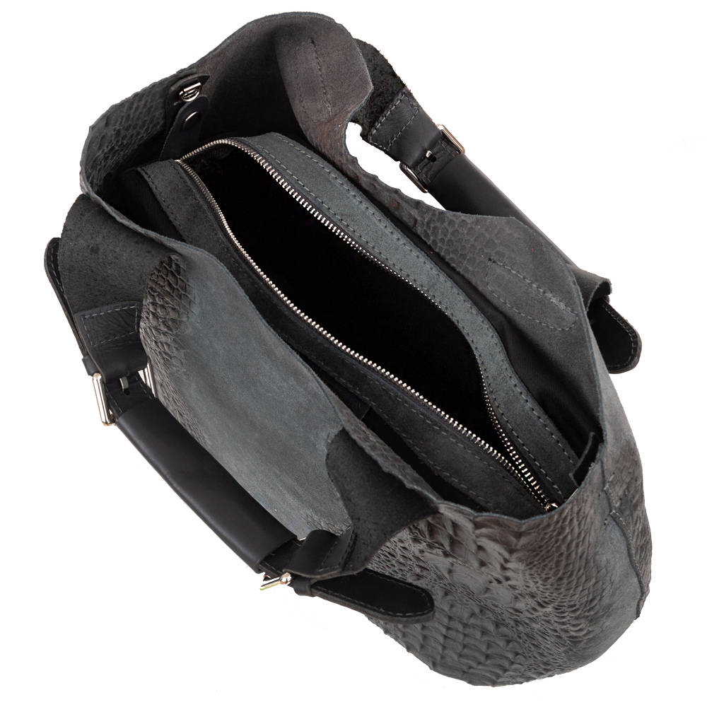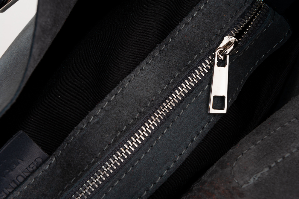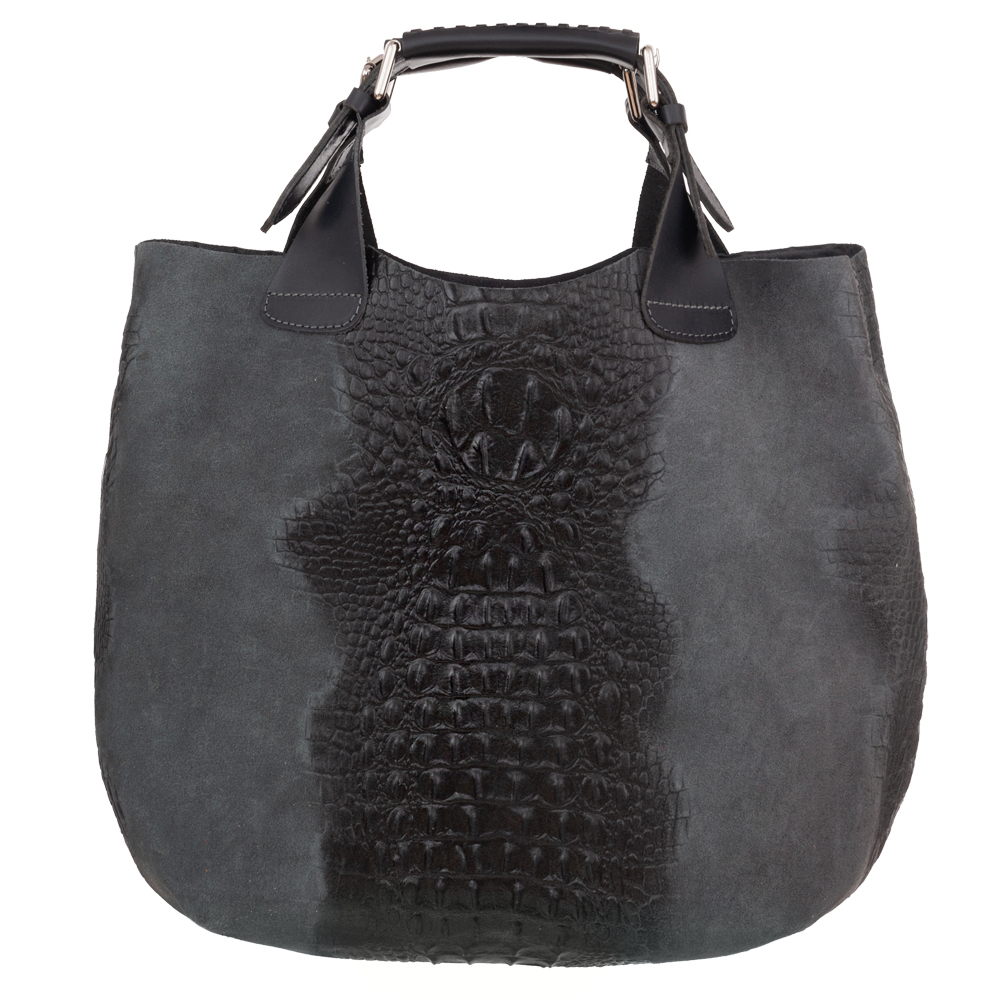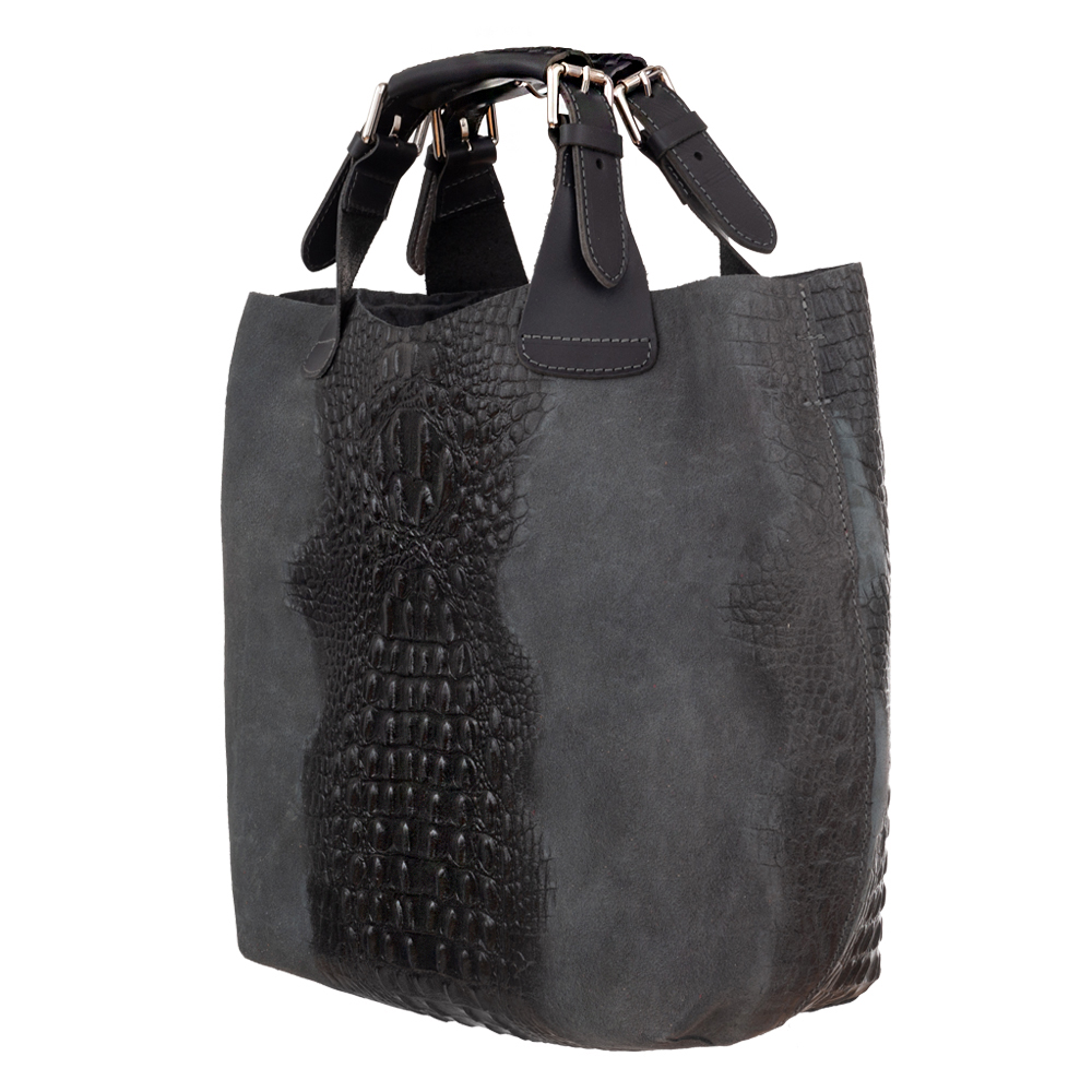 Włoska skórzana torebka shopper bag wykonana z wysokogatunkowej naturalnej gładkiej skóry licowej. Wygodny dostęp do środka. Torebka jednokomorowa przedzielona dużą kieszenią (wsadem) na suwak na całej szerokości torebki. Wkład w torebce wyciągany, dzięki czemu torebka robi się bardzo pojemna. Wewnątrz mała kieszonka na telefon. Torebka od środka wykończona surową skórą. Wkład wykonany z trwałej podszewki wykończonej skórą naturalną. Elementy wykończenia w kolorze srebrnym. Dodatkowy regulowany pasek o długości do 120 cm.