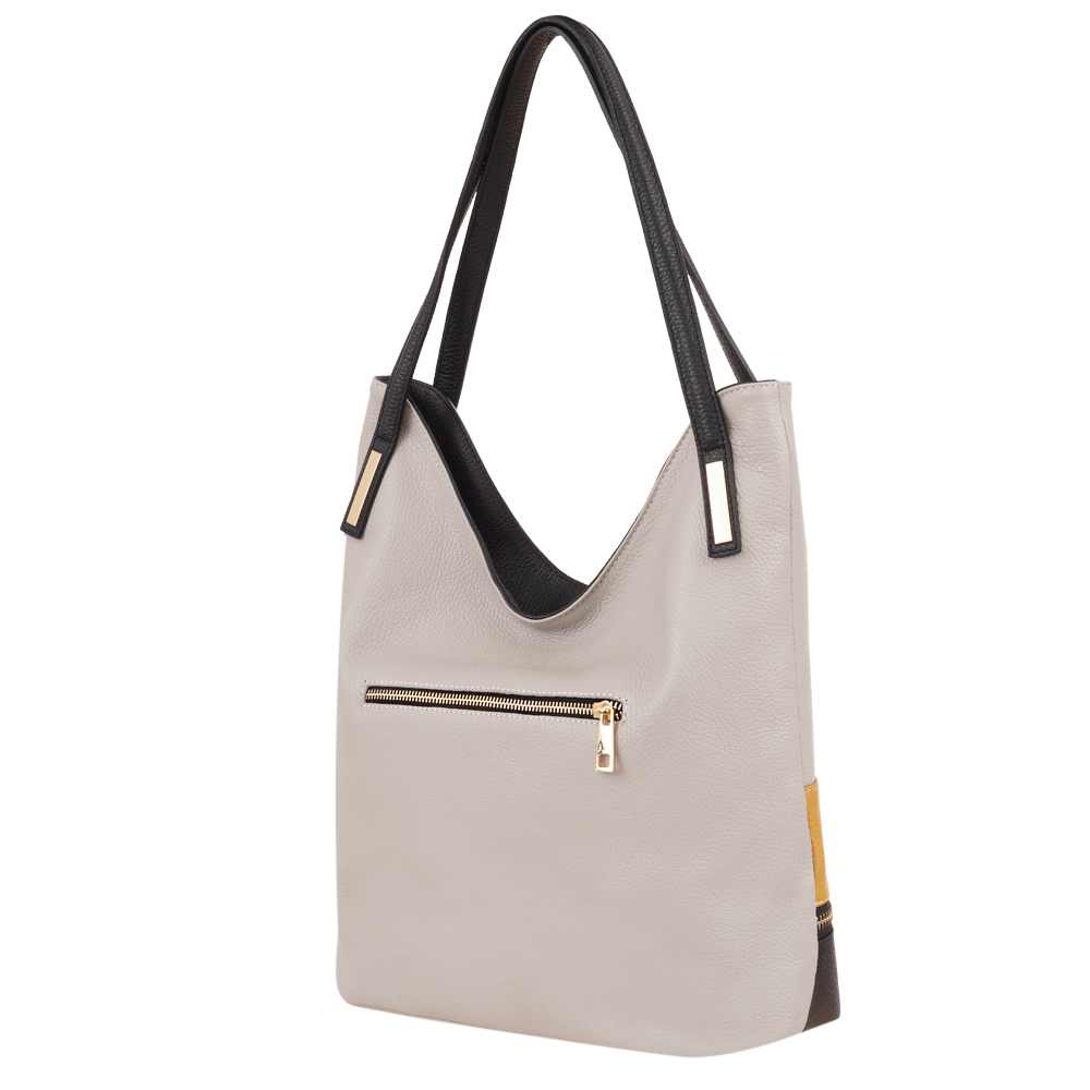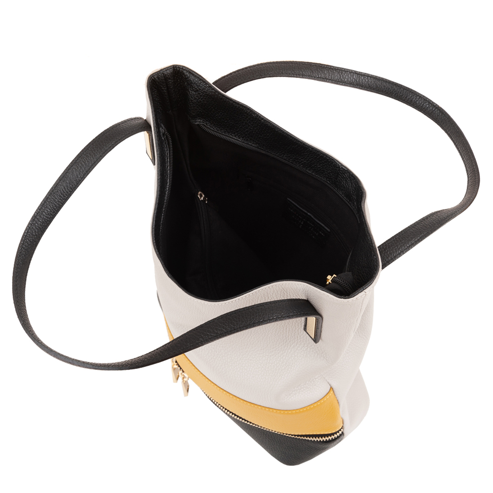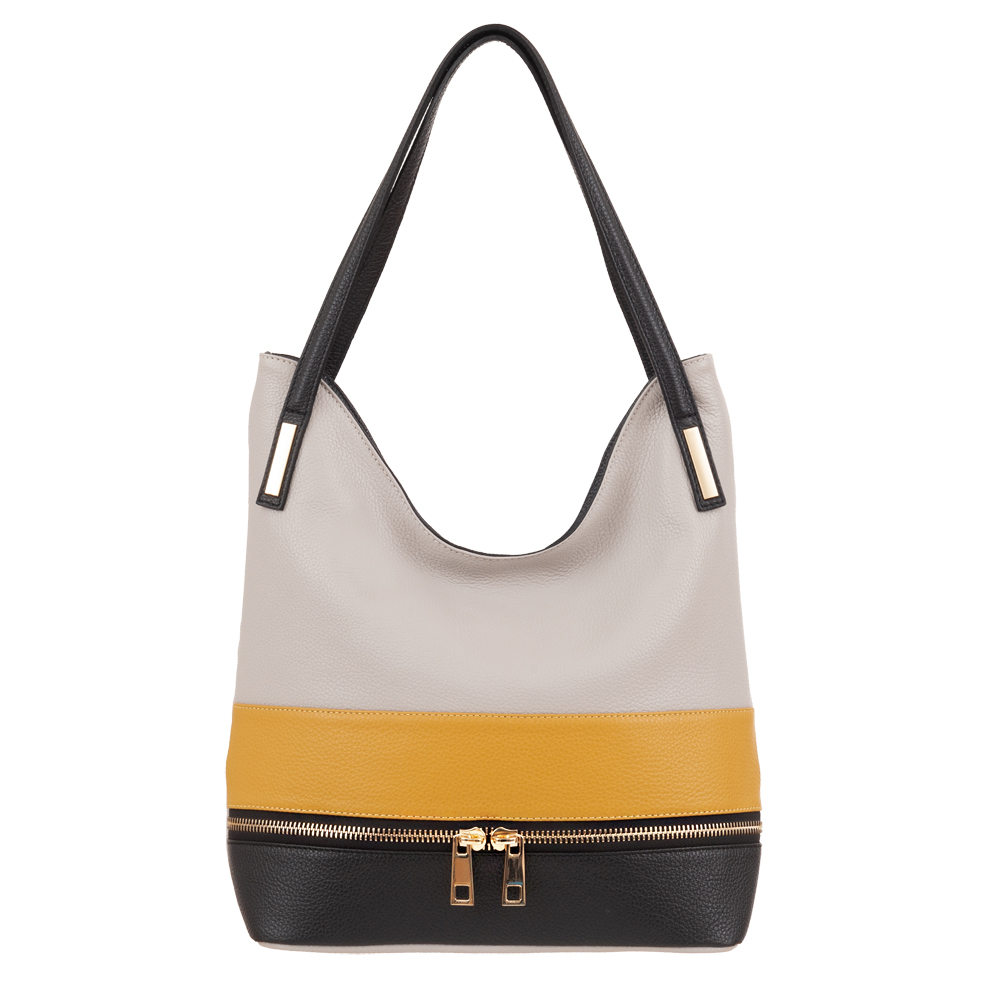 Włoska skórzana torebka / worek wykonana z wysokogatunkowej naturalnej skóry. Zamykana z góry na suwak. Modne połączenie kolorów. Torebka dwukomorowa przedzielona na środku dużą kieszenią na suwak + wewnątrz jedna kieszonka na zamek oraz jedna na telefon. Z tyłu torebki kieszeń na suwak + duża kieszonka z przodu na całej szerokośći. Wnętrze wykończone trwałą, materiałową podszewką. Elementy wykończenia w kolorze złotym. Dno usztywnione.