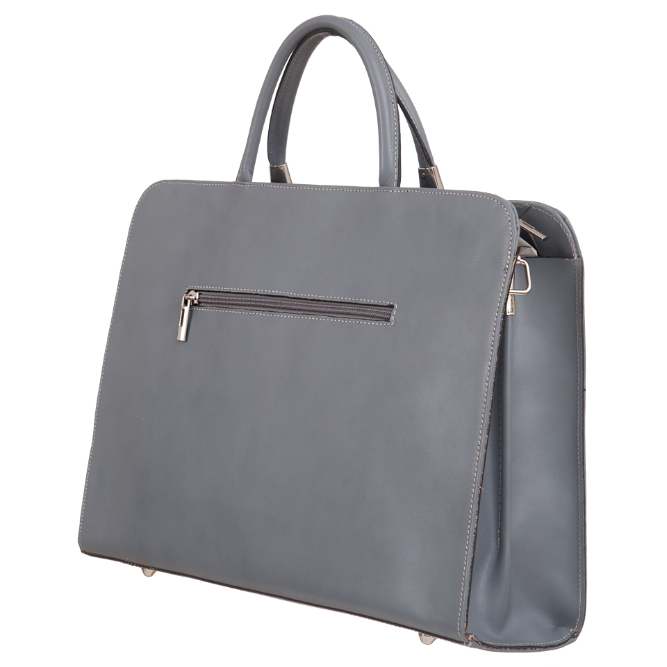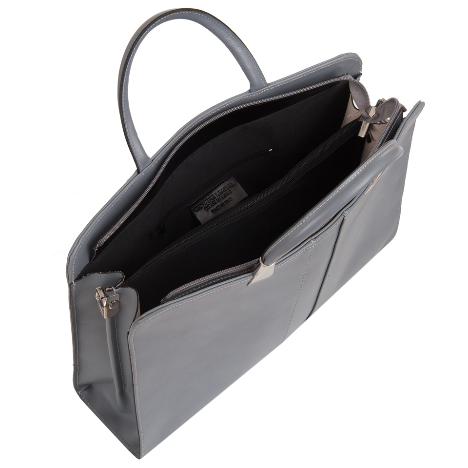 Włoska klasyczna A4 skórzana teczka / aktówka wykonana z wysokogatunkowej naturalnej gładkiej skóry licowej. Zamykana z góry na suwak. Teczka dwukomorowa przedzieloną dużą kieszenią na suwak na całej szerokości. Wewnątrz jedna kieszonka na zamek, jedna na telefon. Wnętrze wykończone trwałą, ciemną podszewką. Teczka od spodu usztywniona oraz podbita ćwiekami, co chroni ją przeciw uszkodzeniom. Elementy wykończenia w kolorze srebrnym. Dodatkowy długi, regulowany pasek na ramię o długości 54 - 104 cm.