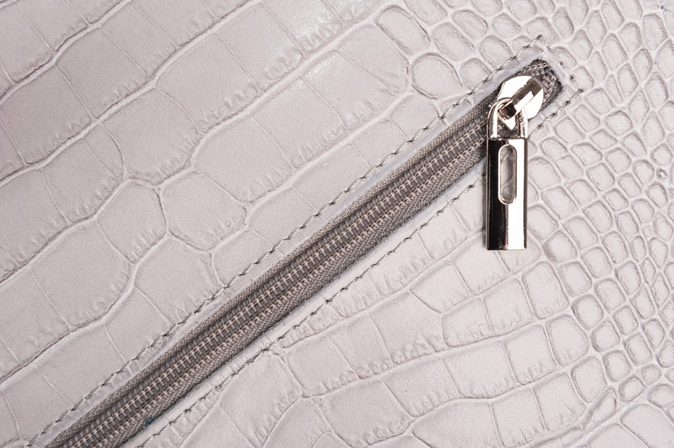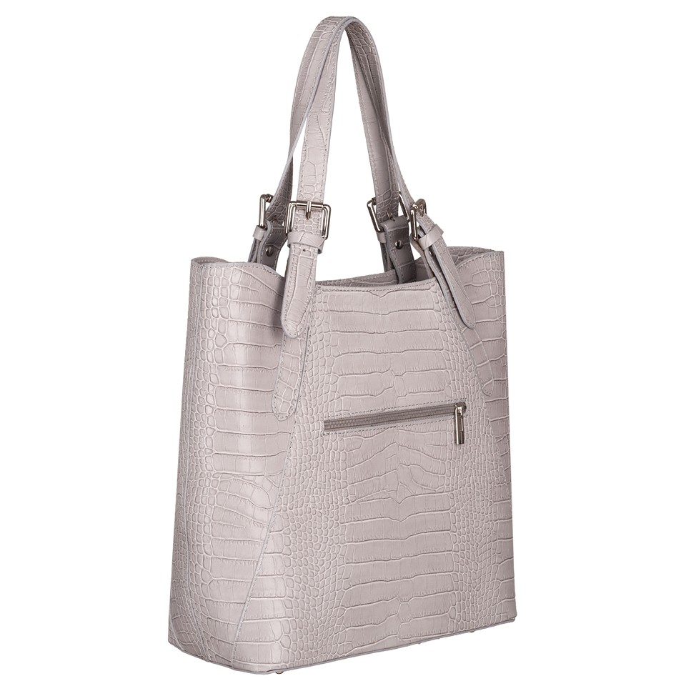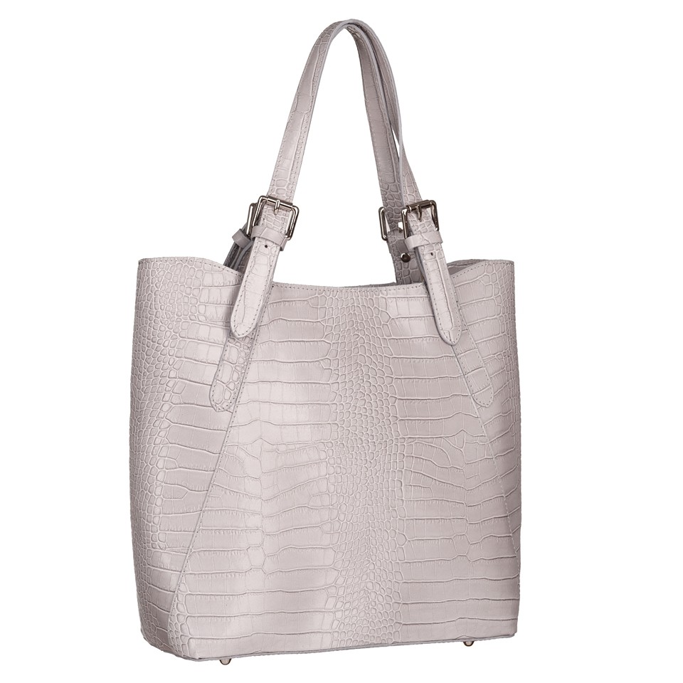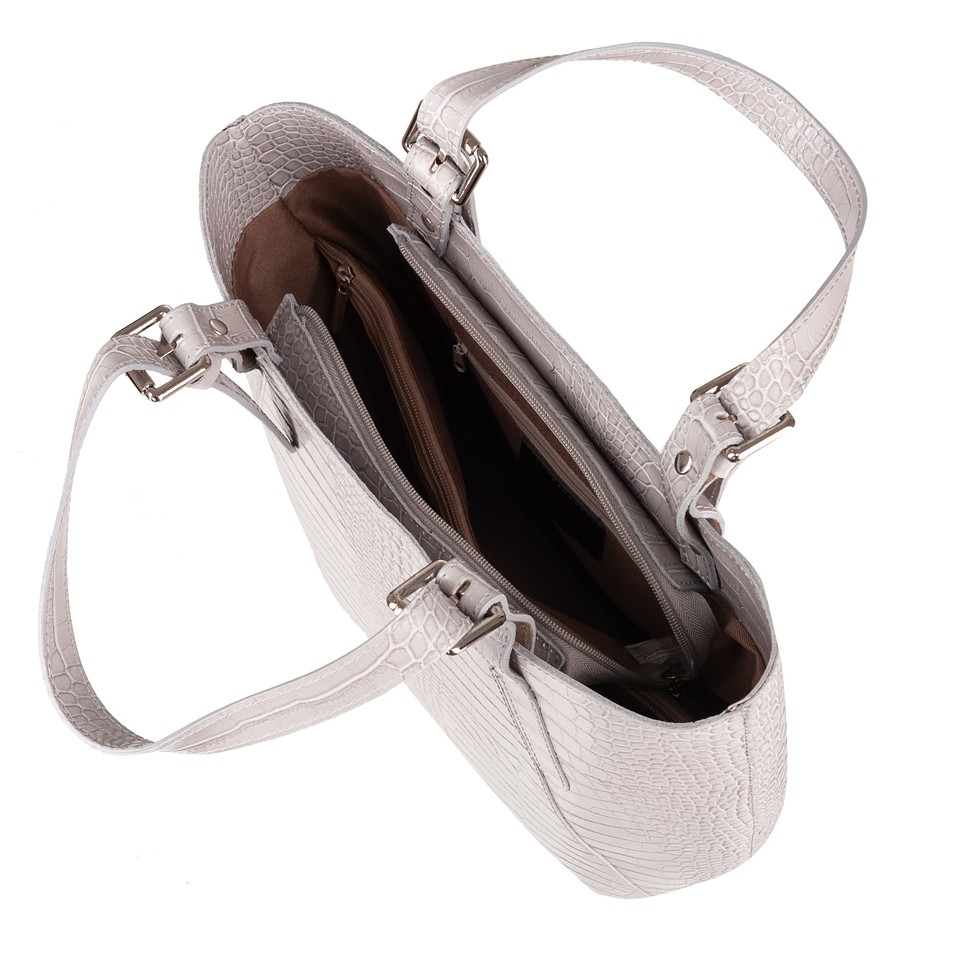 VERA PELLE włoska modna skórzana A4 torebka wykonana z wysokogatunkowej naturalnej skóry z motywem wężowym, łuski krokodyla. Wygodny dostęp do środka. Torebka dwukomorowa, od góry zamykana na suwak. Wewnątrz kieszonka na telefon + kieszonka na zamek + duża kieszeń na środku dzieląca torebkę na 2 komory. Torebka od środka wykończona porządną, materiałową podszewką. Elementy wykończenia w kolorze srebrnym. Z tyłu kieszeń na suwak. Uszy z możliwością regulacji długości. Dno usztywnione i podbite nóżkami, aby nie niszczył się spód.