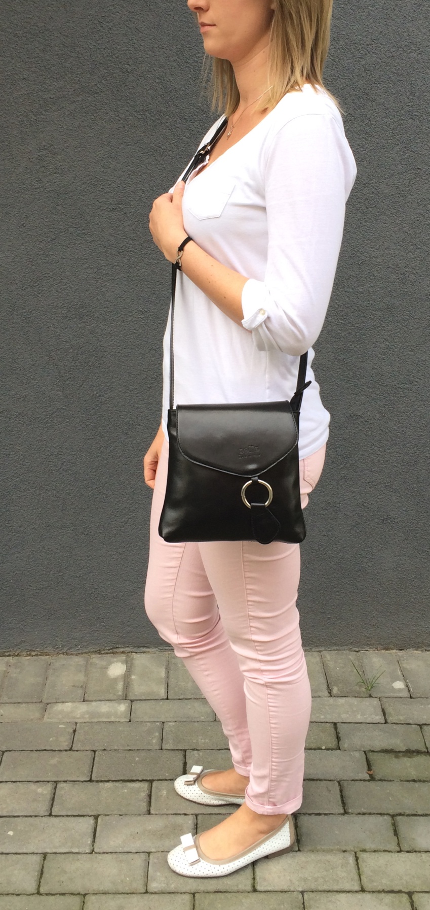 Włoska skórzana listonoszka wykonana z wysokogatunkowej naturalnej gładkiej skóry licowej firmy Pelle. Zamykana z góry na suwak + klapka na magnes. Torebka jednokomorowa, wewnątrz jedna kieszonka na zamek oraz jedna na telefon + kieszonka z przodu torebki pod klapką. Wnętrze wykończone trwałą podszewką. Z tyłu kieszonka na suwak. Długi, regulowany pasek umożliwia wygodne noszenie na ramieniu.