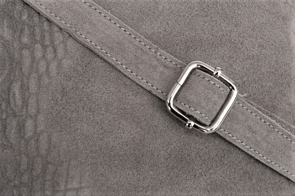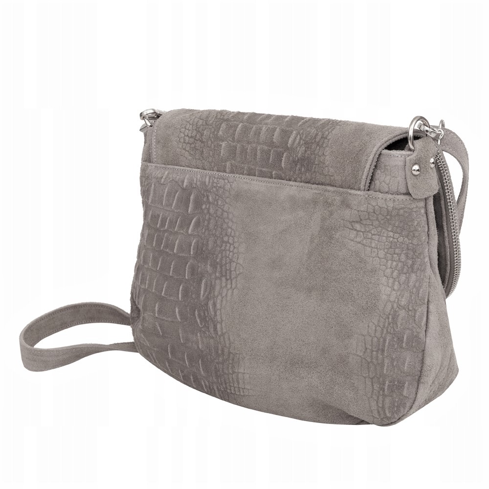 Vera Pelle - Włoska pojemna, modna skórzana listonoszka wykonana z wysokogatunkowej naturalnej skóry z motywem łuski krokodyla łączonej z gładkim zamszem naturalnym. Zamykana na dużą klapę na magnes + suwak. Torebka jednokomorowa, wewnątrz jedna kieszonka na zamek. Wnętrze wykończone trwałą, materiałową podszewką w kolorze czarnym. Długi, regulowany pasek umożliwia wygodne noszenie na ramieniu. Dodatkowa kieszeń w klapie torebki na suwak. Elementy wykończenia w kolorze srebrnym.