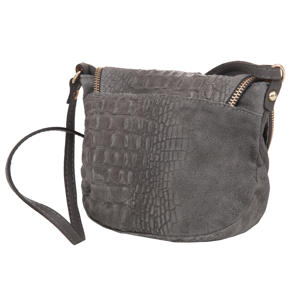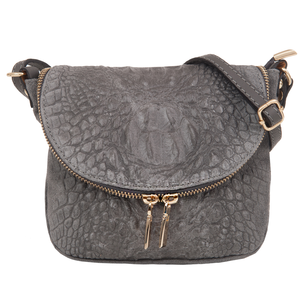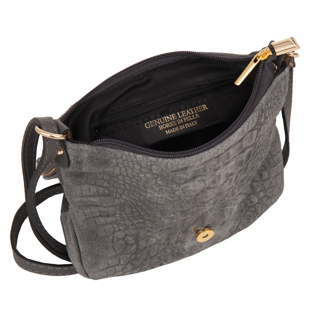 Włoska skórzana listonoszka wykonana z wysokogatunkowej naturalnej skóry z motywem krokodyla łączonej z zamszem naturalnym. Zamykana na dużą klapę na magnes + suwak. Torebka jednokomorowa, wewnątrz jedna kieszonka na zamek. Wnętrze wykończone trwałą podszewką. Długi, regulowany pasek umożliwia wygodne noszenie na ramieniu. Dodatkowa kieszeń w klapie torebki na suwak. Elementy wykończenia w kolorze złotym.